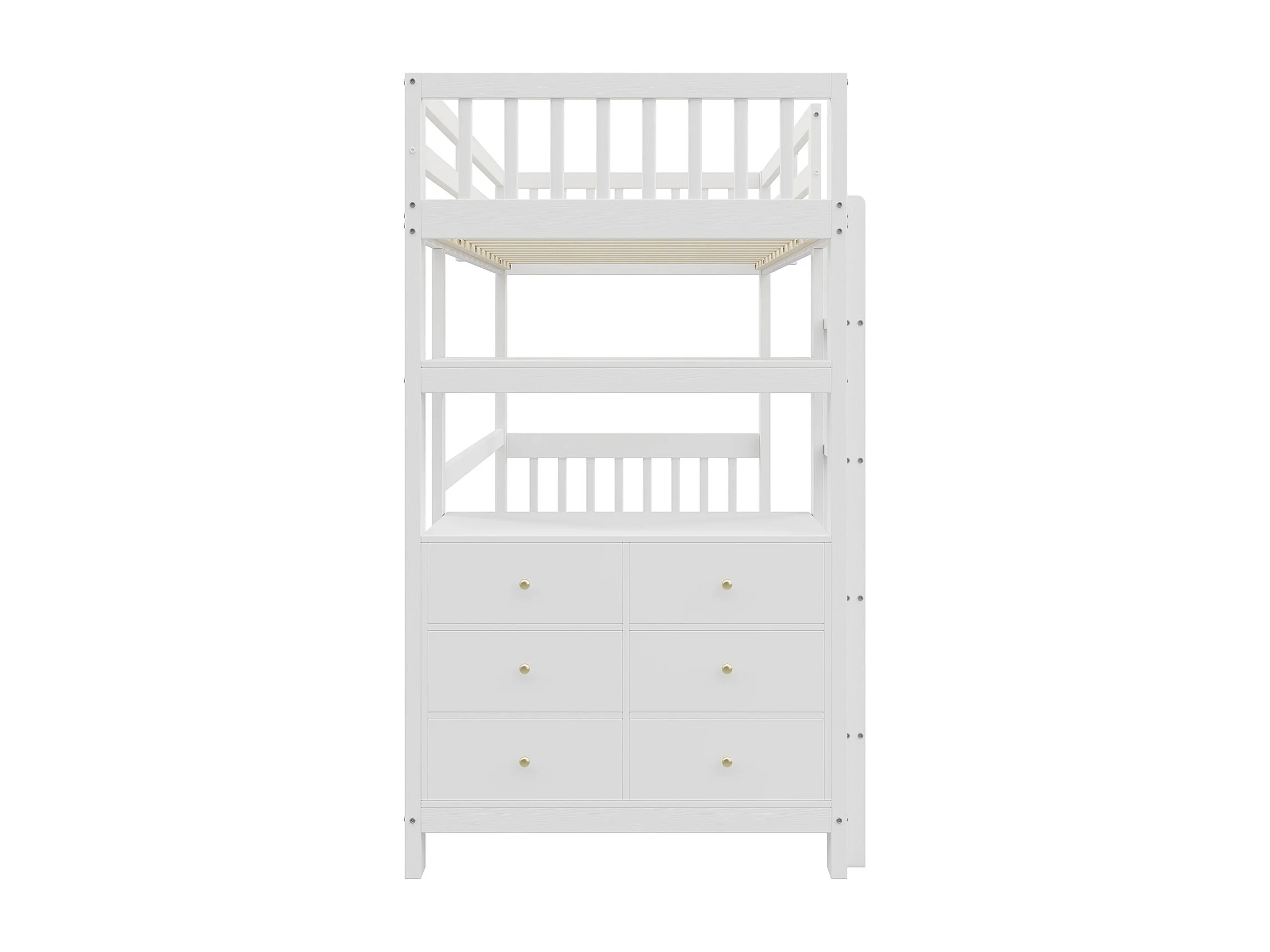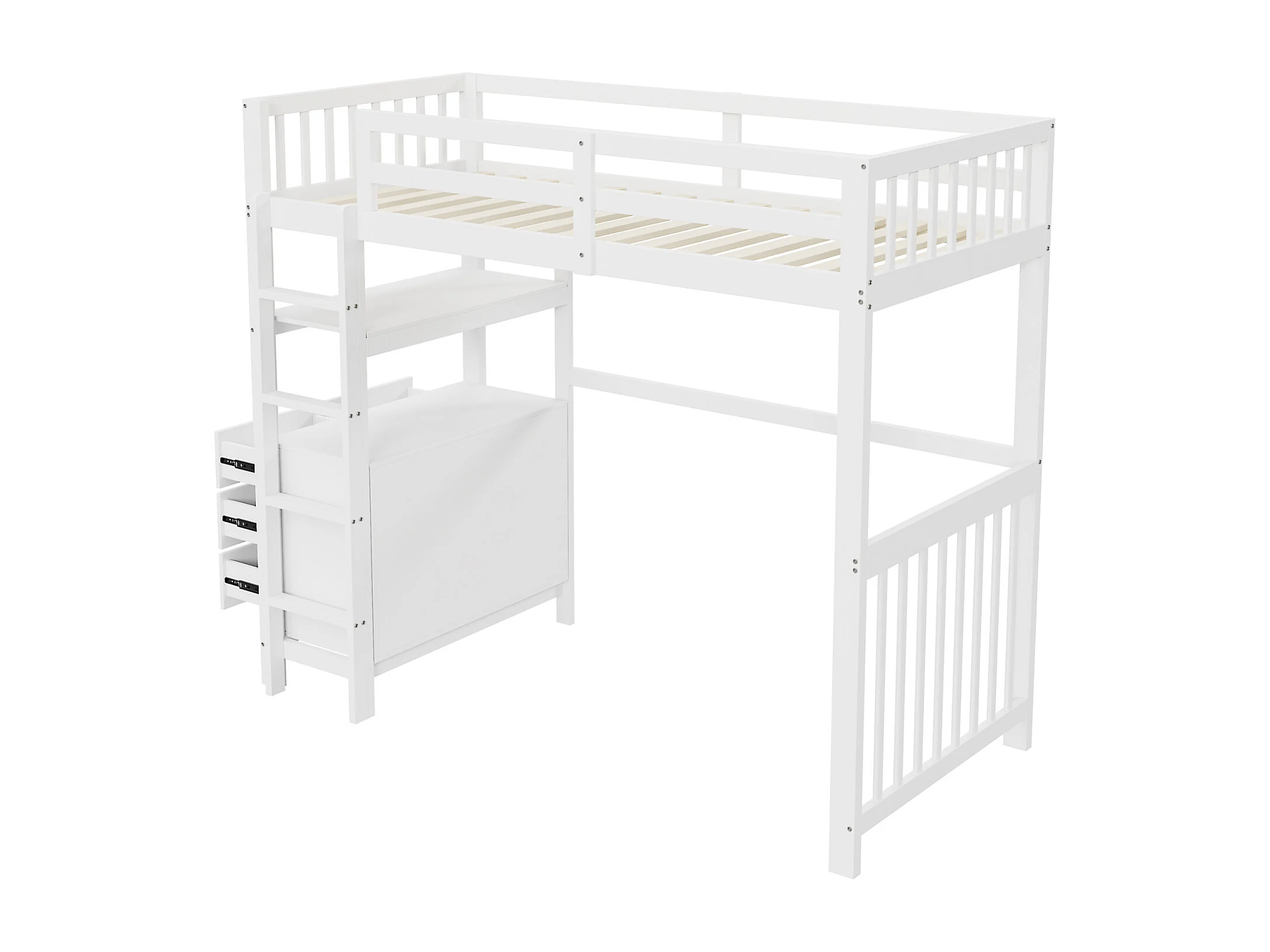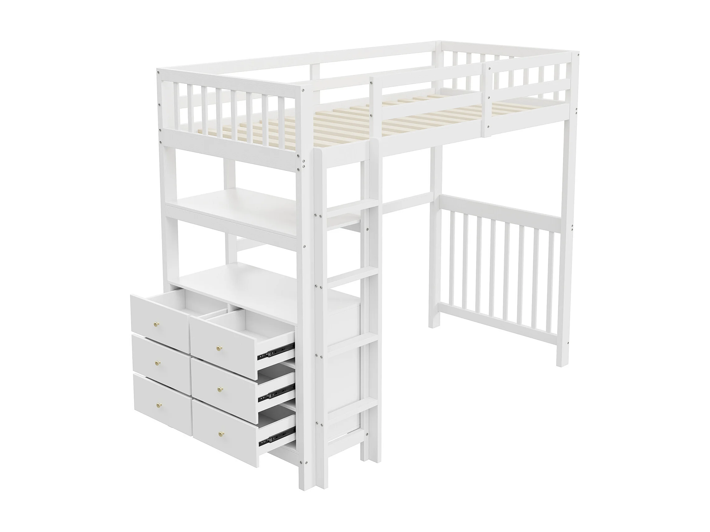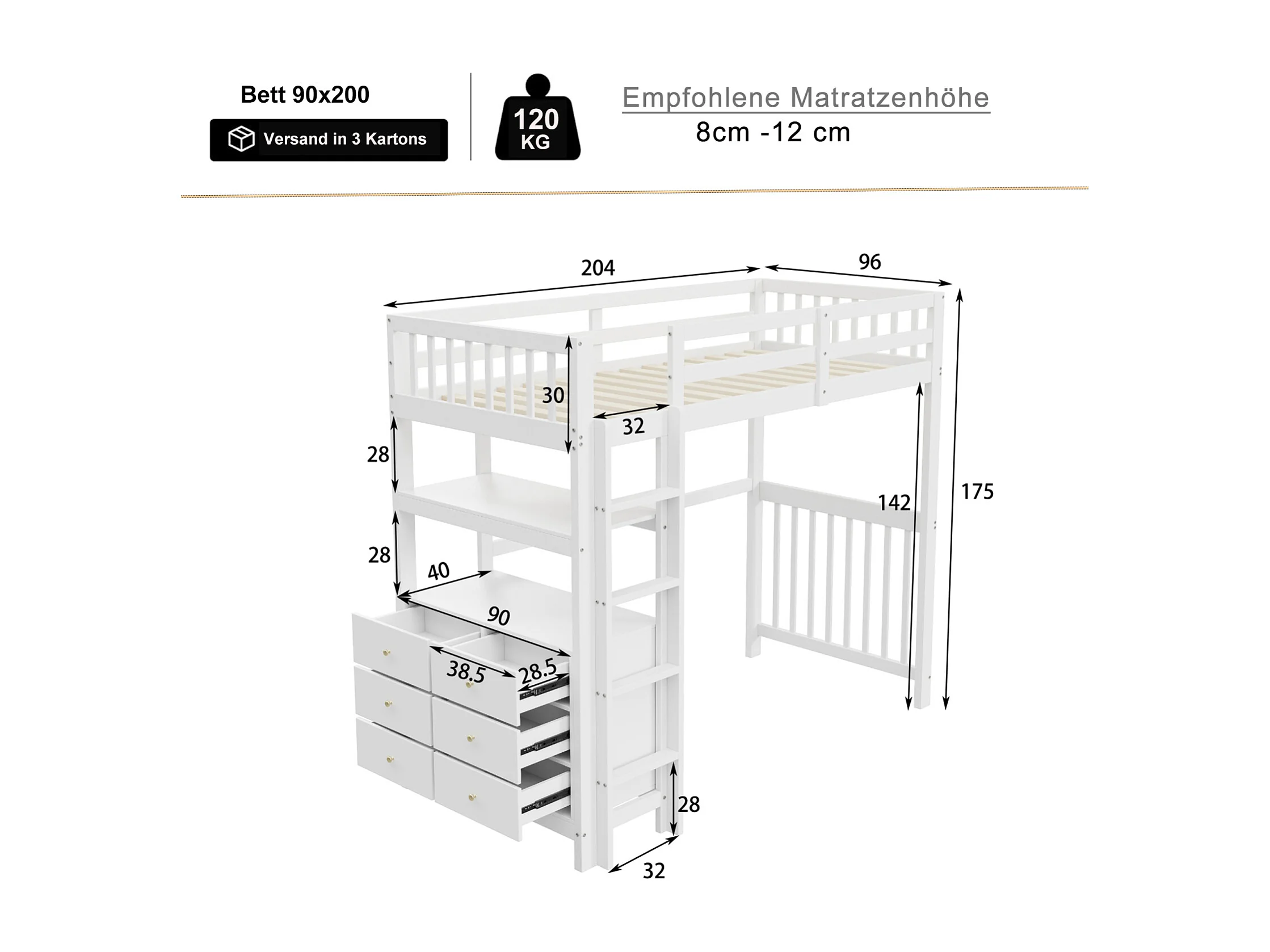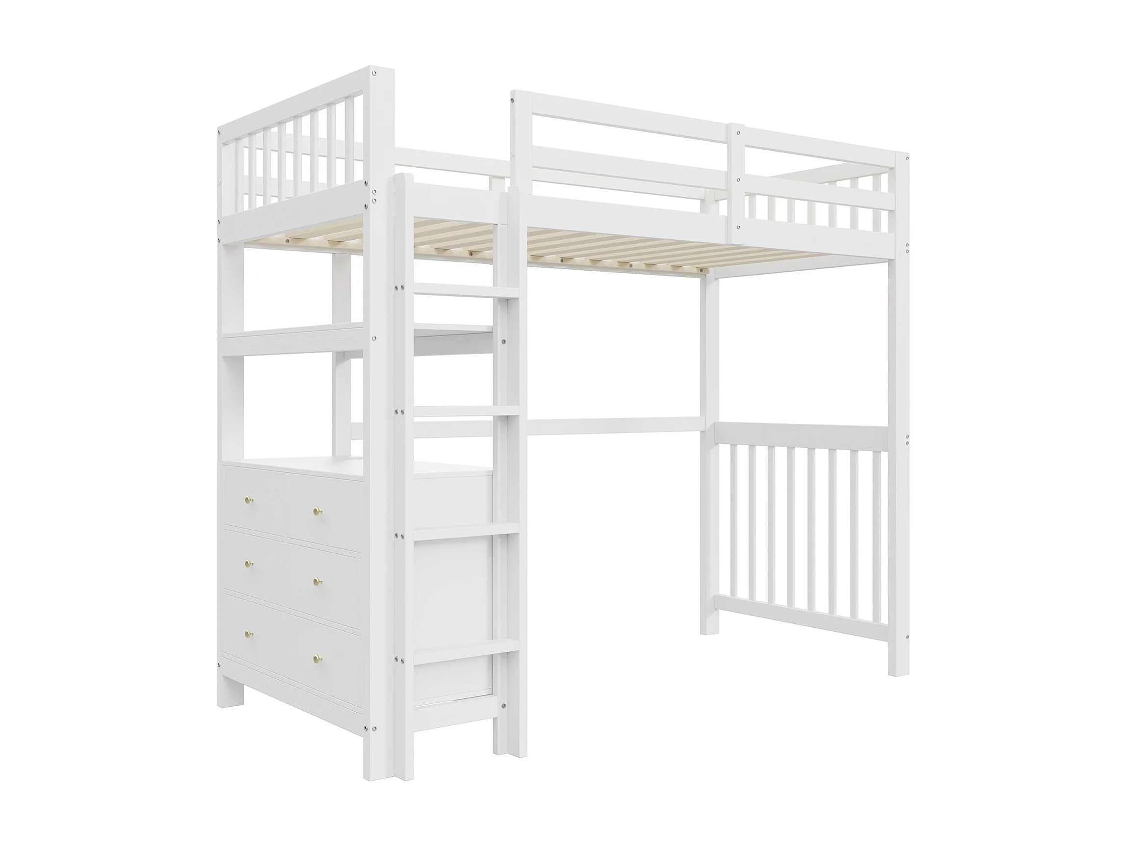 Lit mezzanine 90x200cm - lit enfant avec échelle, tiroirs et étagères, sommier à lattes, clôture haute - en bois de pin - Blanc