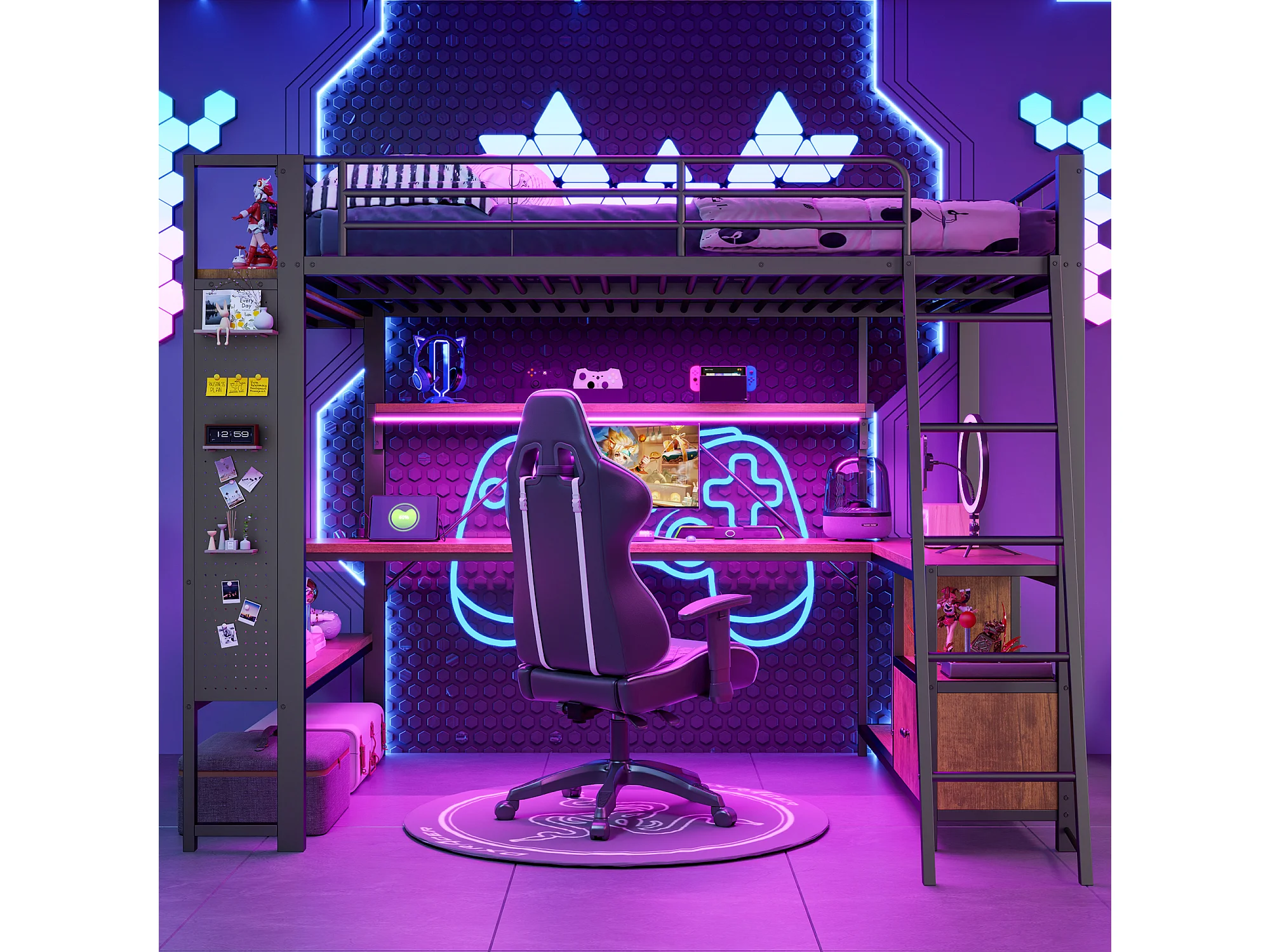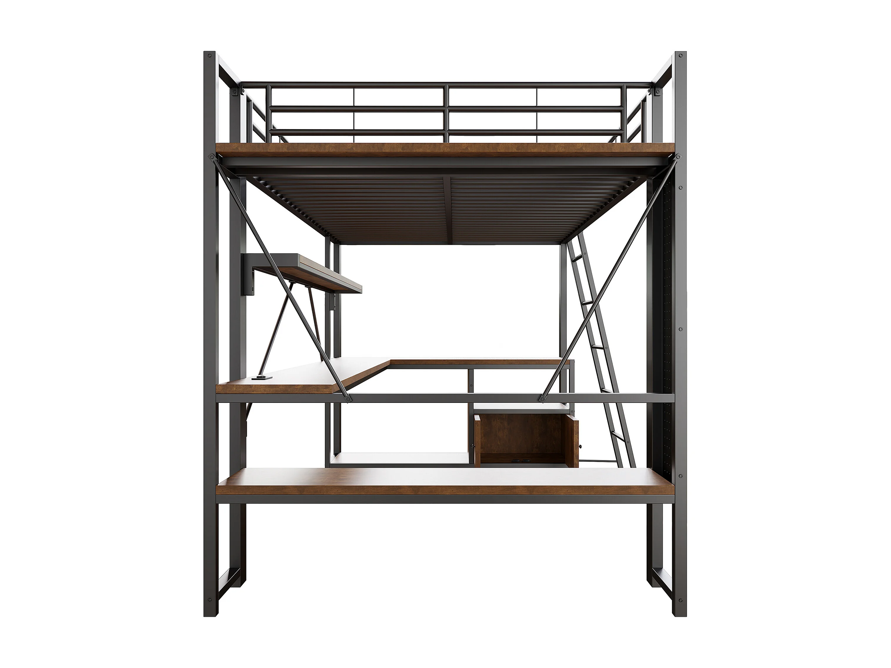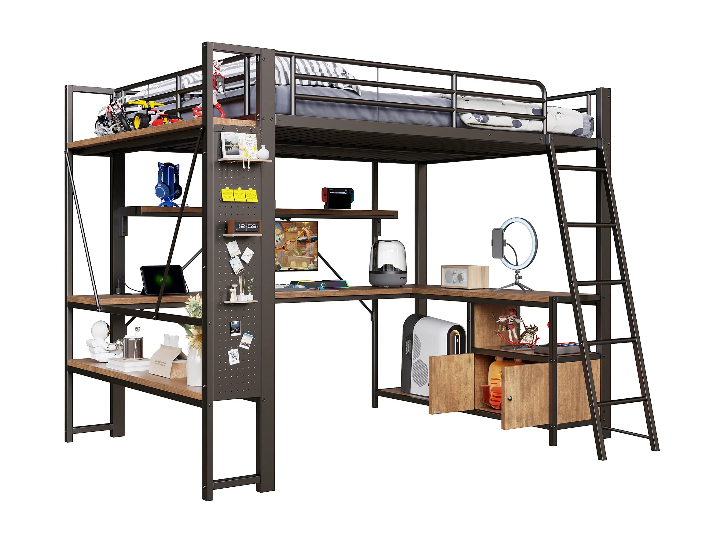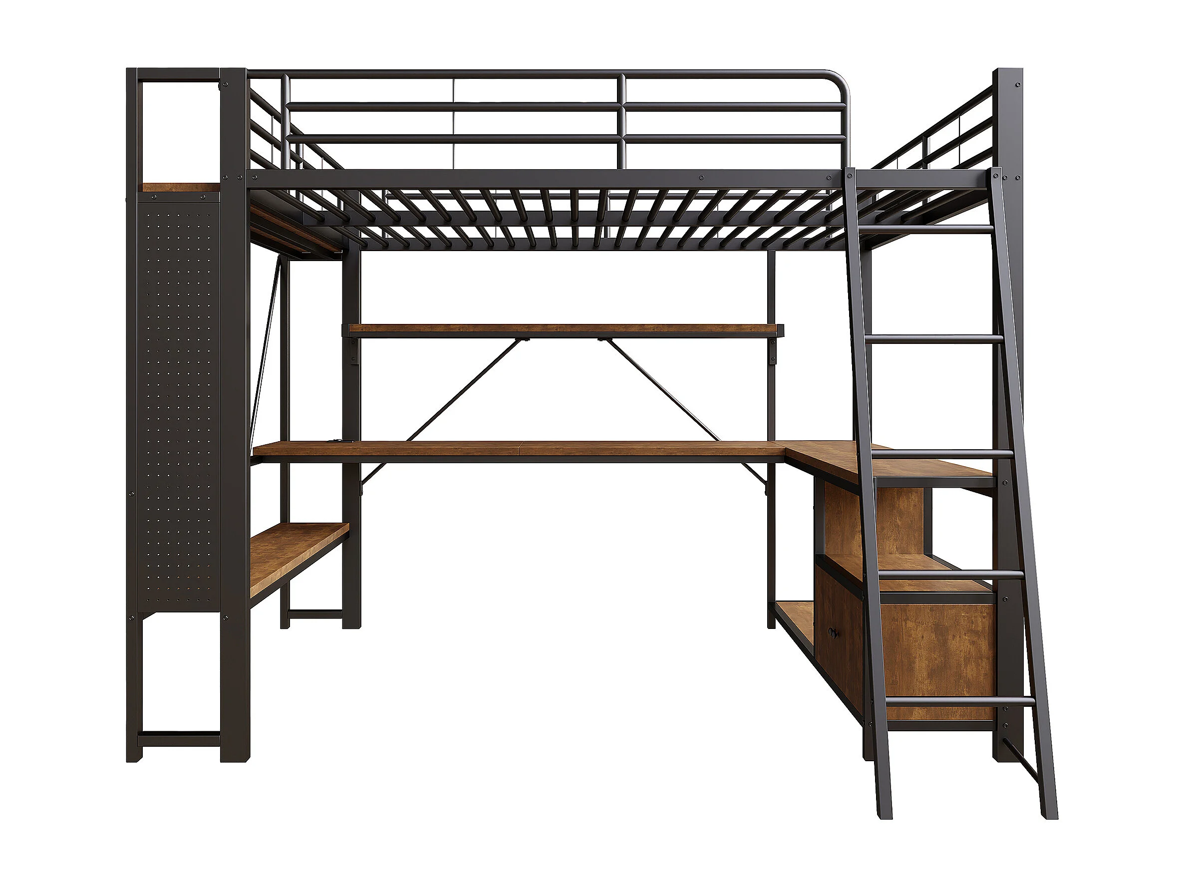 Lit mezzanine adulte 140x200 cm métal noir avec bureau, étagères , LED et USB