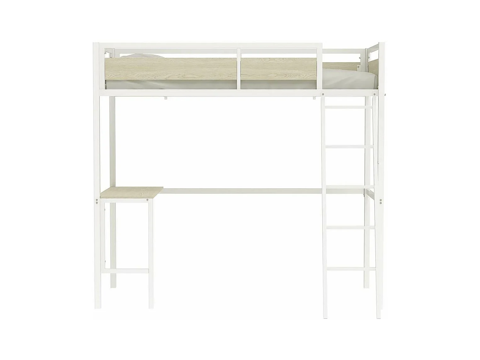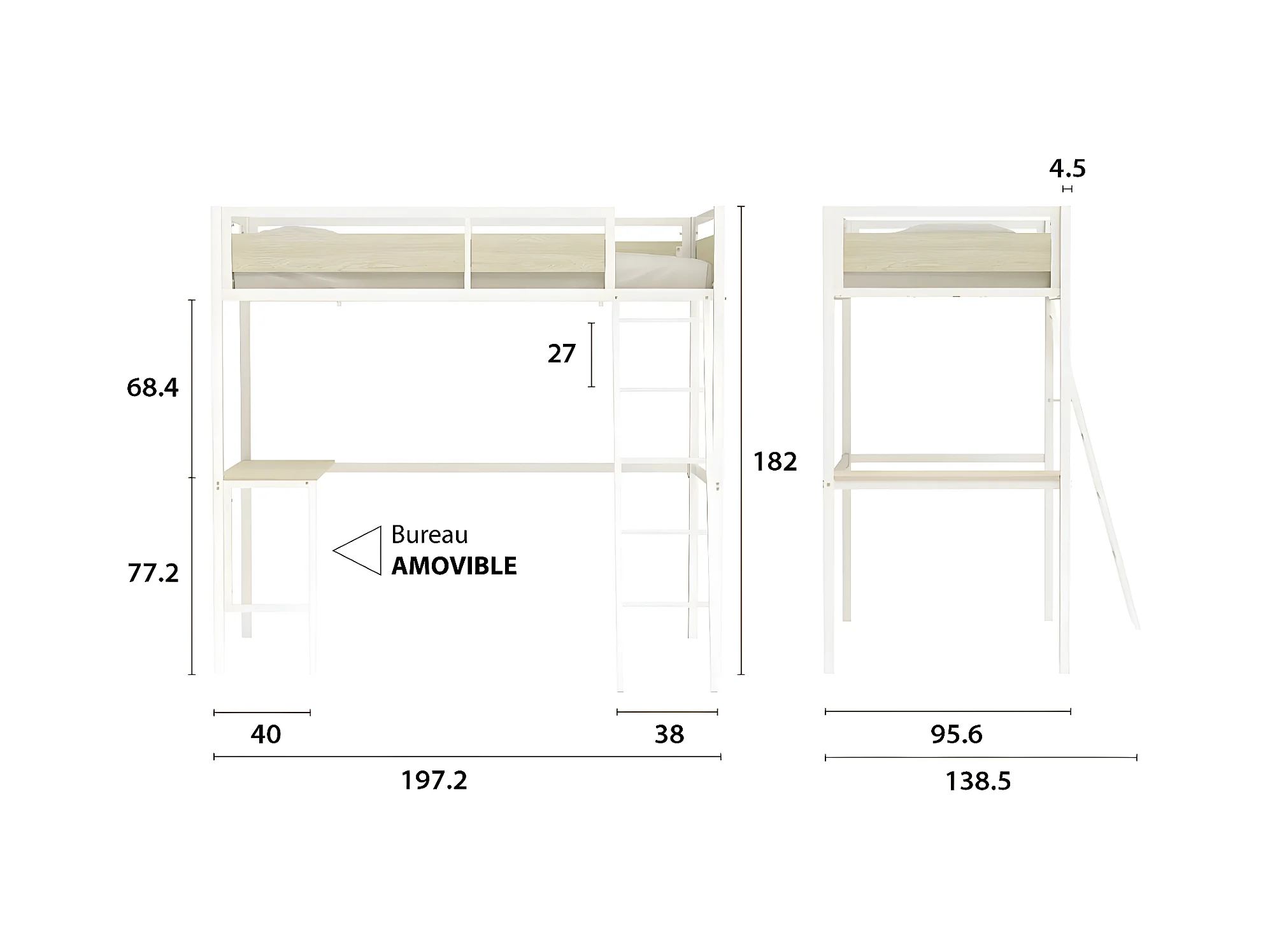 Lit mezzanine avec sommier et bureau en métal finition epoxy blanche et mélamine imitation chêne - couchage 90 x 190 cm - DINO