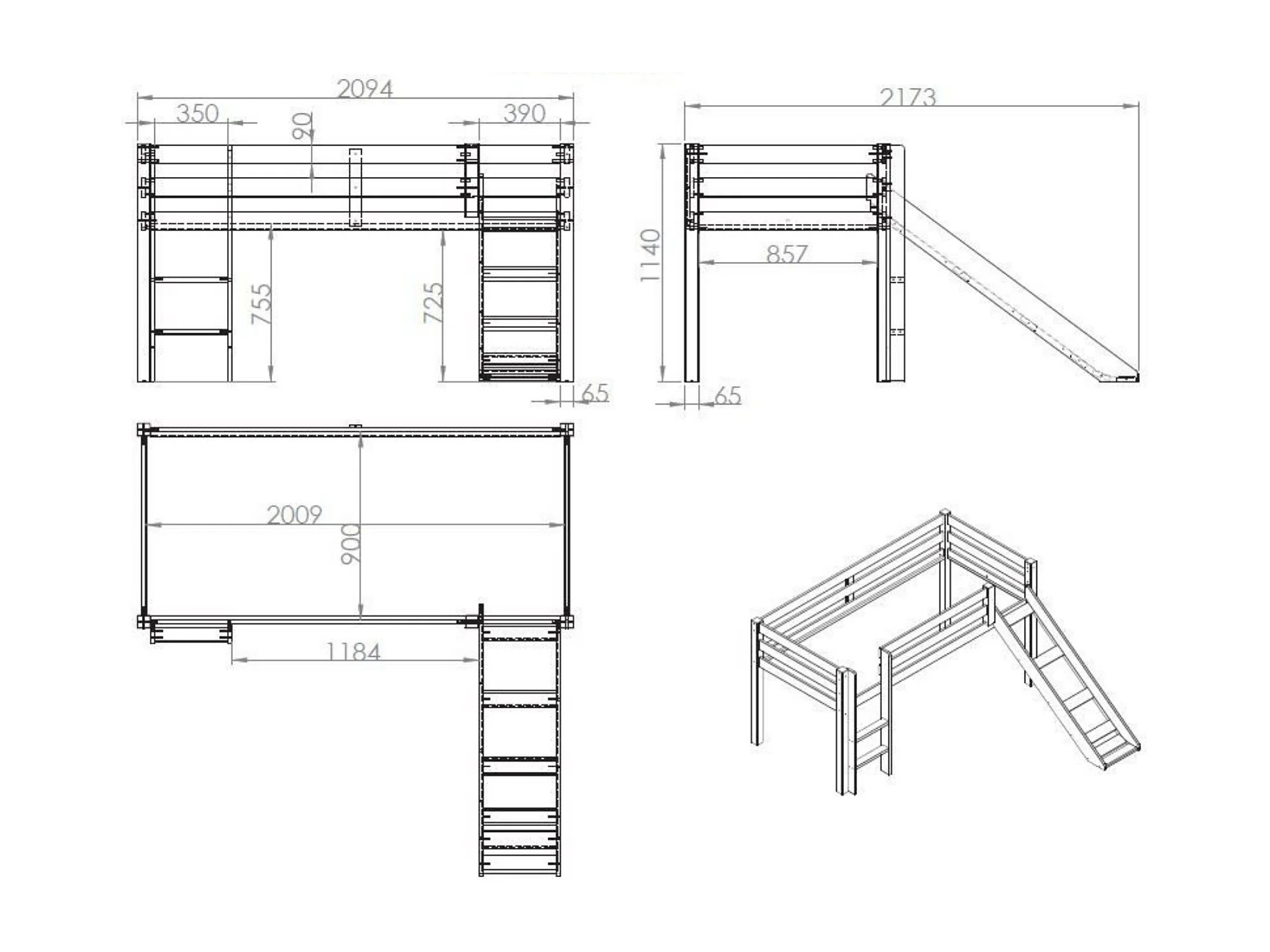 Lit Mezzanine Blanc avec Toboggan 90x200