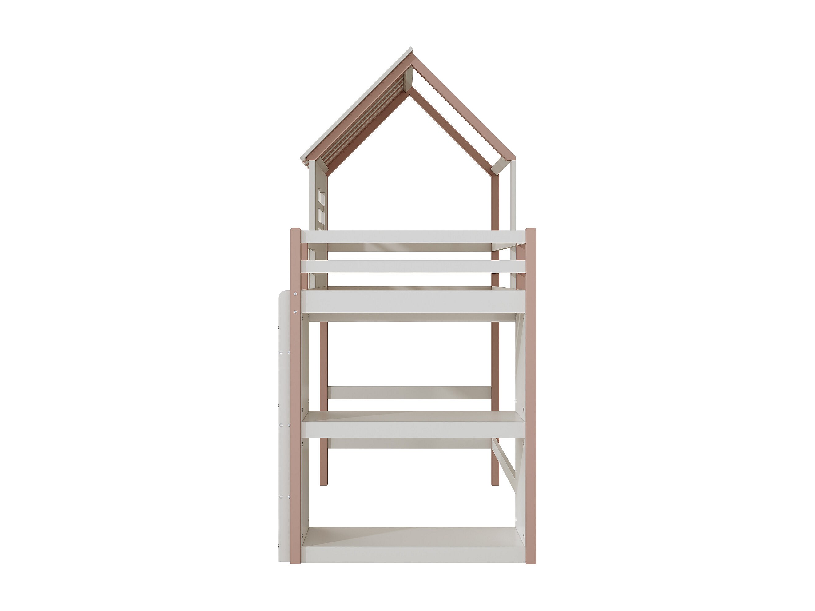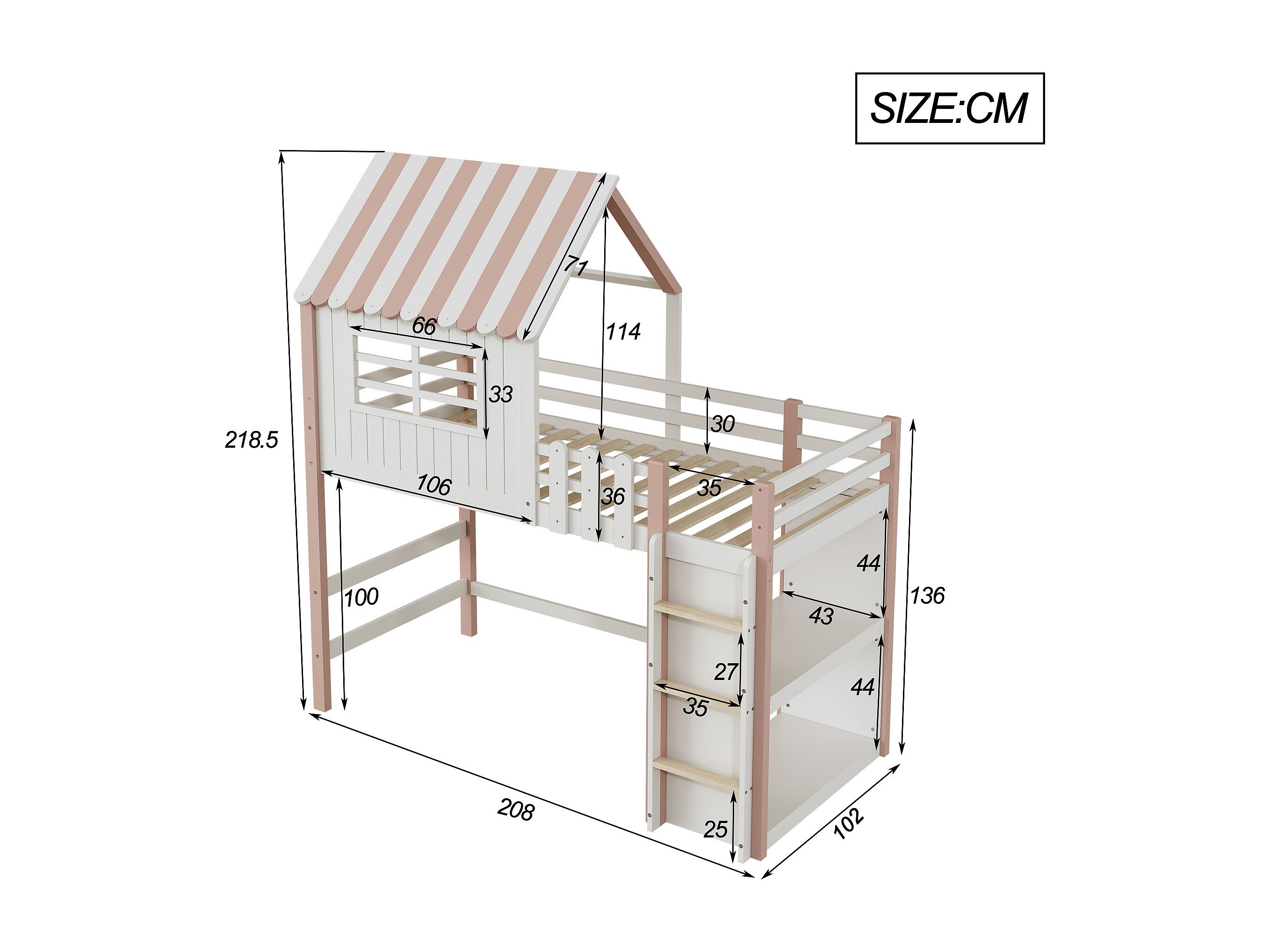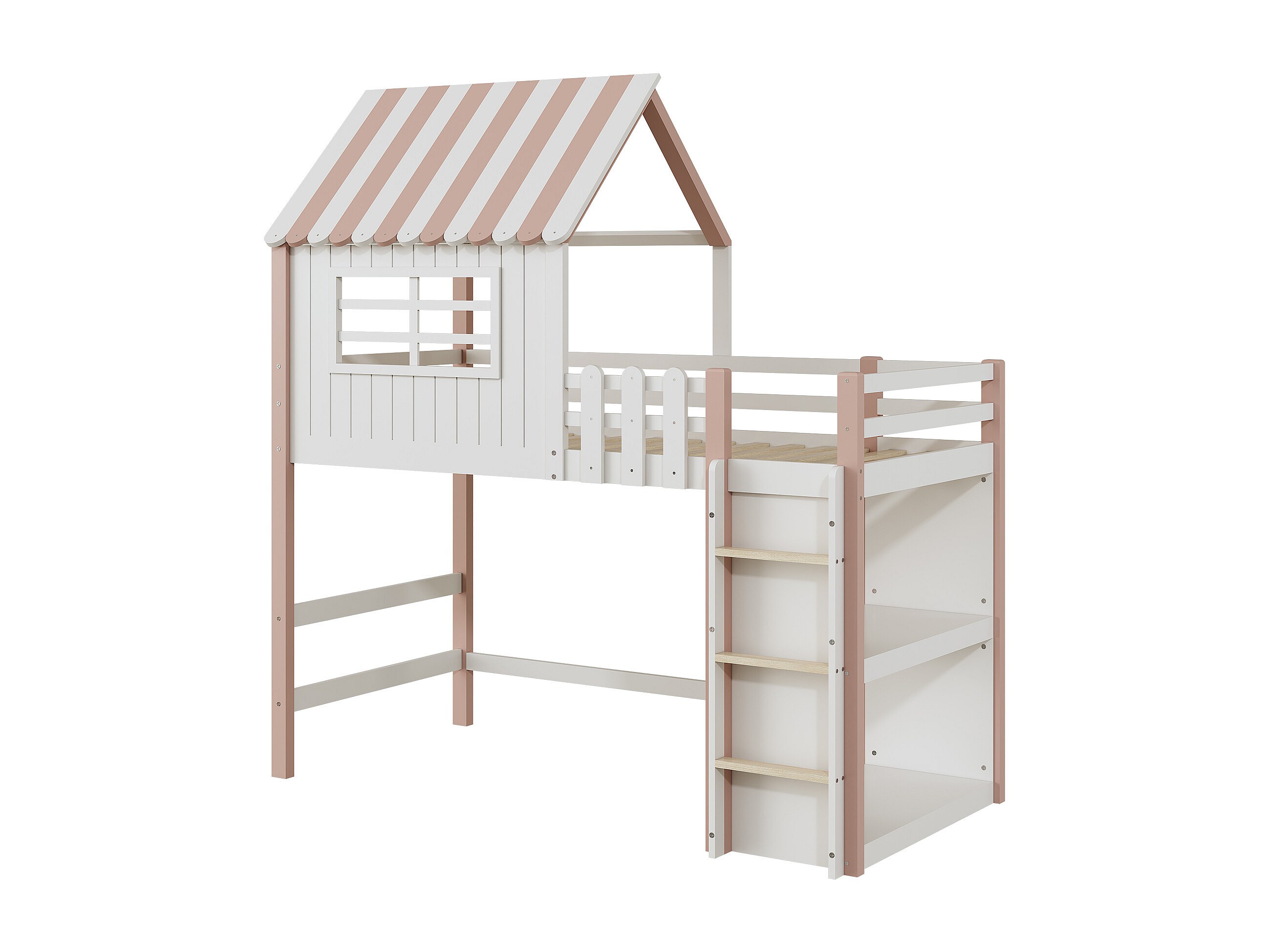 Lit mezzanine cabane enfant blanc et rose 90x200cm avec échelle, fenêtre et étagère de rangement, sans matelas