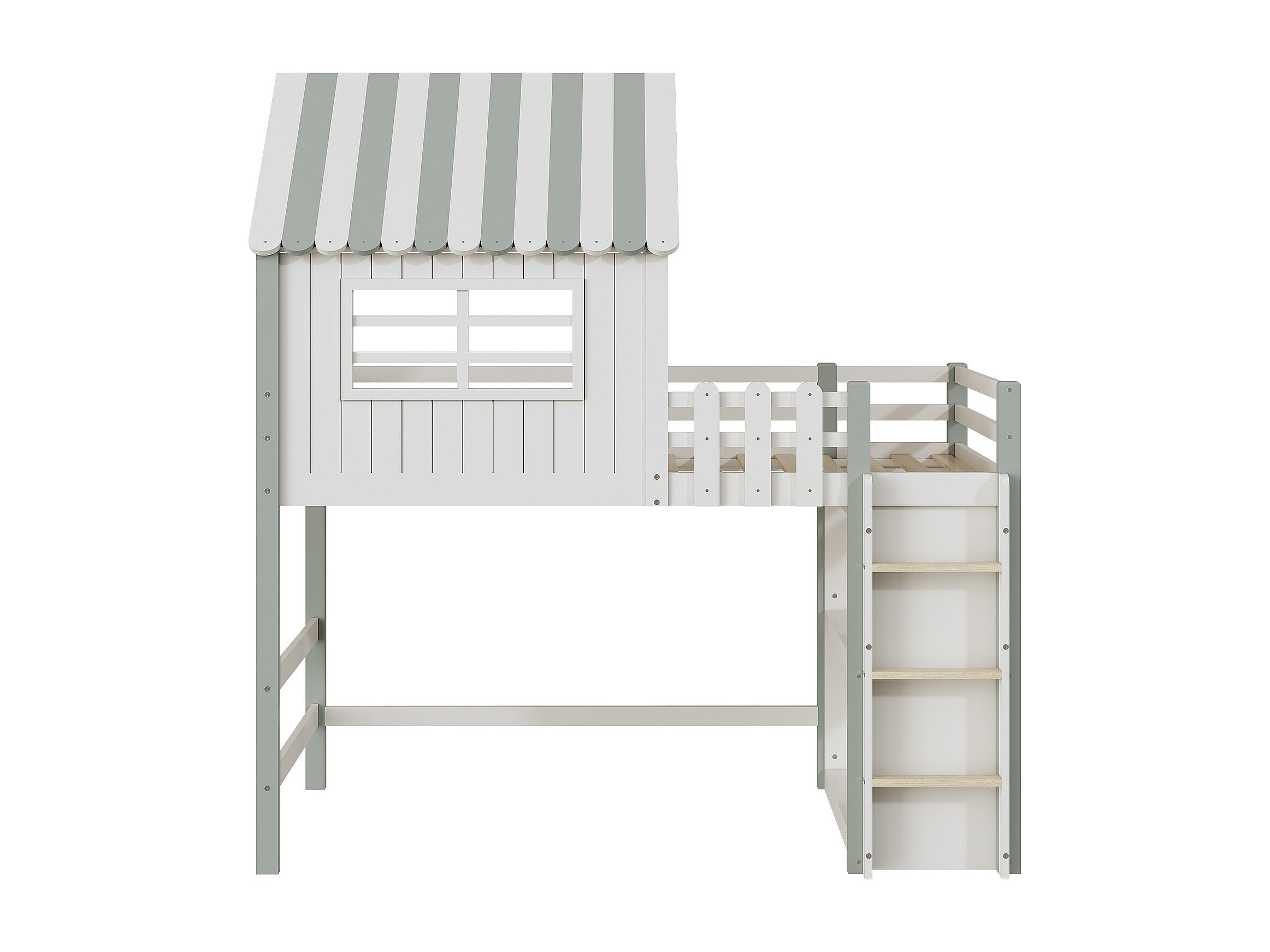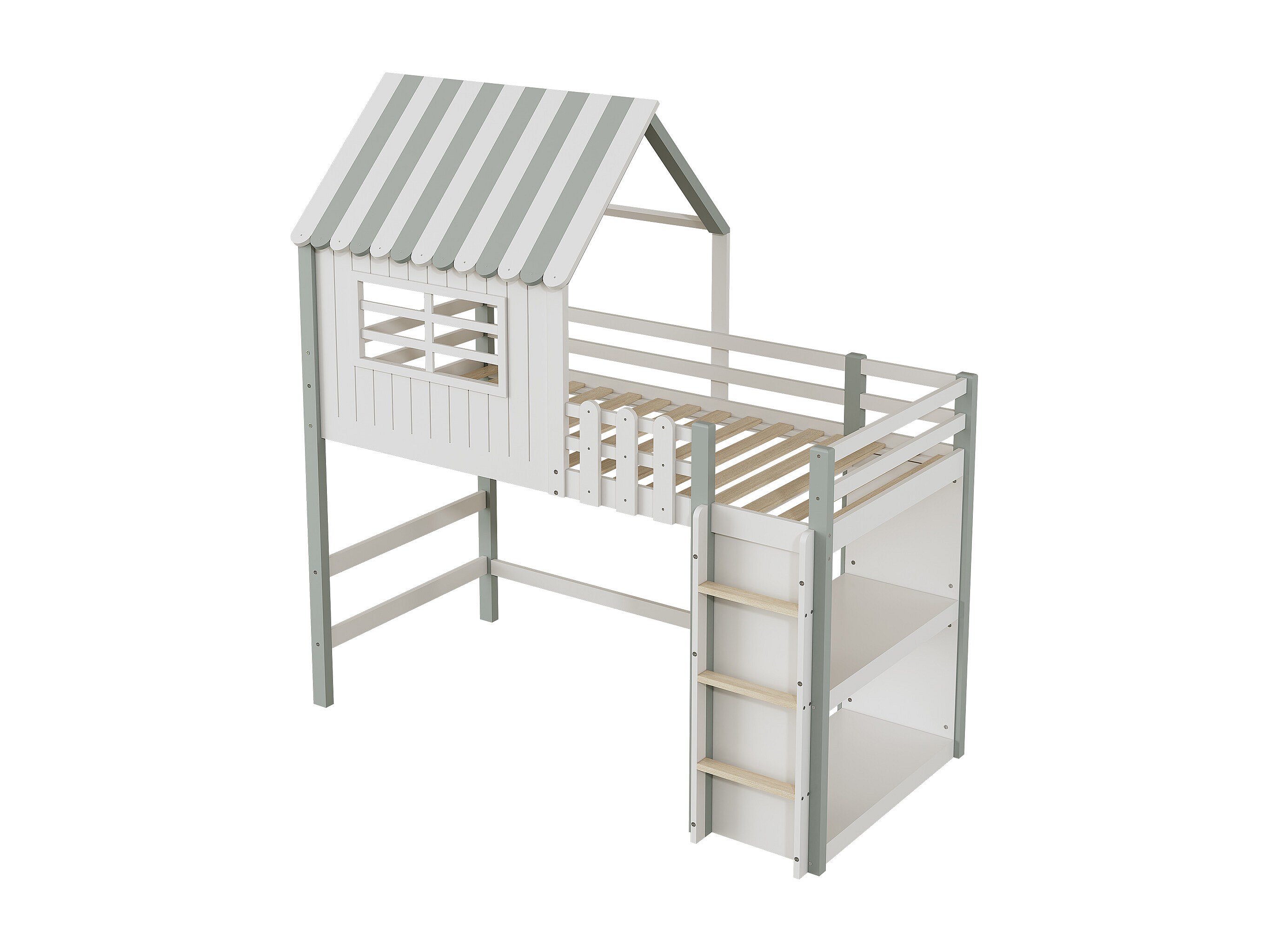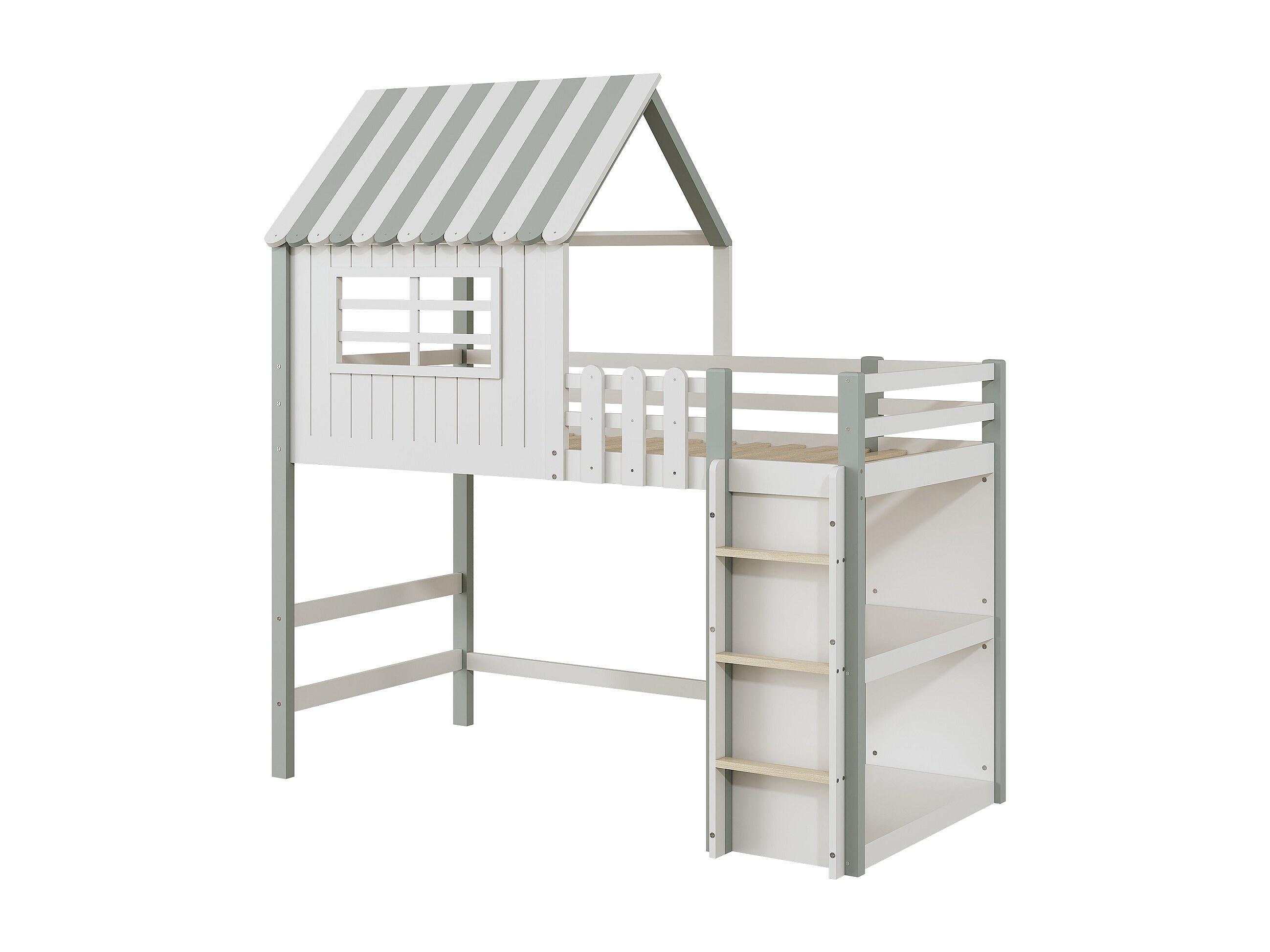 Lit mezzanine cabane enfant blanc et vert 90x200cm avec échelle, fenêtre et étagère de rangement, sans matelas