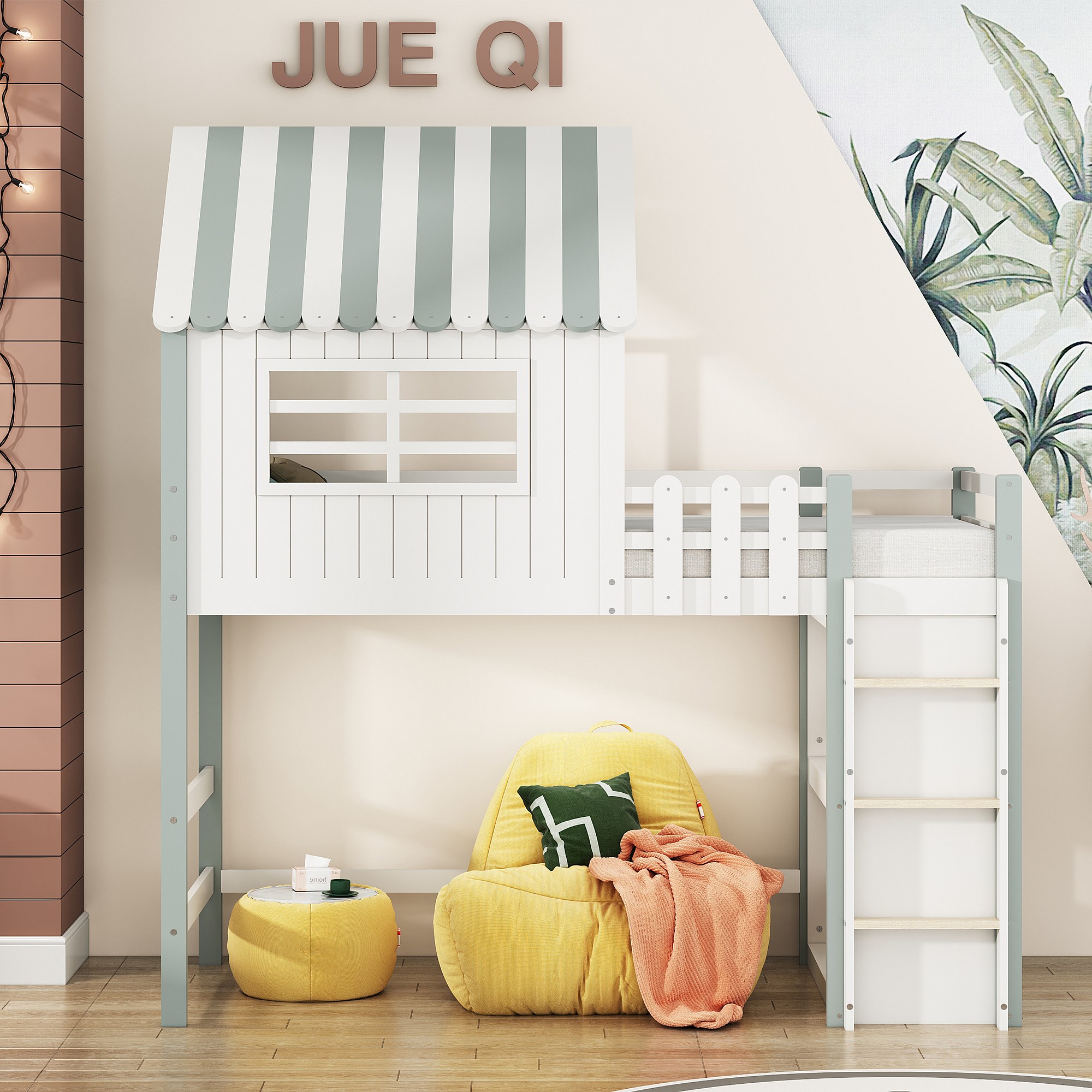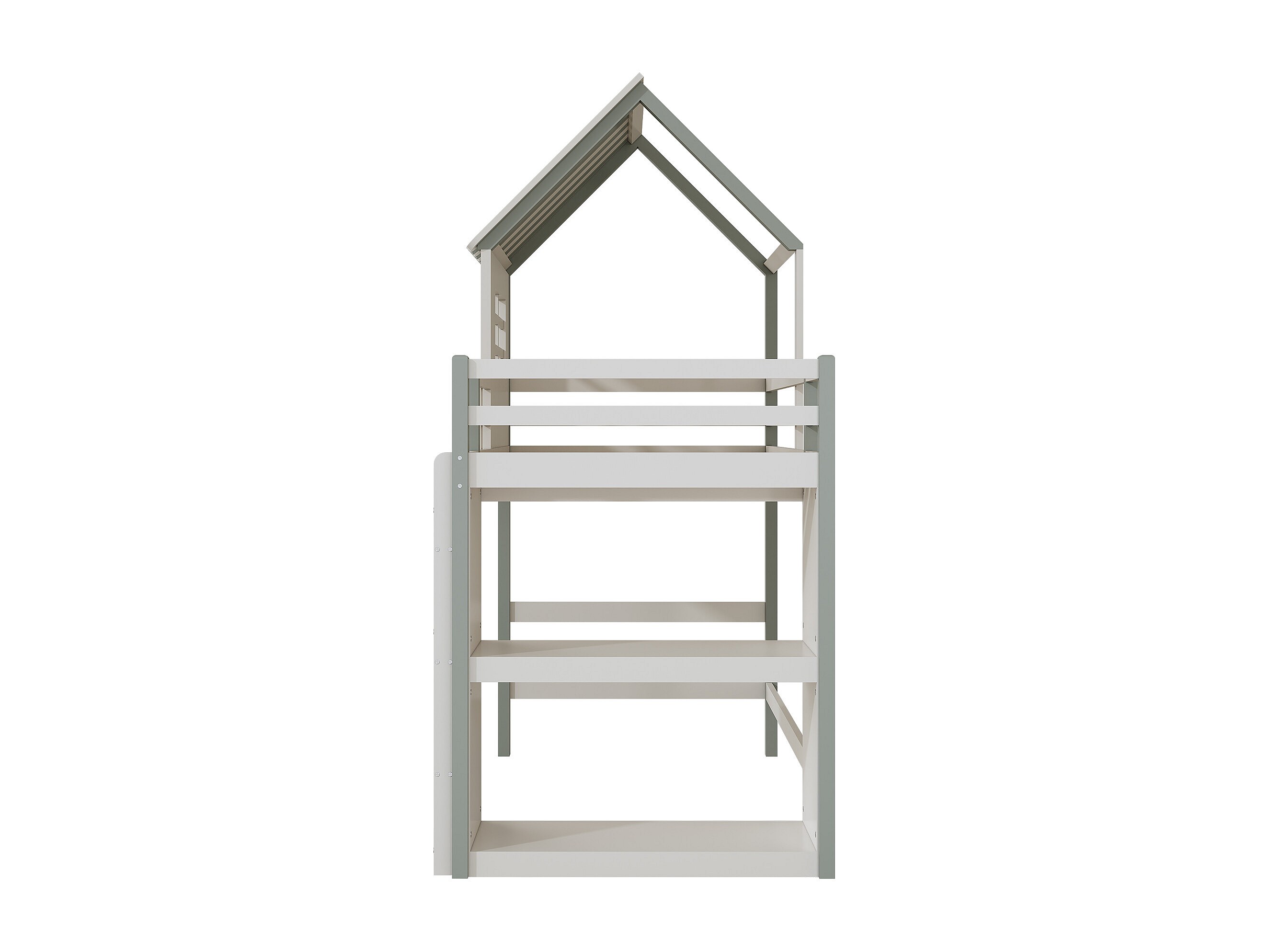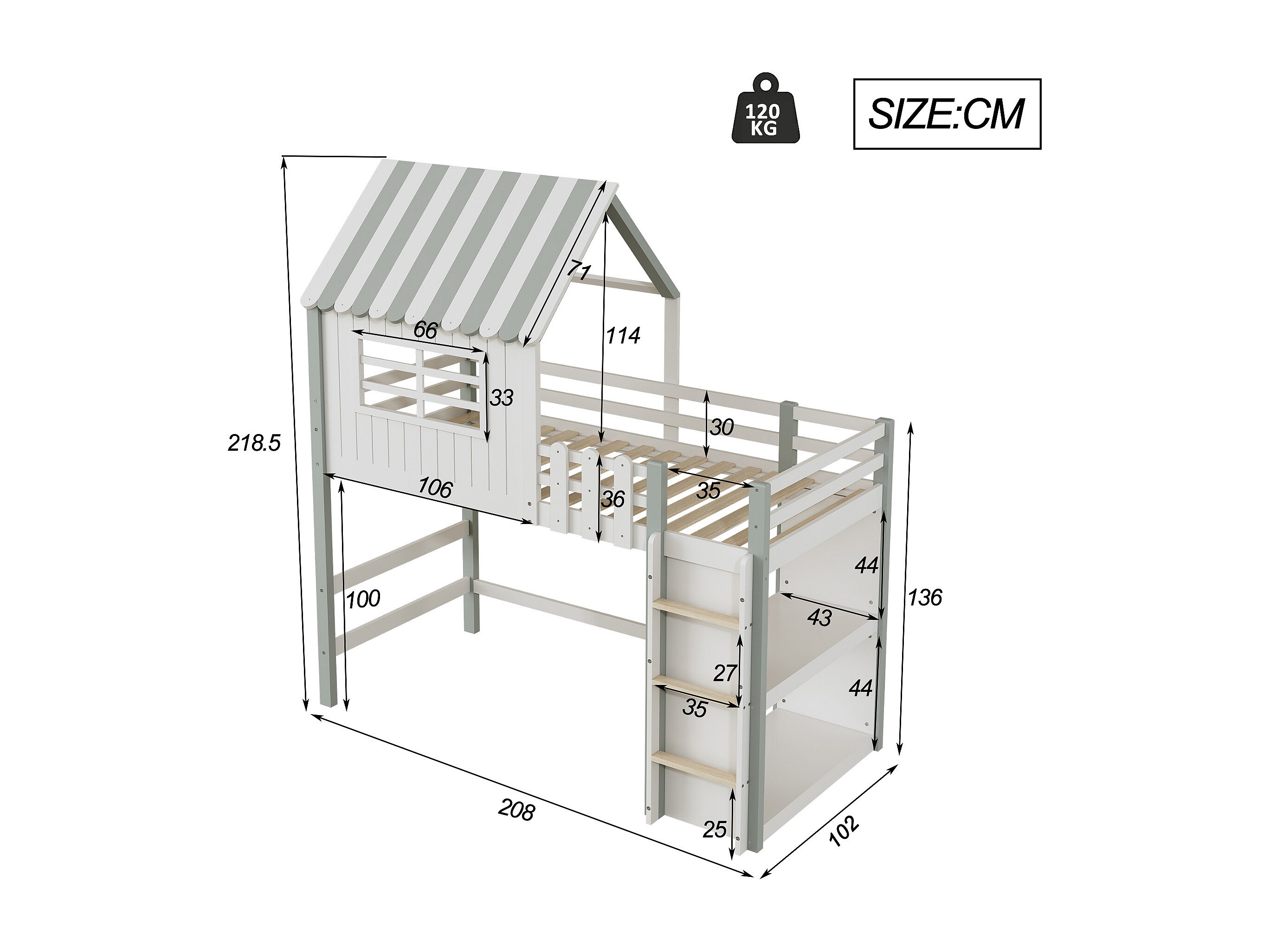 Lit mezzanine cabane enfant blanc et vert 90x200cm avec échelle, fenêtre et étagère de rangement, sans matelas