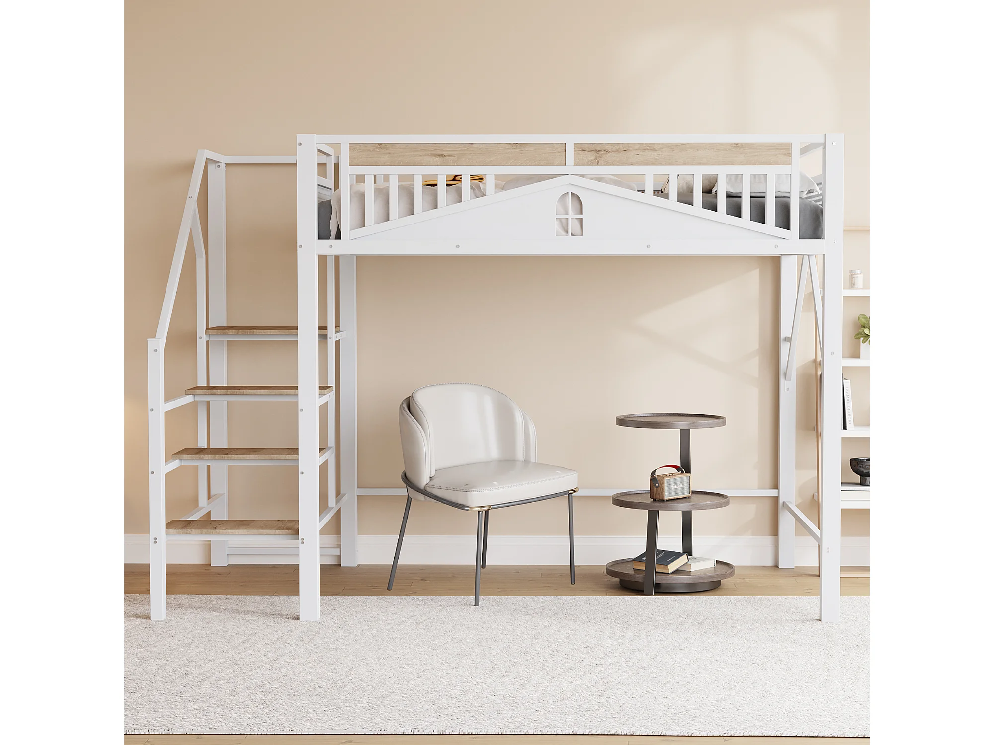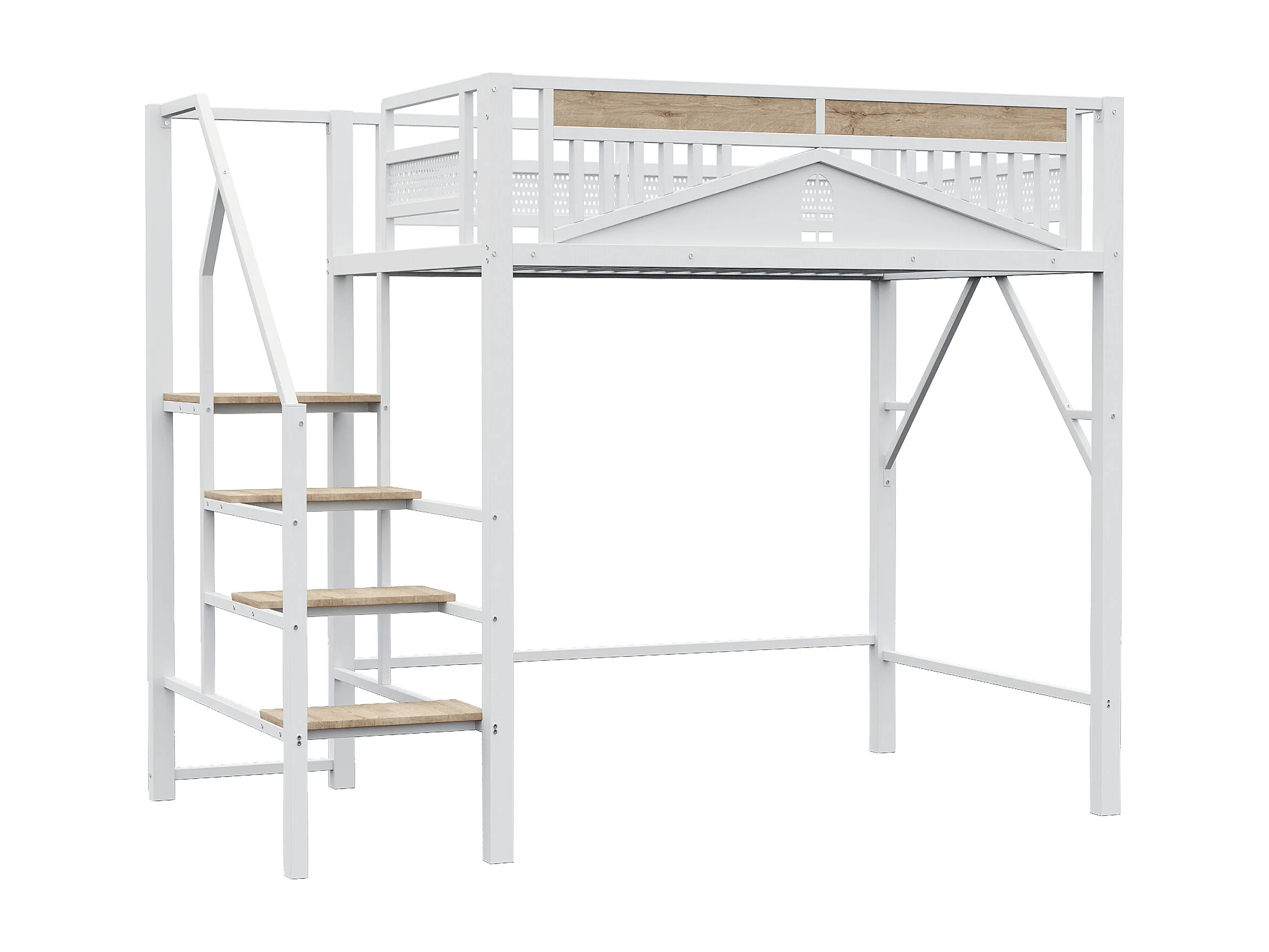 lit mezzanine double 140x200cm, clôtures et d'échelles, en métal blanc+ bois, sans matelas