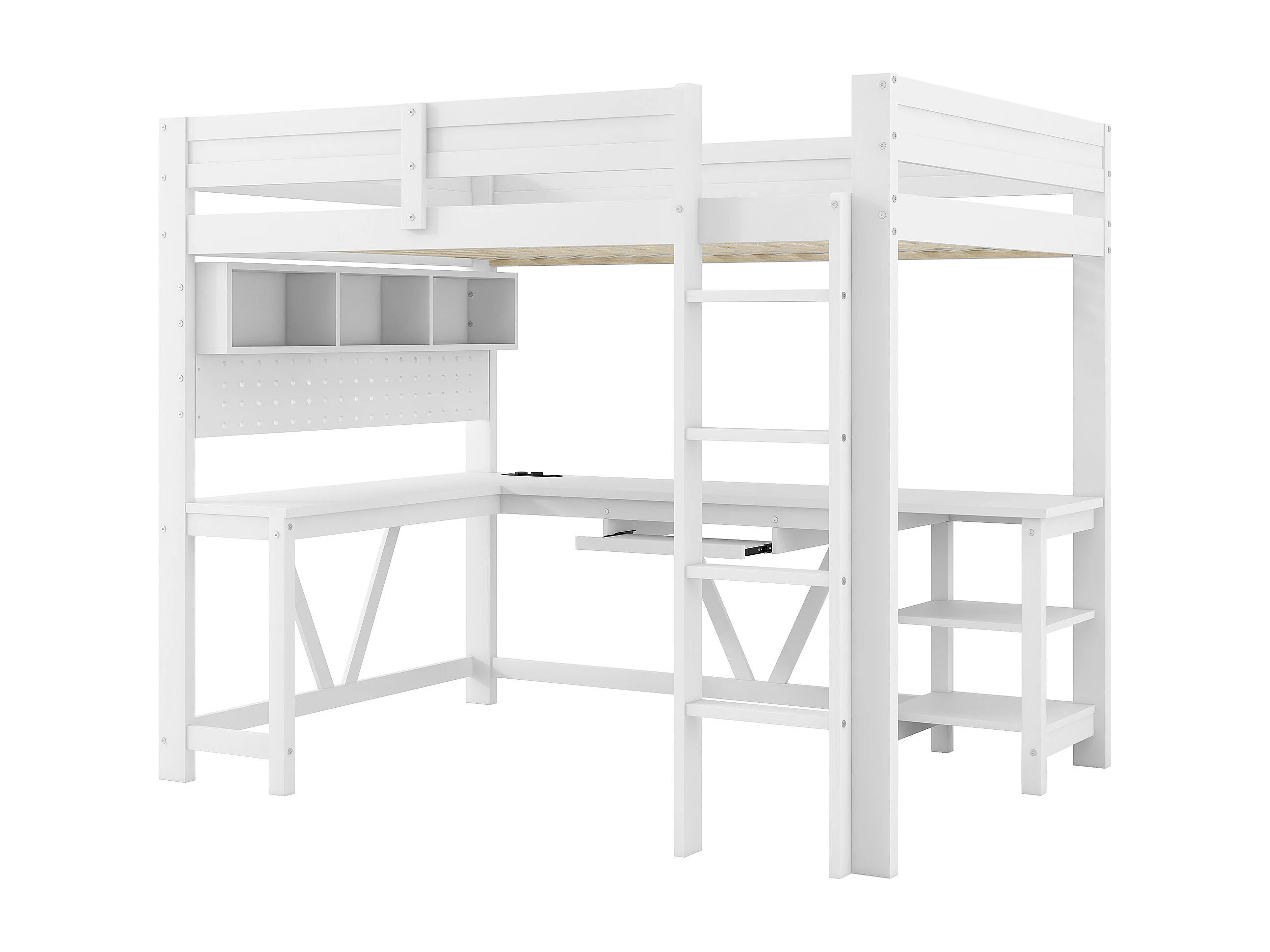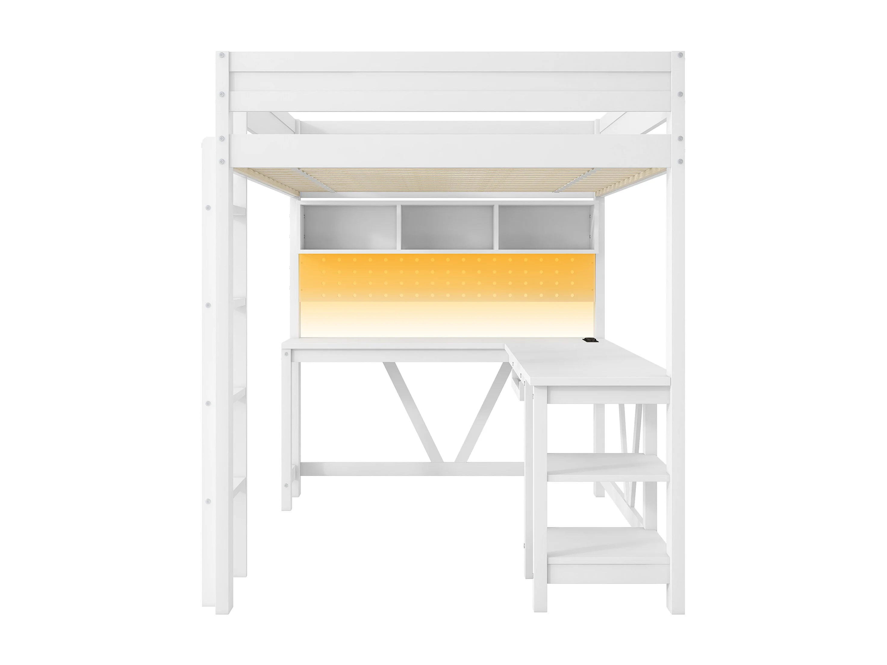 Lit mezzanine en bois 90 x 200 cm avec bureau, rangement, LED et station de recharge - Blanc