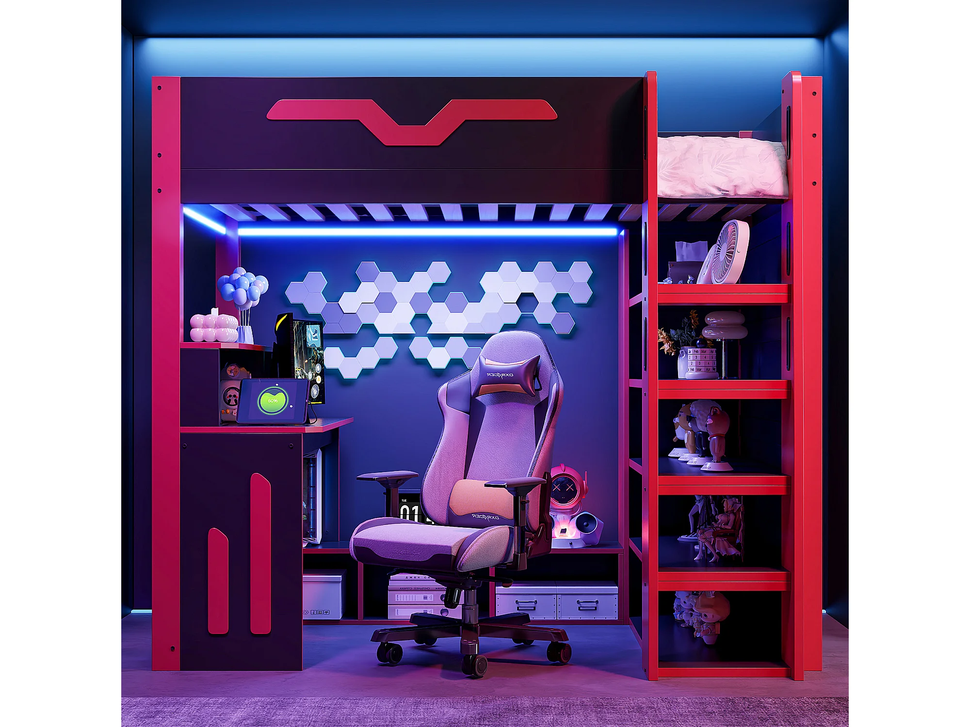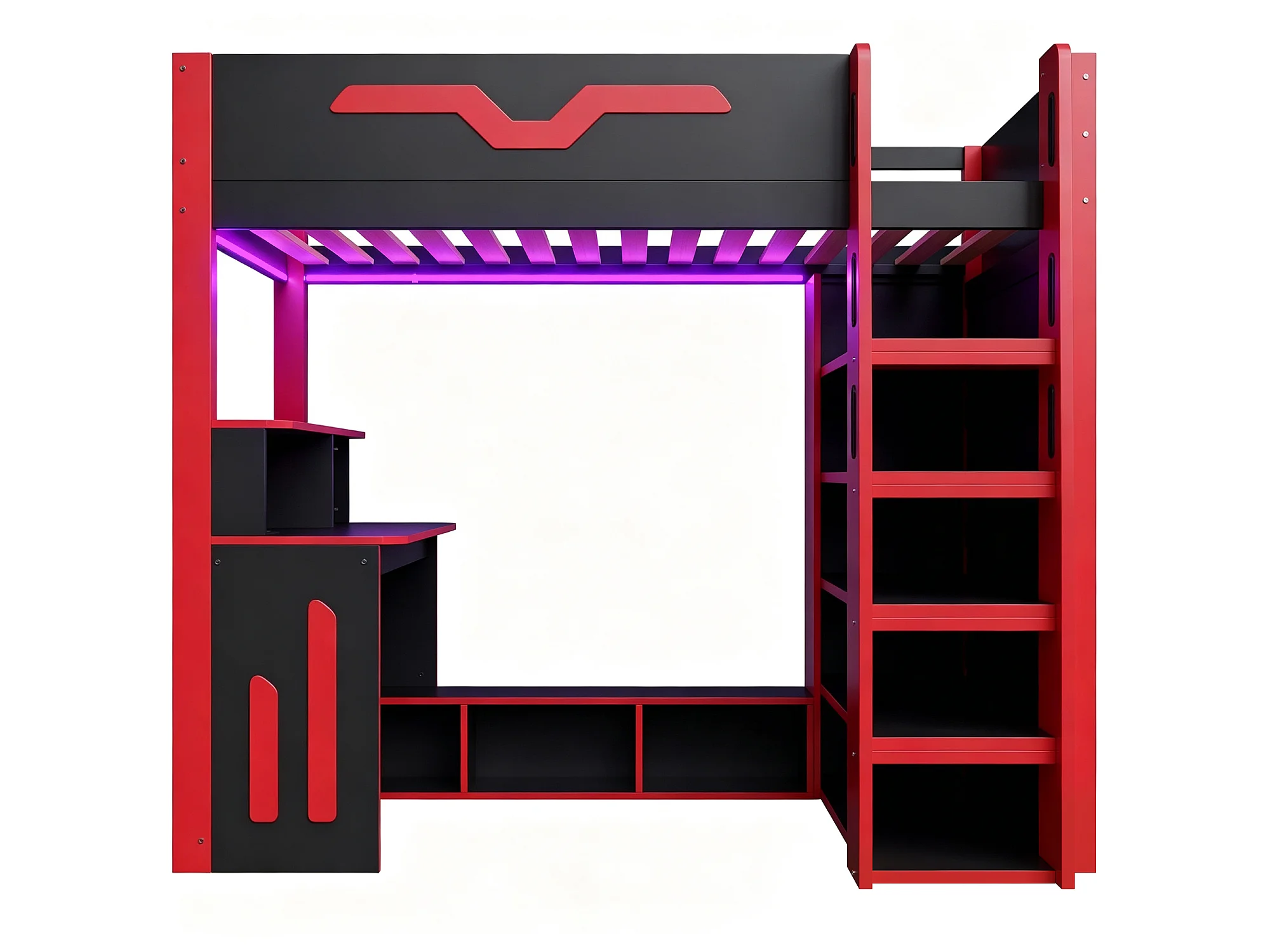 Lit mezzanine en bois 90x200 cm - Avec bureau et étagères - Éclairage LED et échelle de rangement - Noir et rouge (sans matelas)
