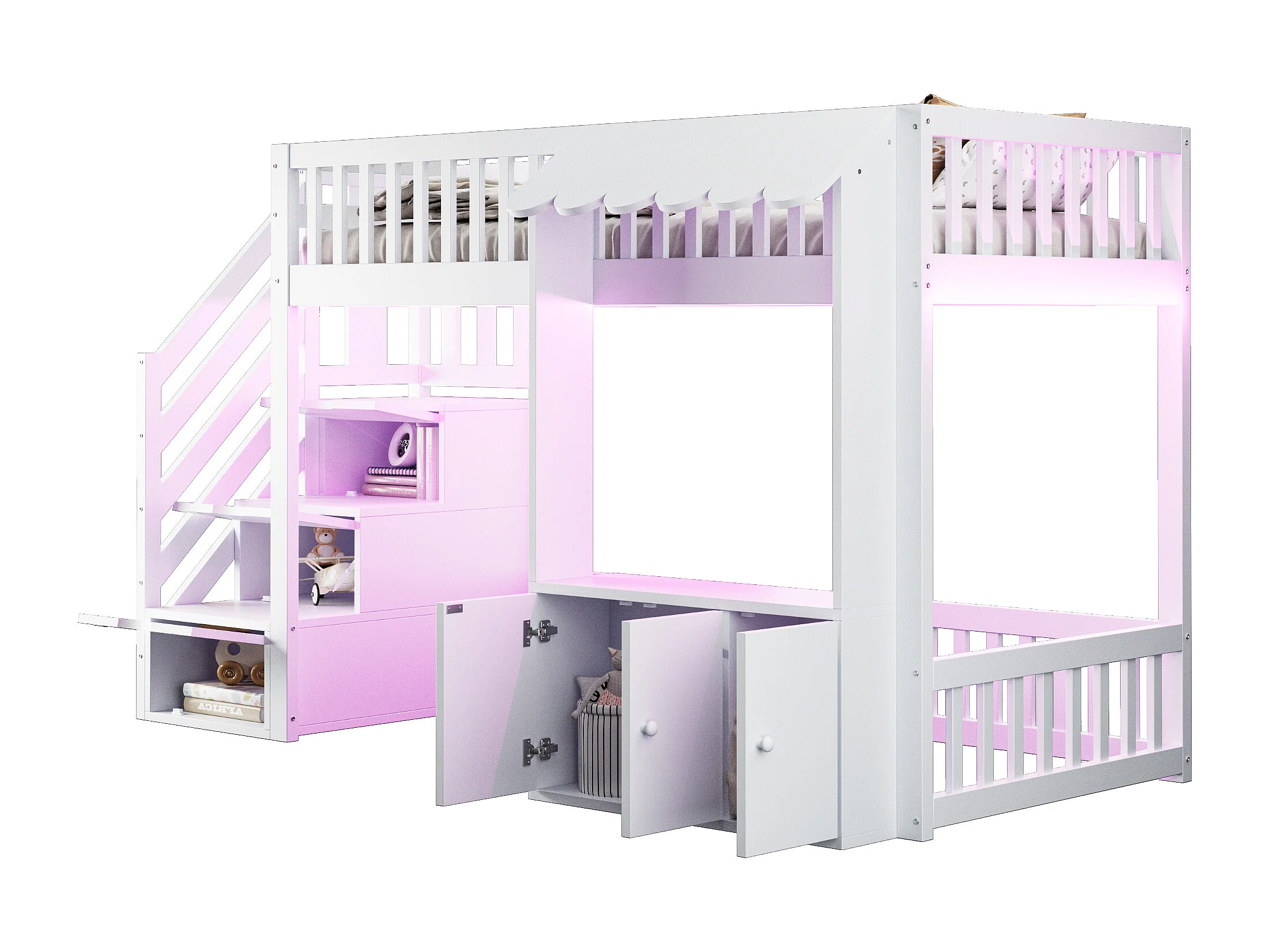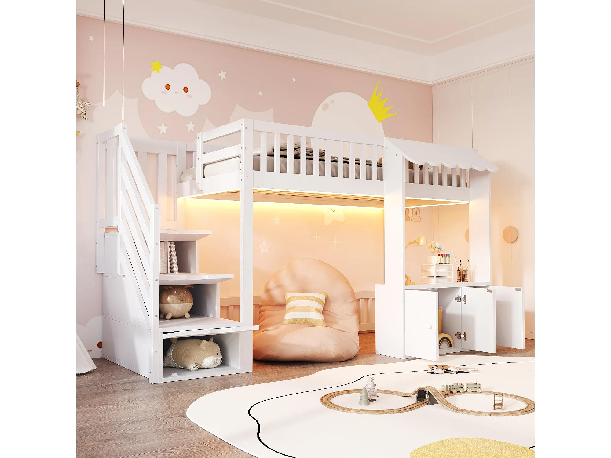 Lit mezzanine en bois 90x200cm - avec armoire - escalier de rangement - avec éclairage LED - blanc (matelas non inclus)