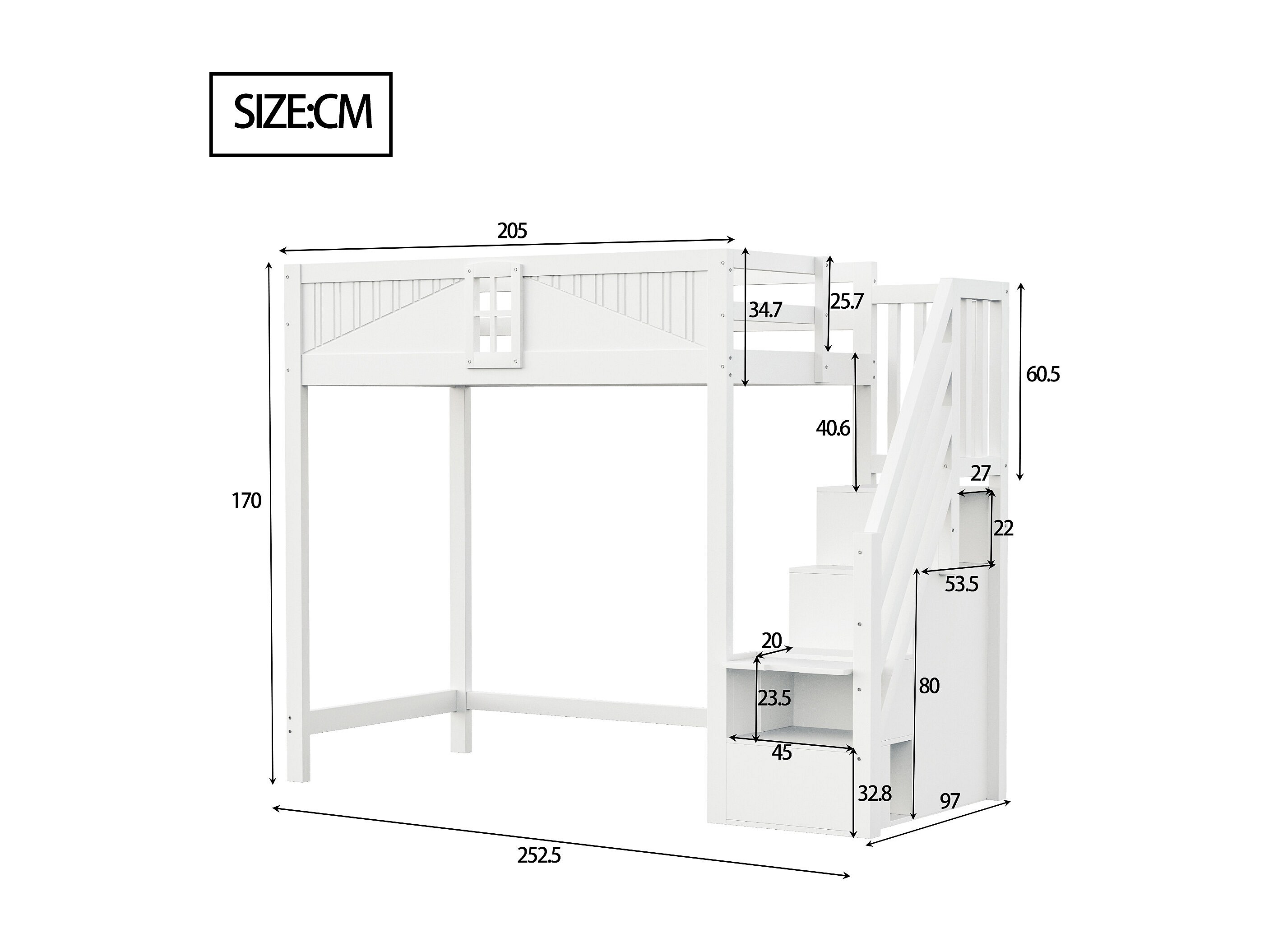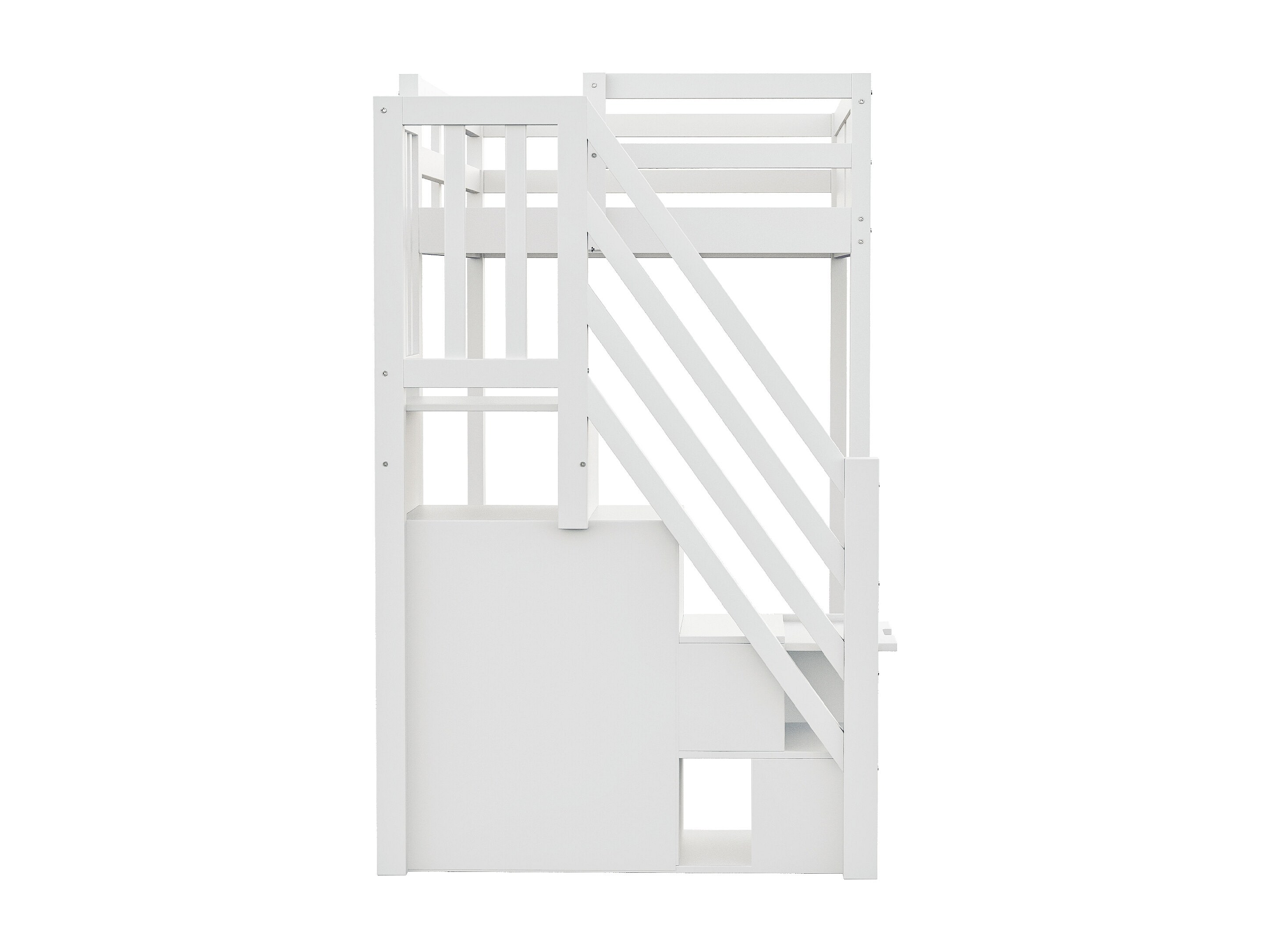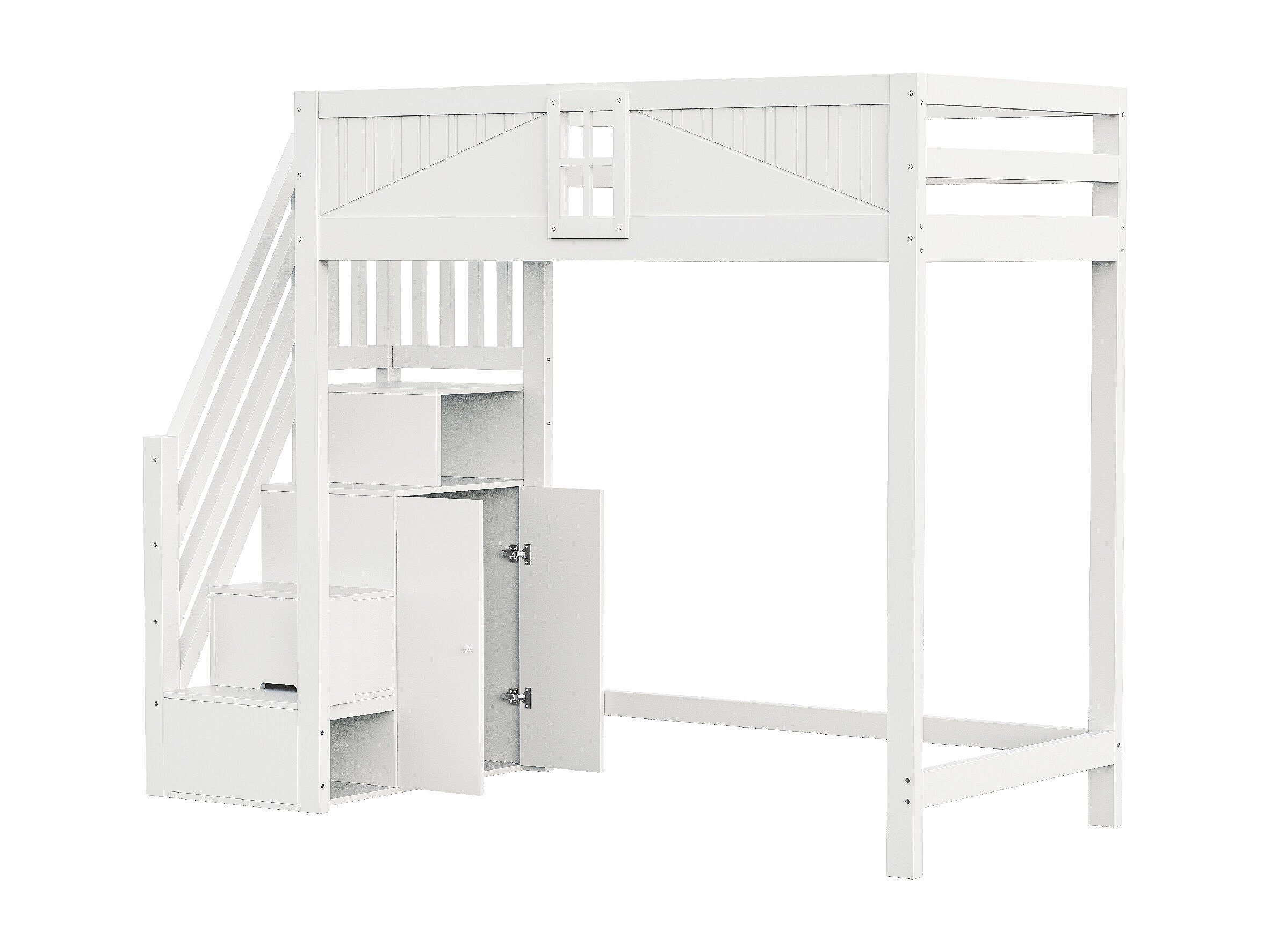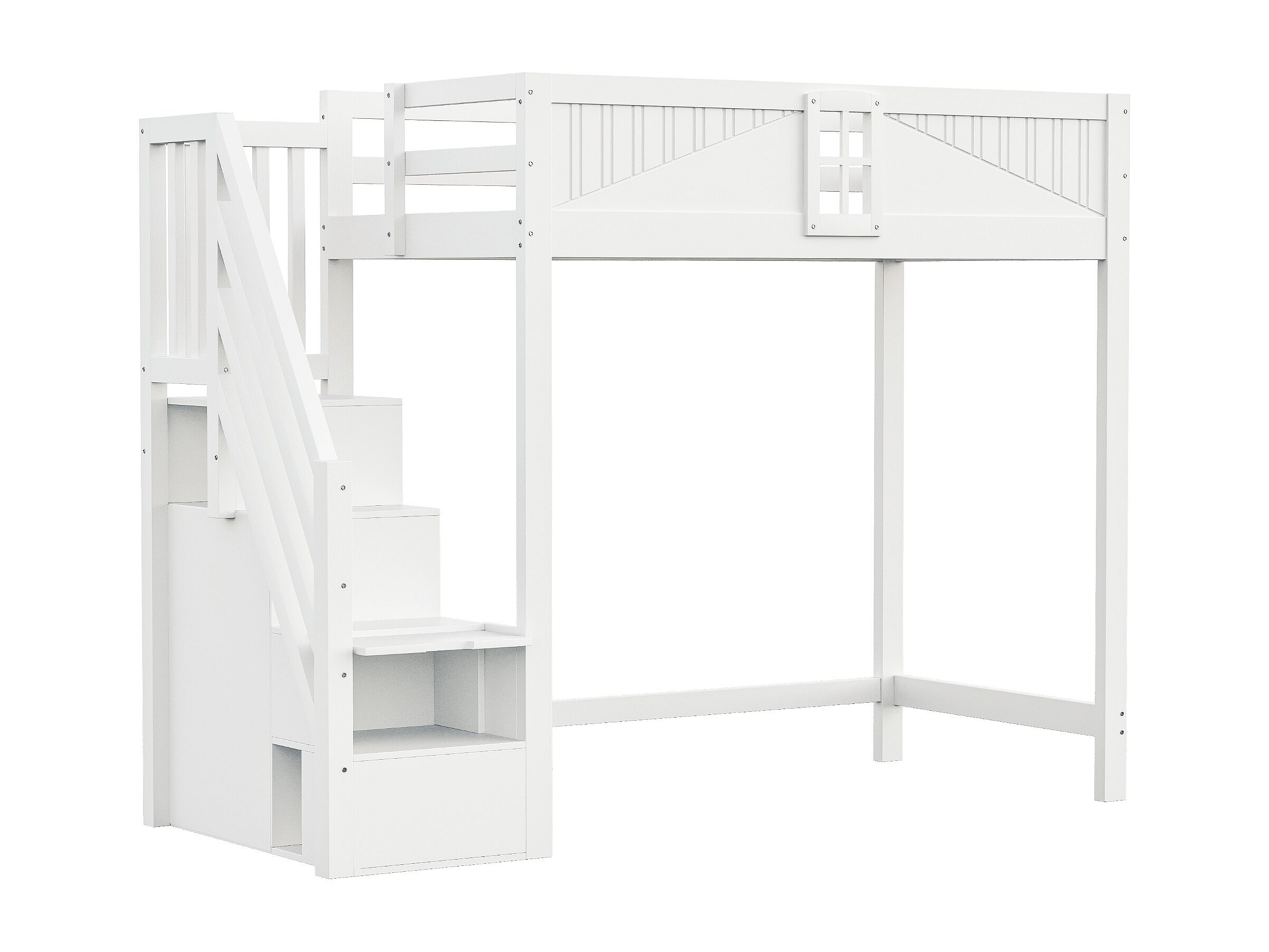 Lit mezzanine en bois blanc 90x200cm avec échelle de rangement et barrière de sécurité, design fenêtre (sans matelas)