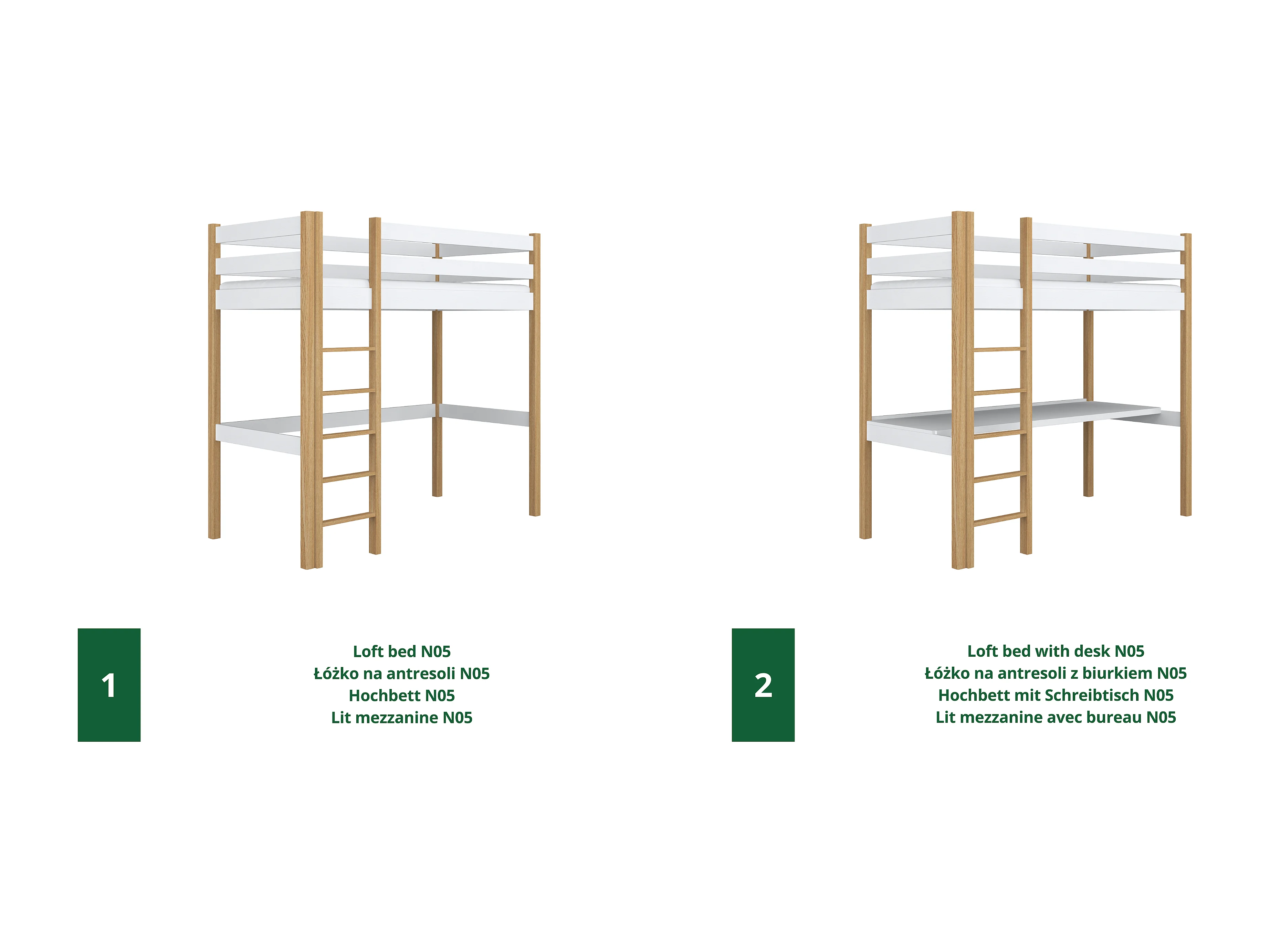 Lit mezzanine en bois N05 Blanc / Chêne Naturel 100x180