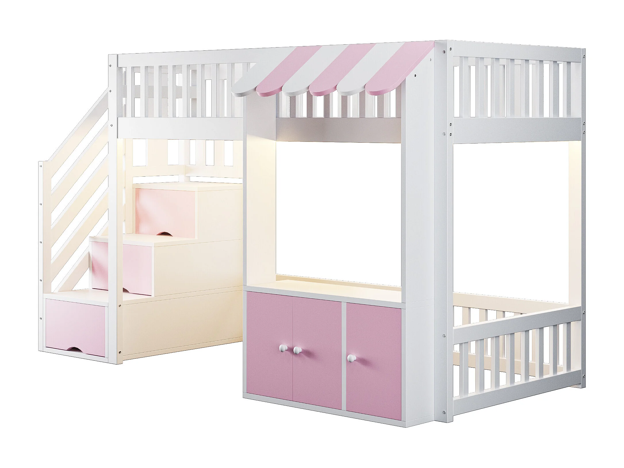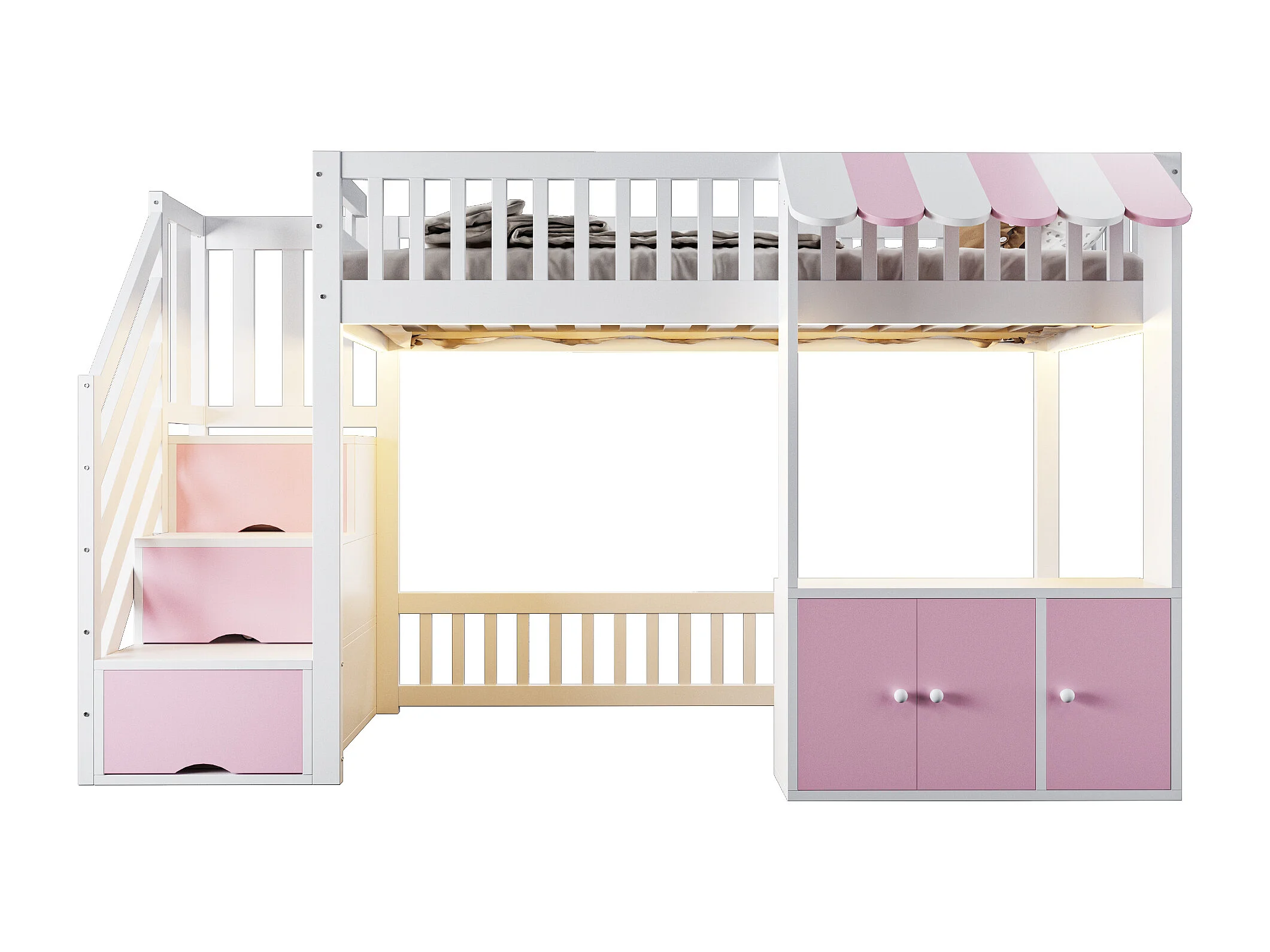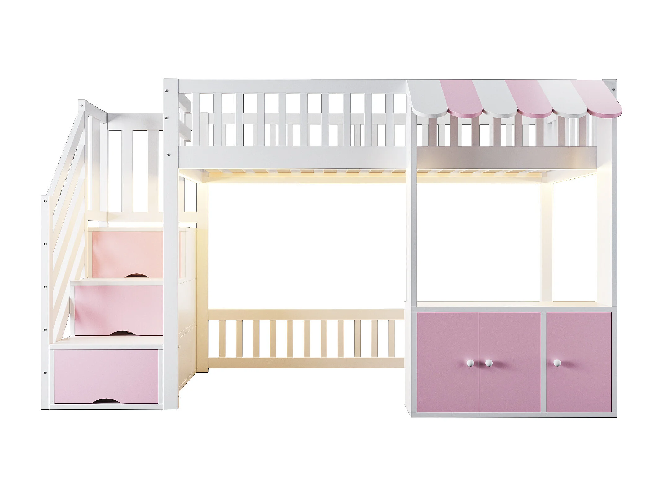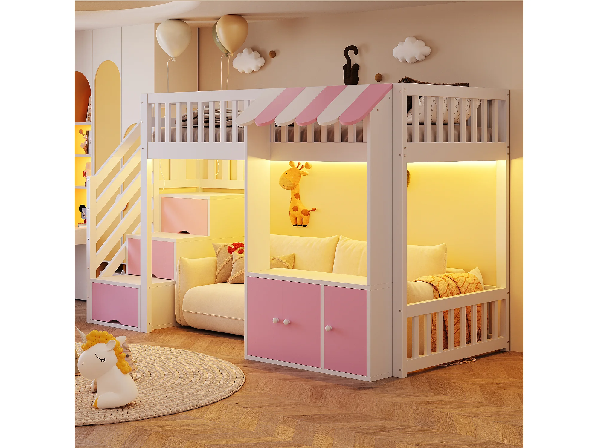 Lit mezzanine en bois pour efant - 90 x 200 cm - avec escalier de rangement + Leds + 2 casiers - blanc + rose