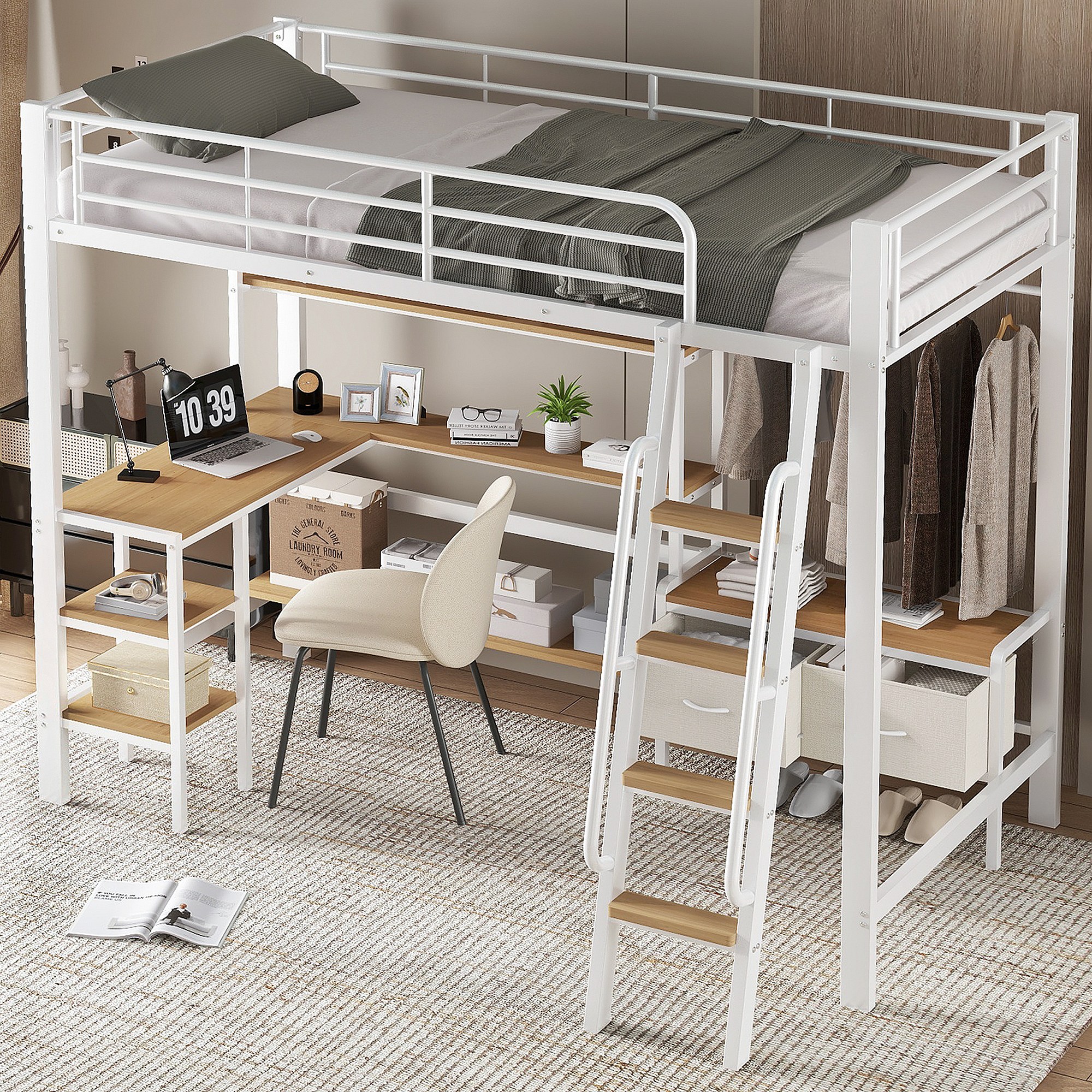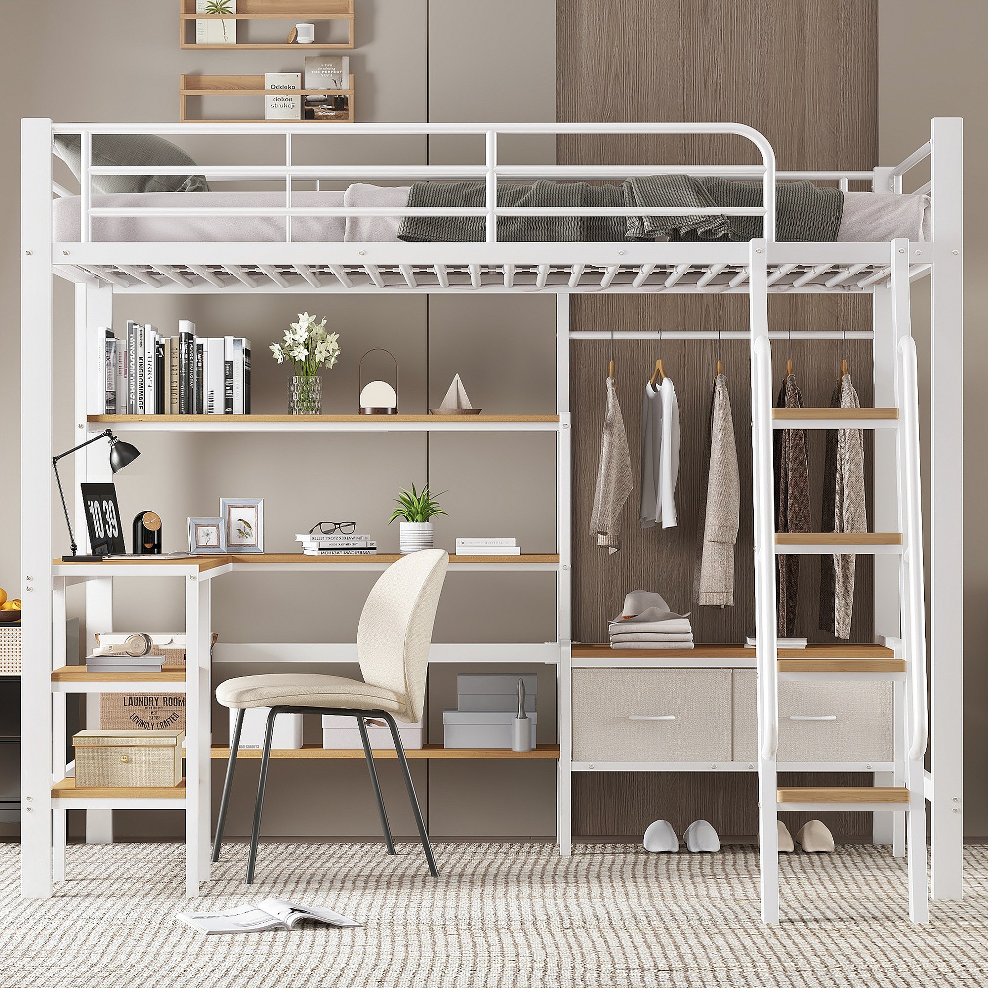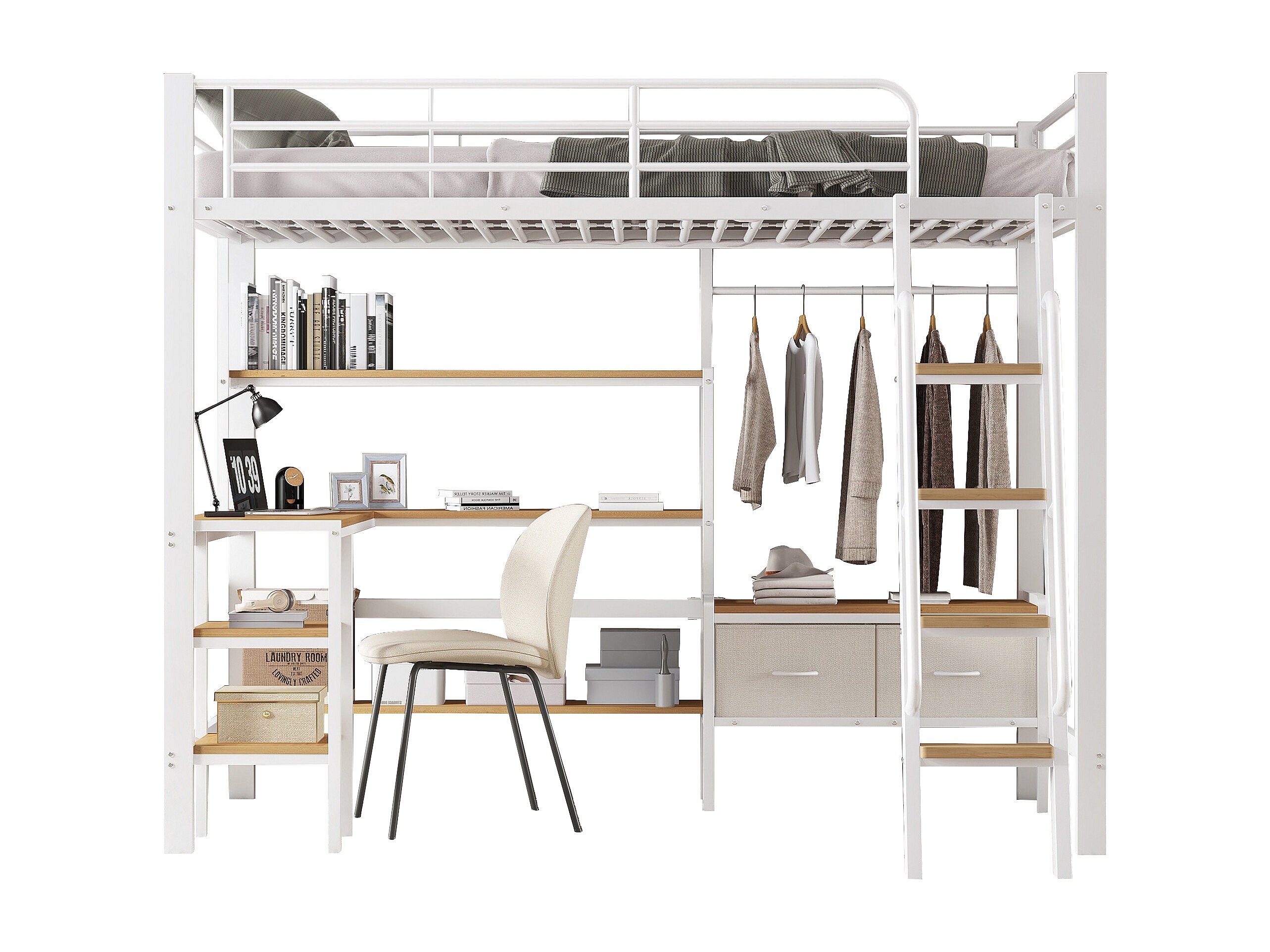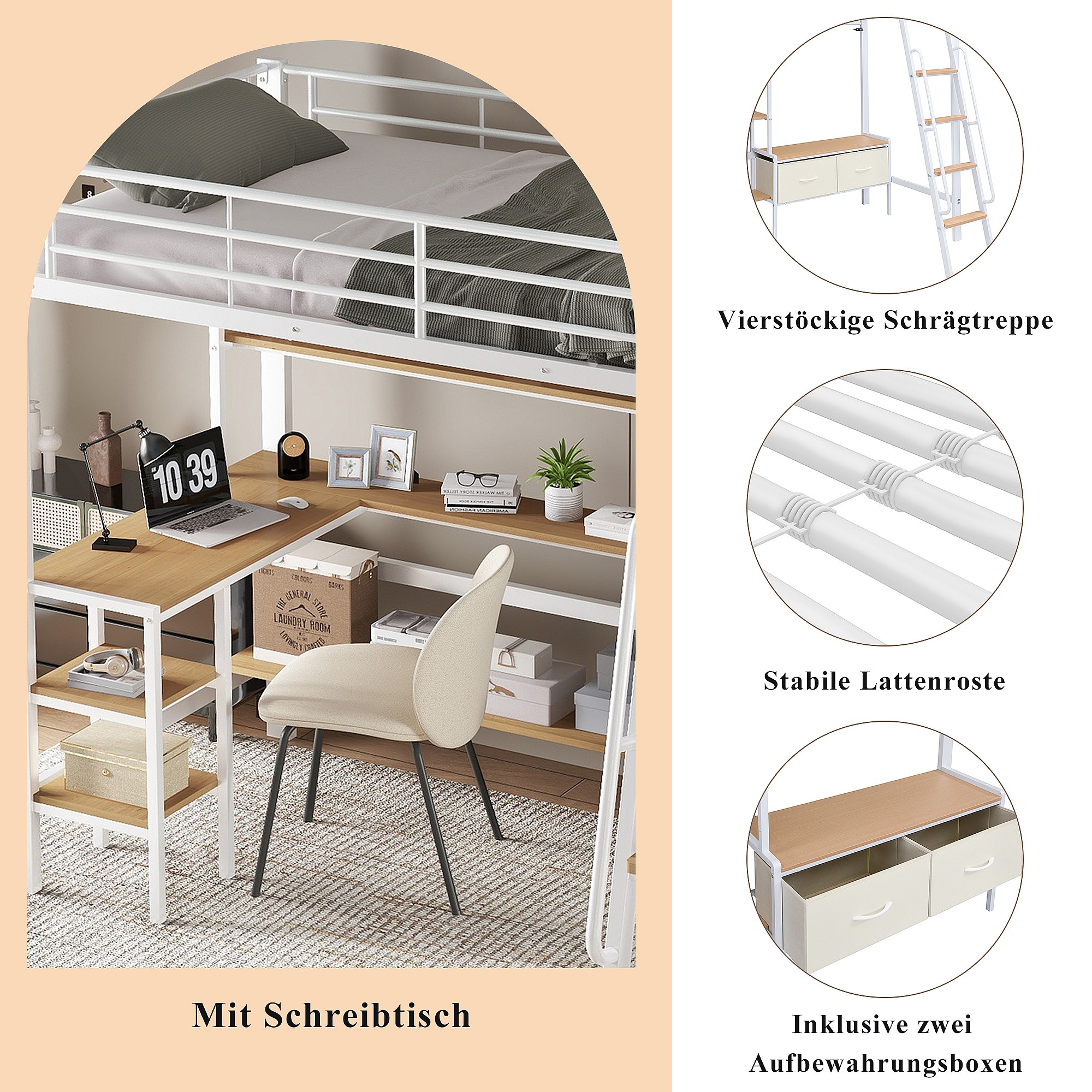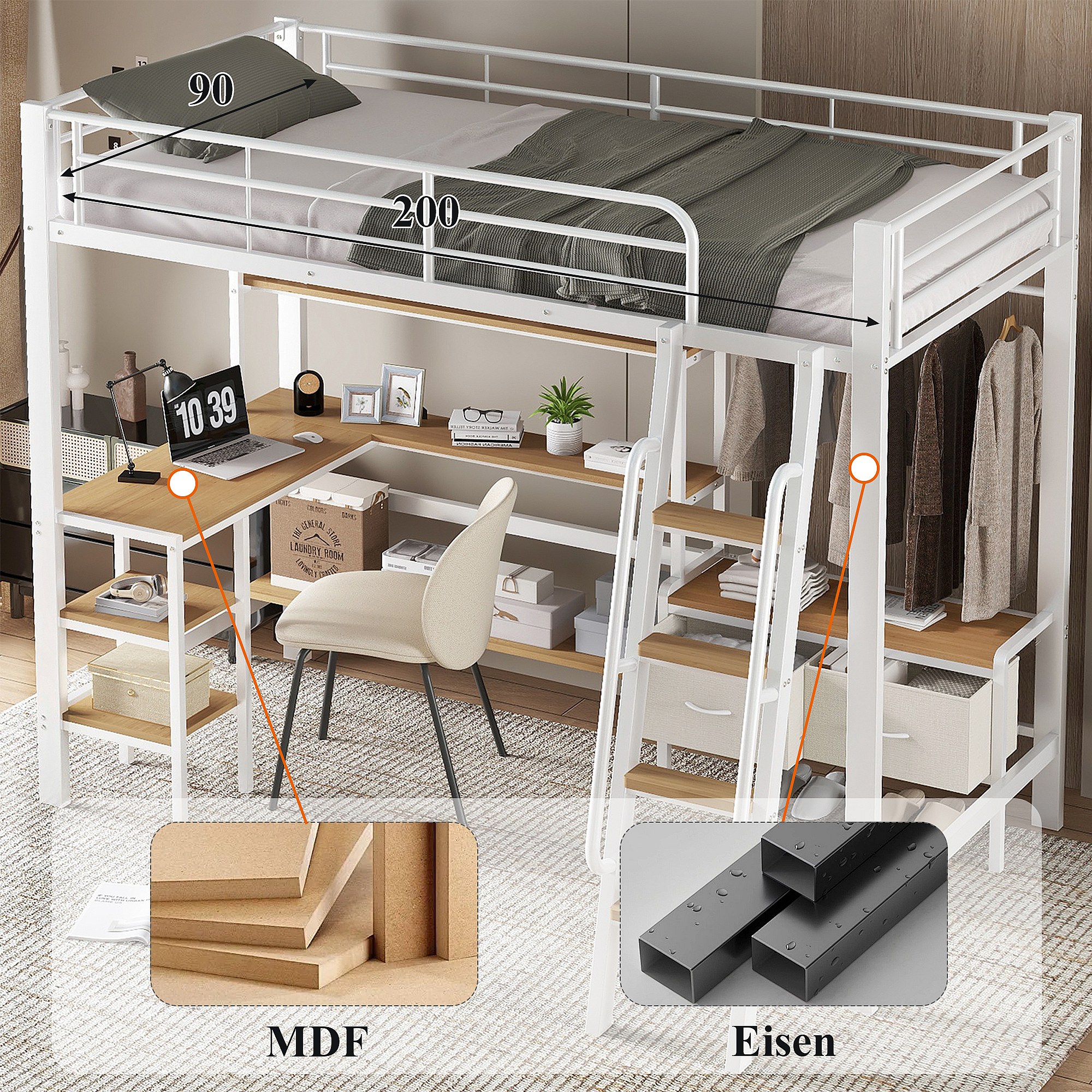 Lit mezzanine en fer - 90 x 200 cm - avec 2 tiroirs en tissu + bureau + étagère de rangement - fer + MDF - blanc + naturel