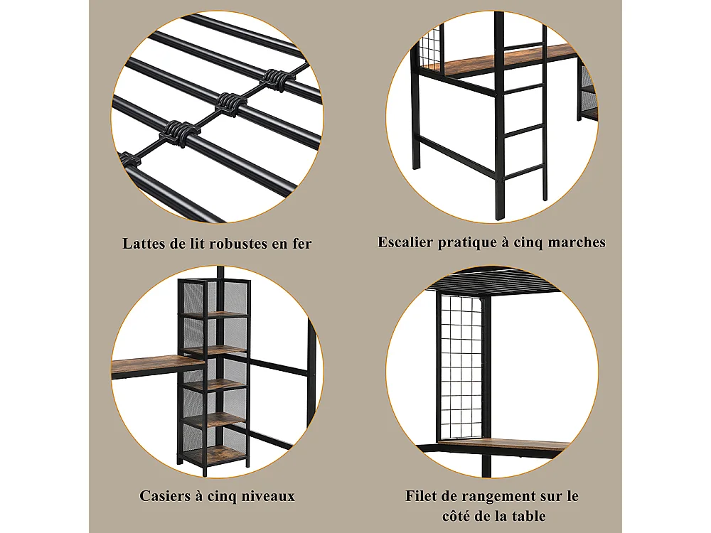 Lit mezzanine en fer 90x200 avec table et étagère multiple grille métallique gardecorps échelle solide noir et bois foncé
