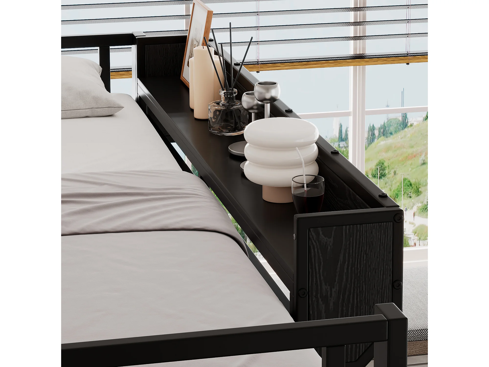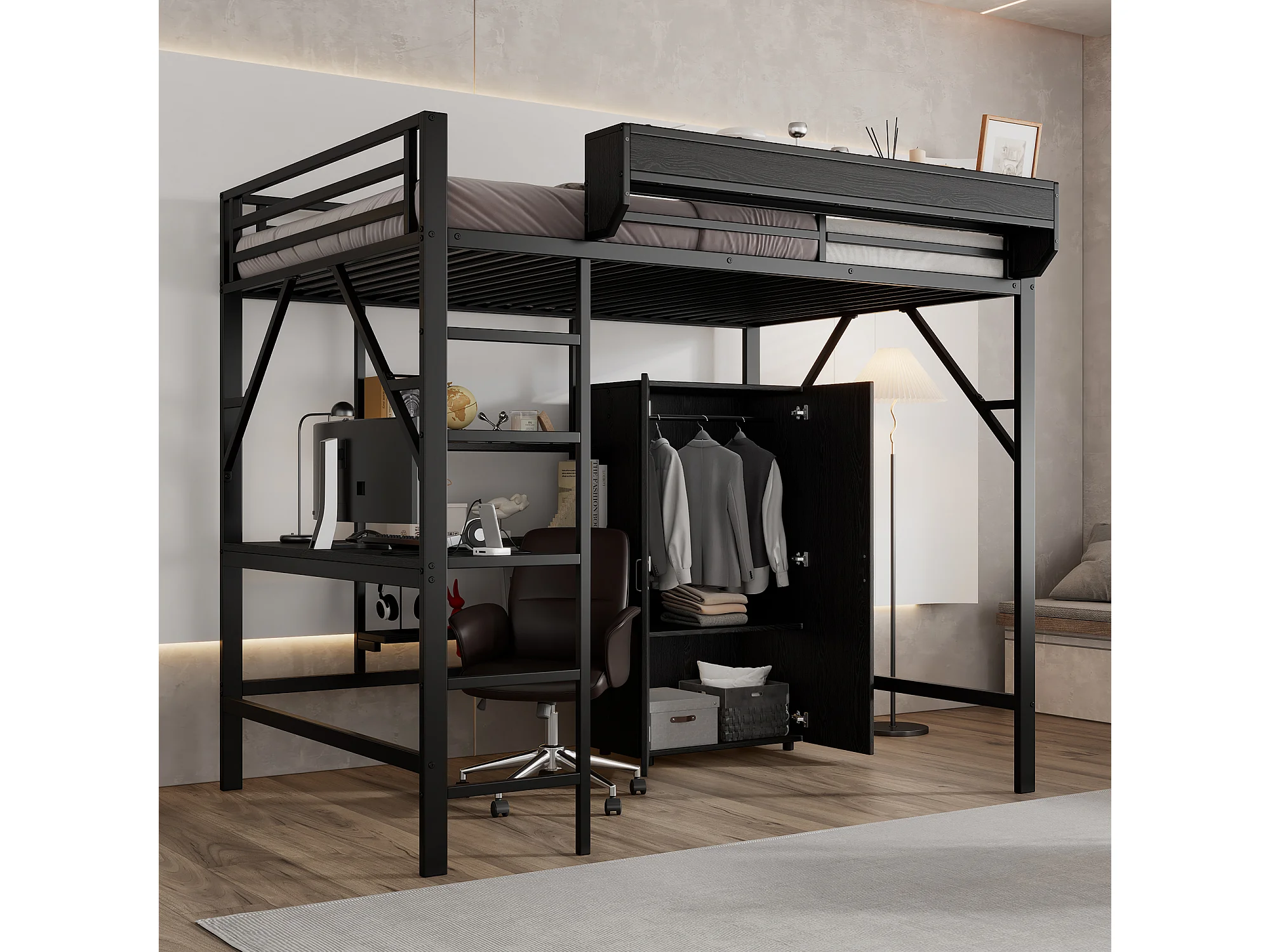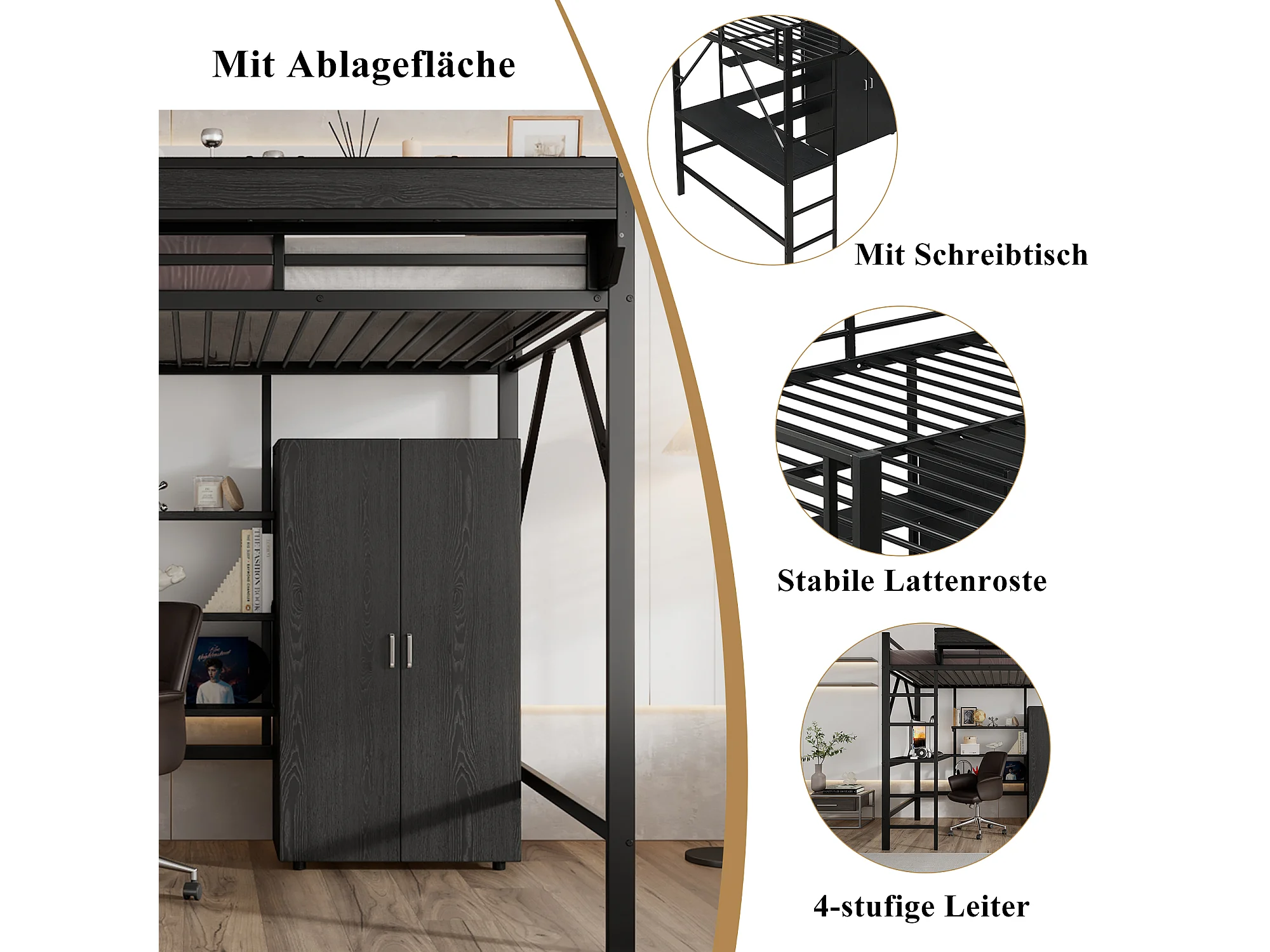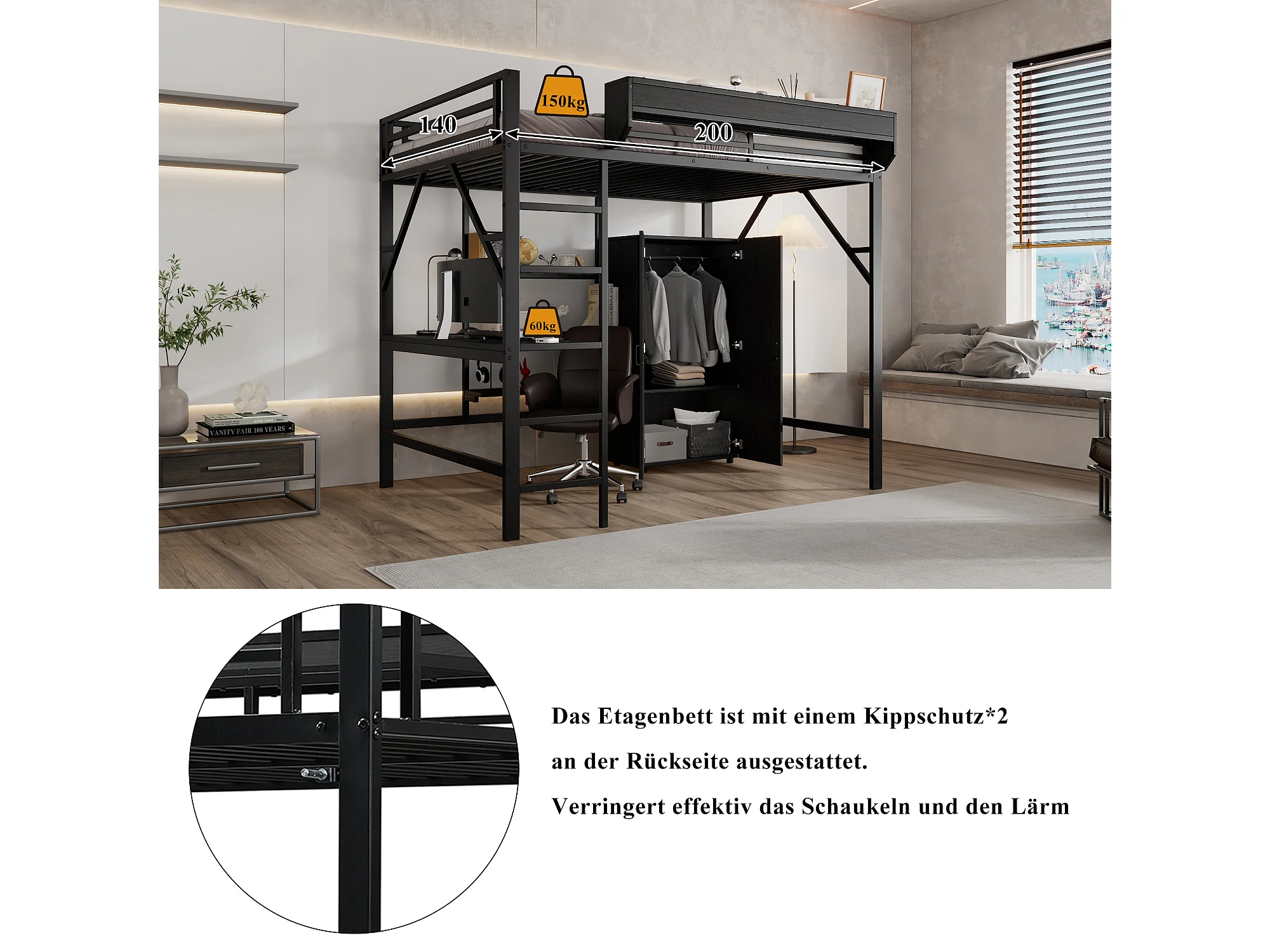 Lit mezzanine en fer enfant - 140 x 200 cm - avec armoire + bureau + étagère de rangement - fer + MDF - noir