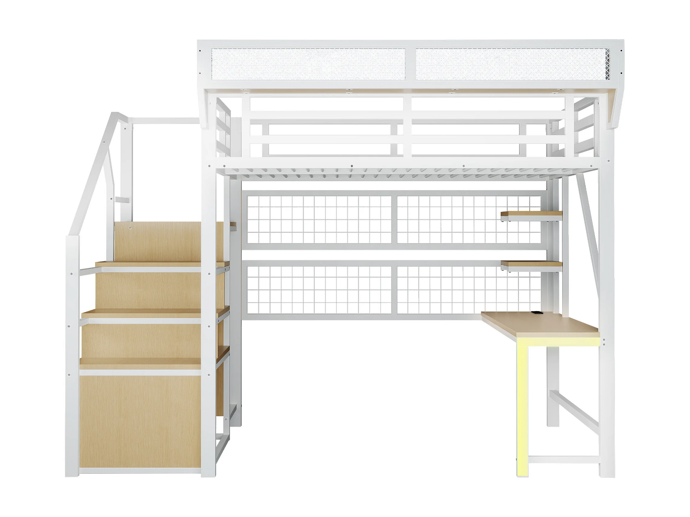 Lit mezzanine en métal - 140 x 200 cm - avec bureau + étagère et filet de rangement + échelle de rangement + Leds + prise - blanc