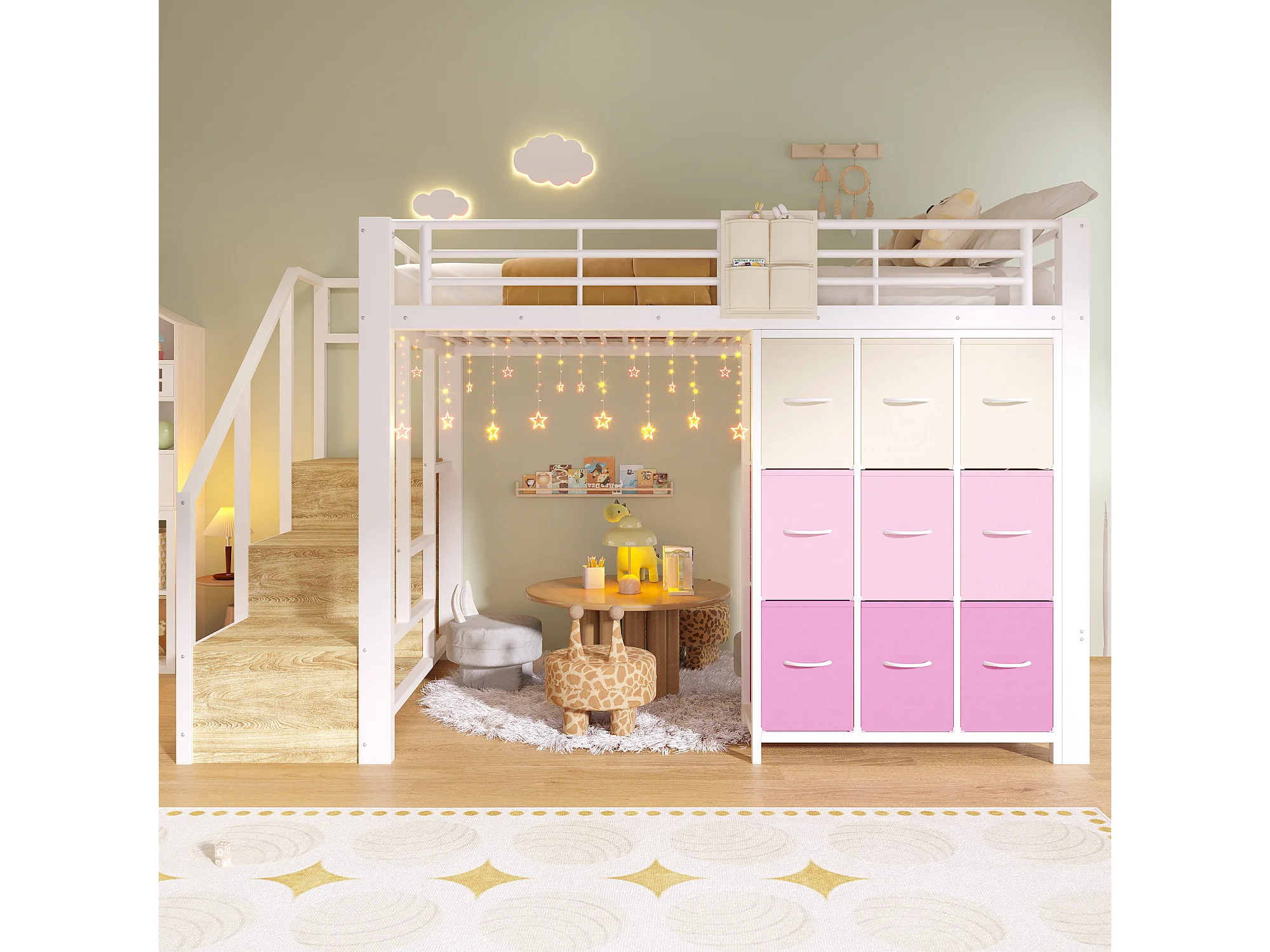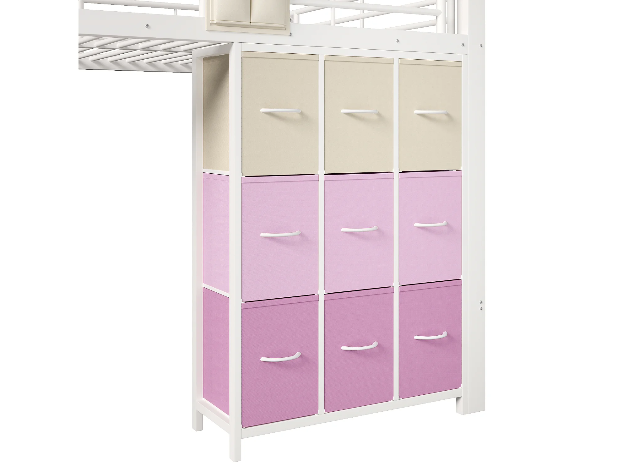 Lit mezzanine en métal - 140 x 200 cm - avec commode à 9 tiroirs + penderie + escalier avec rangement - blanc