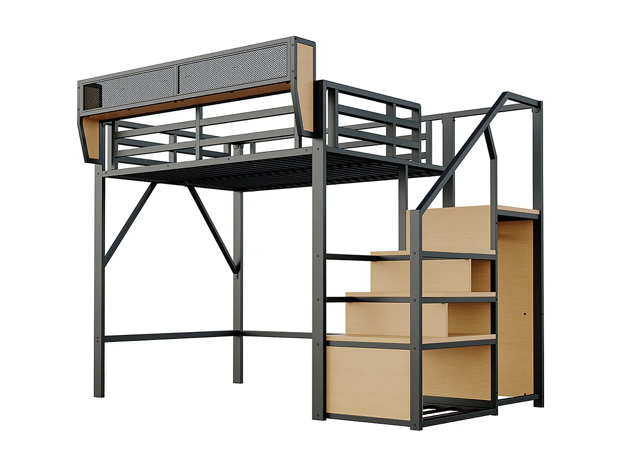 Lit mezzanine en métal 140x200 avec échelle de sécurité et compartiment de rangement flexible pour enfants noir
