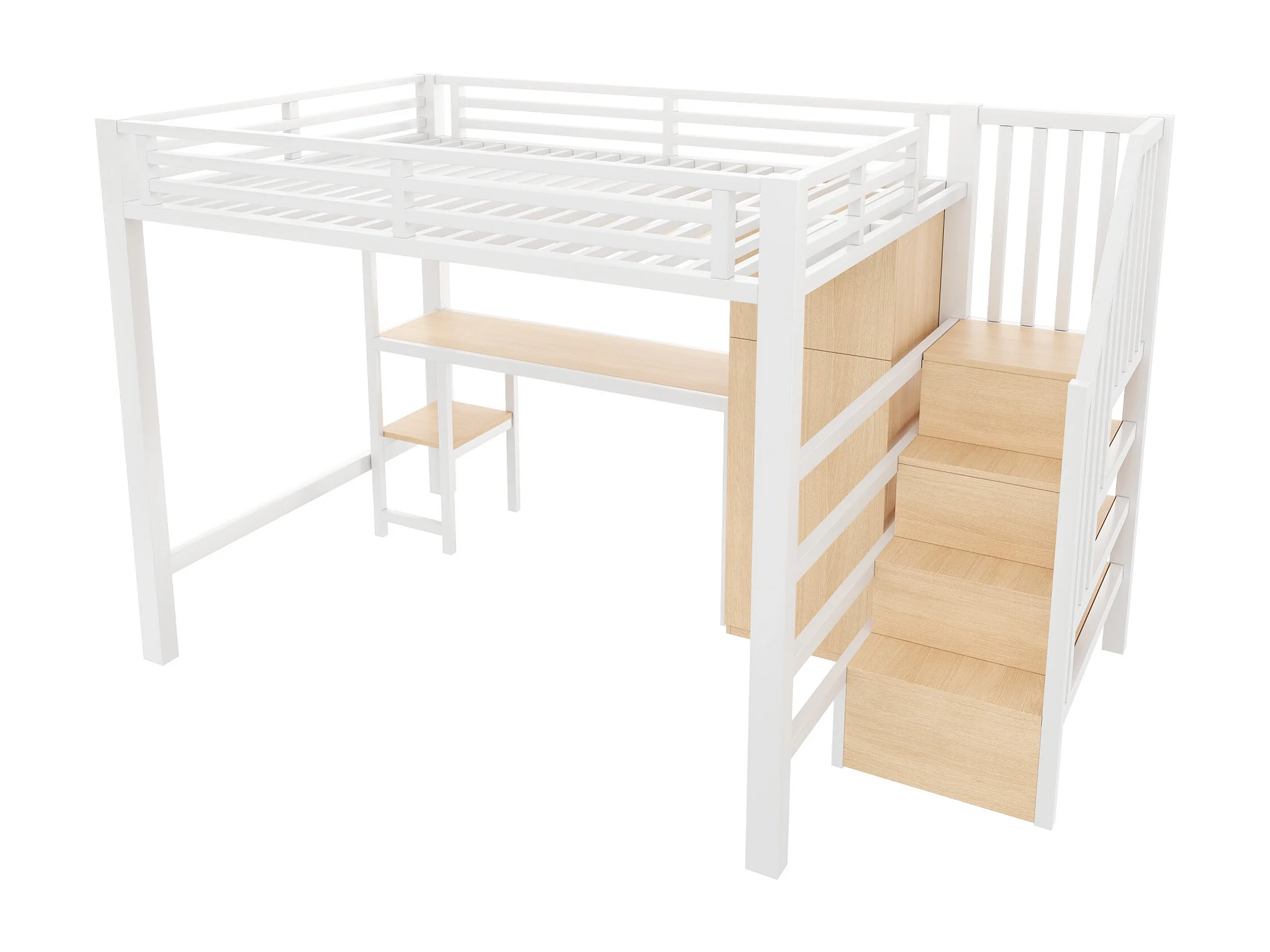 Lit mezzanine en métal 140x200 avec LED, bureau, étagère et armoire - Blanc (sans matelas)