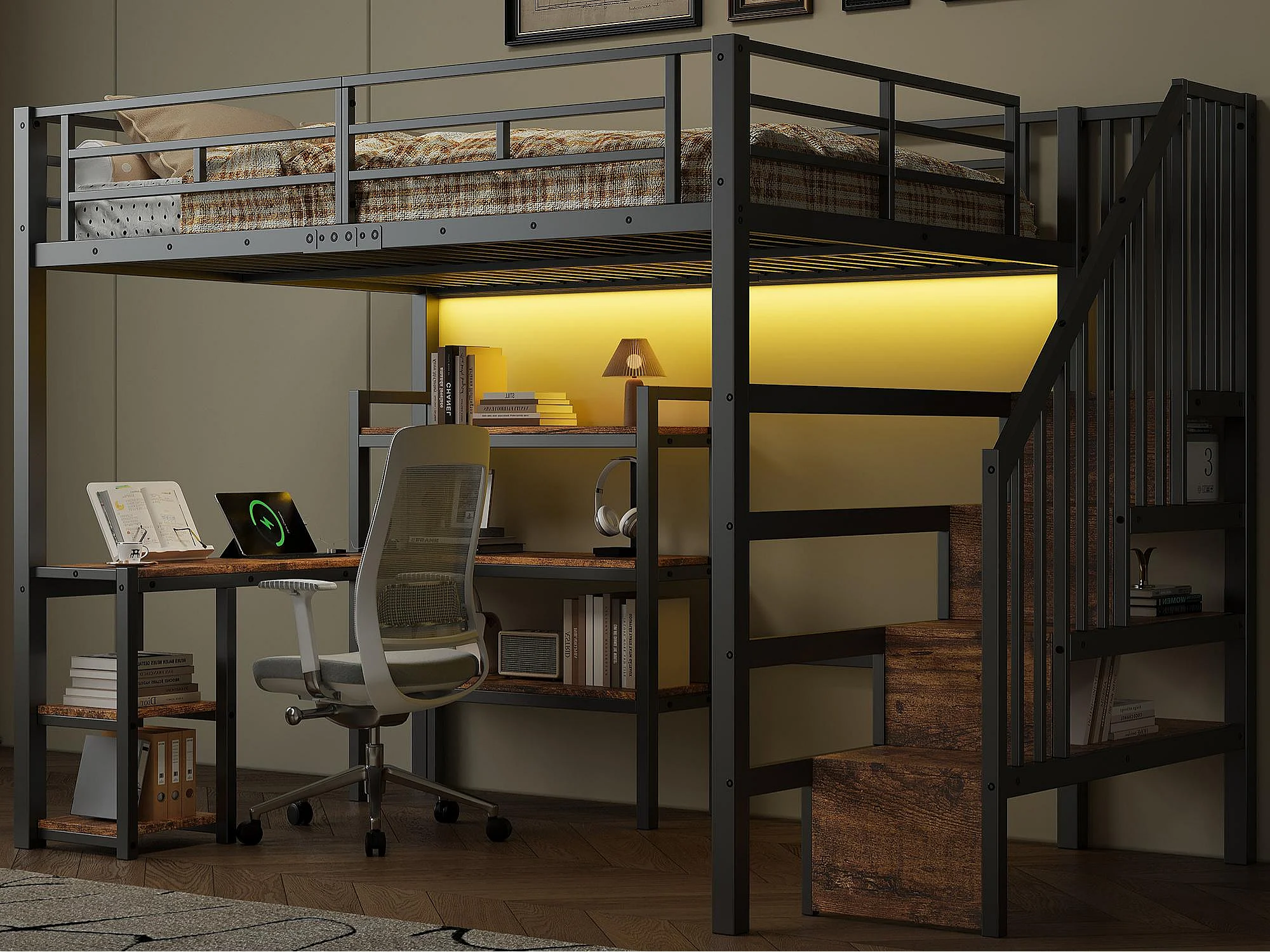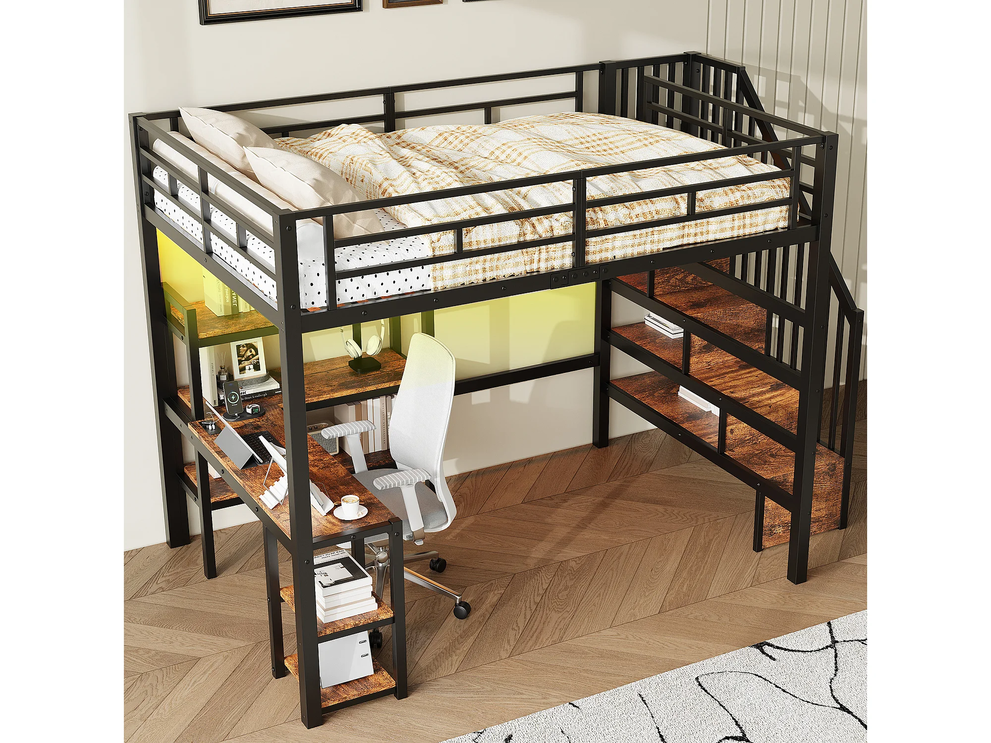 Lit mezzanine en métal 140x200 cm - Avec bureau et échelle de rangement - Port USB et éclairage LED - Noir (sanas matelas)