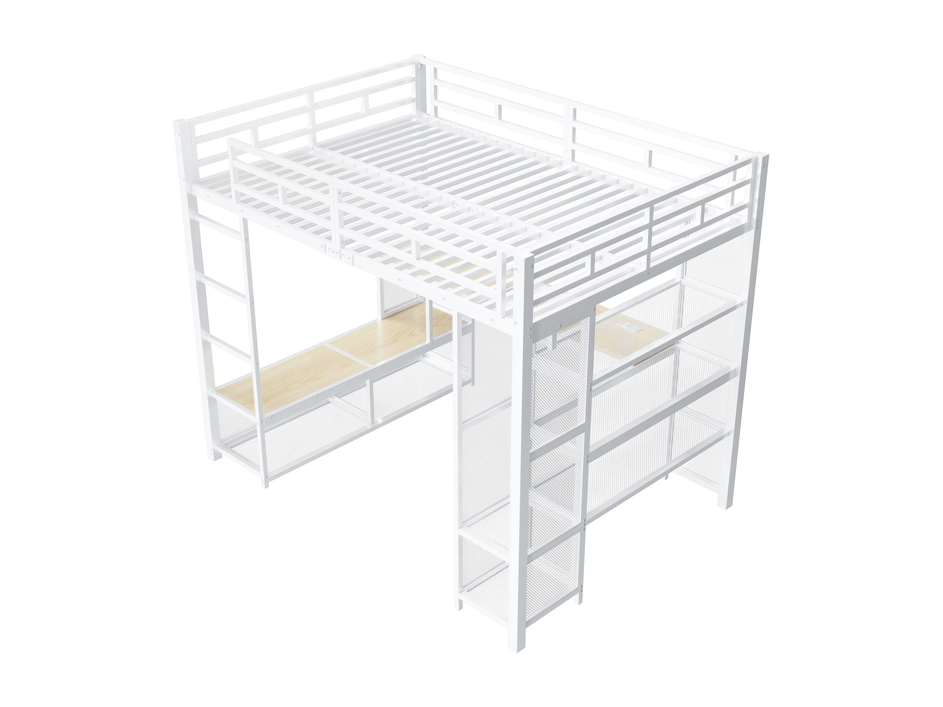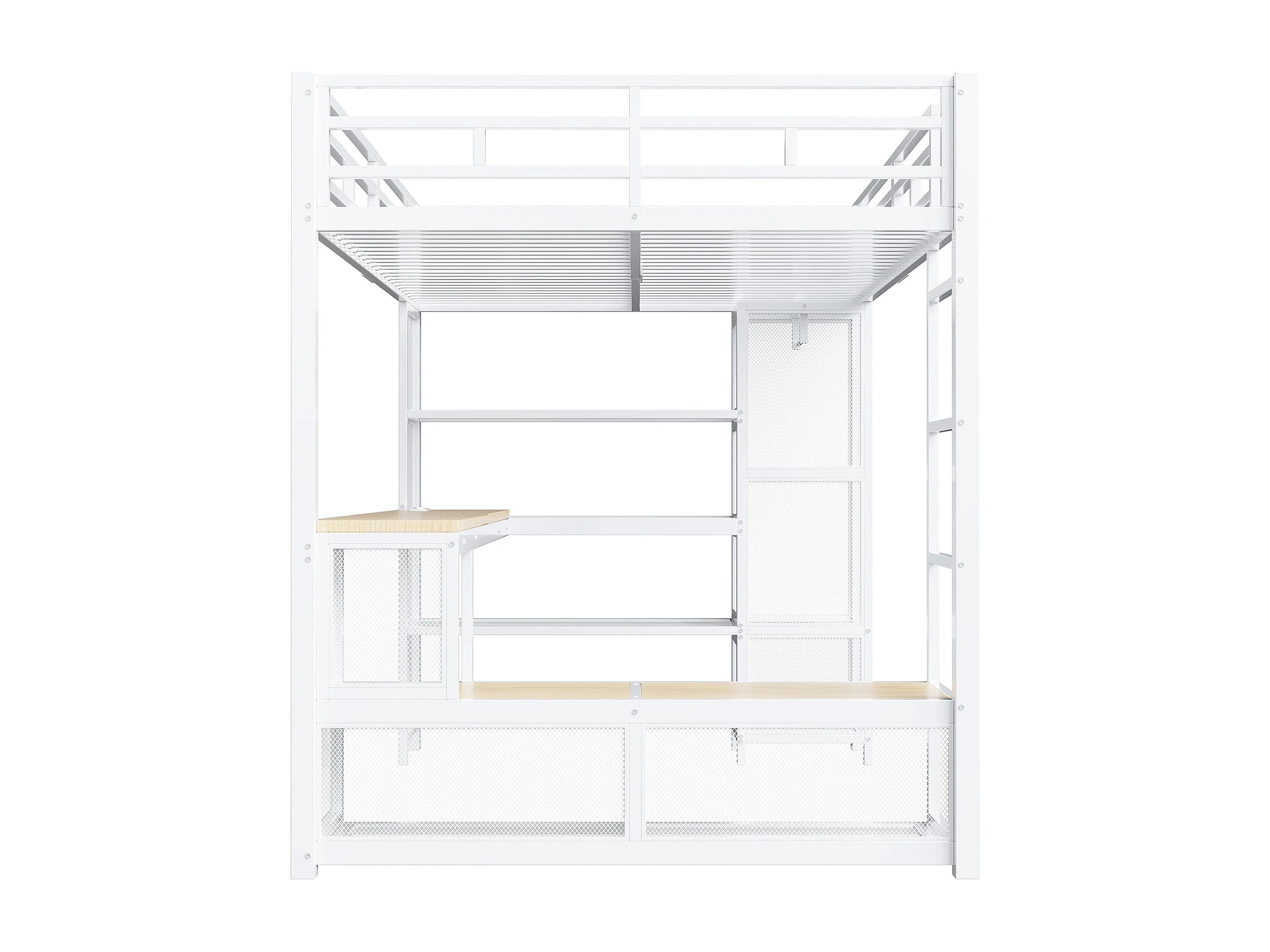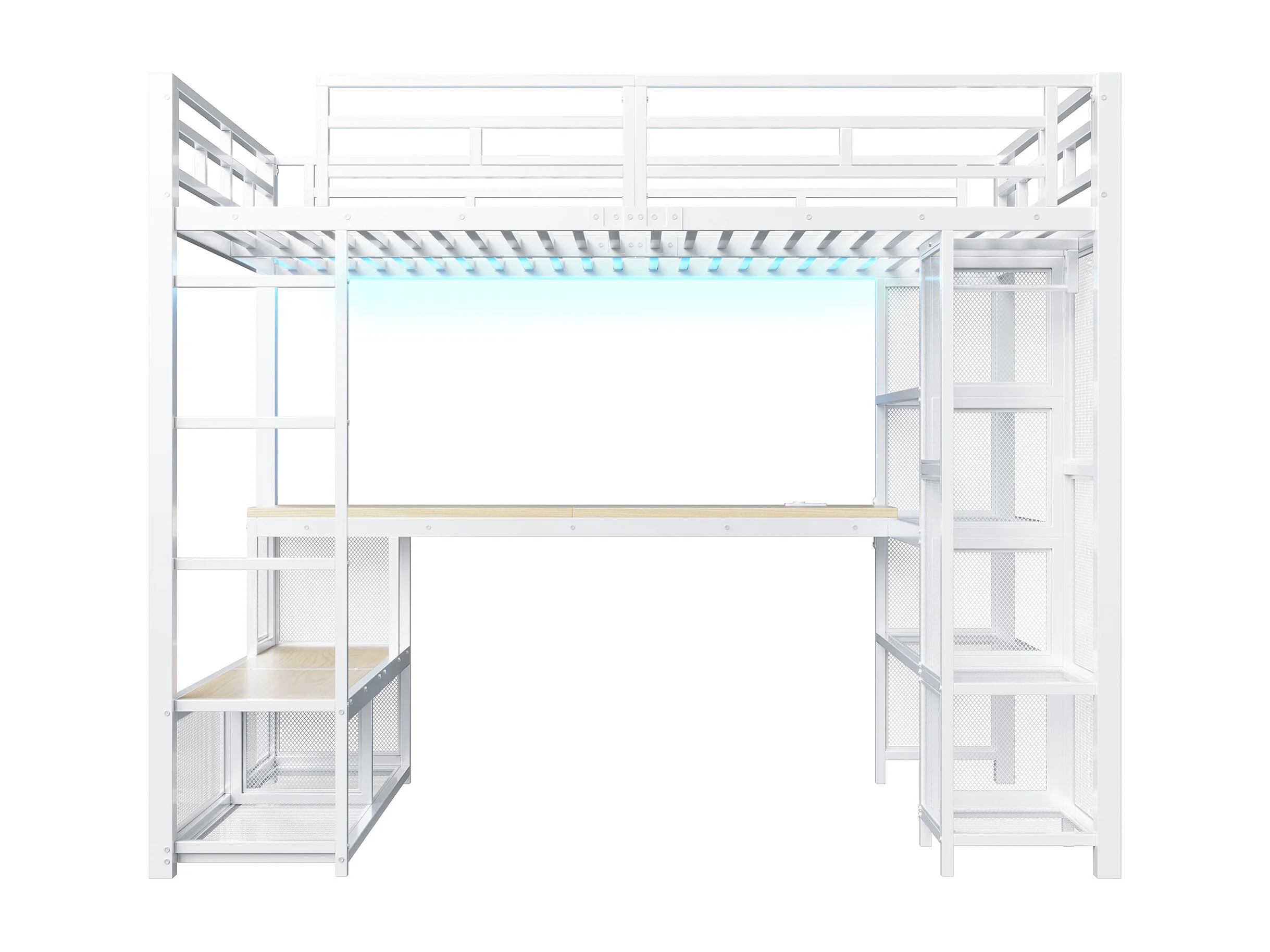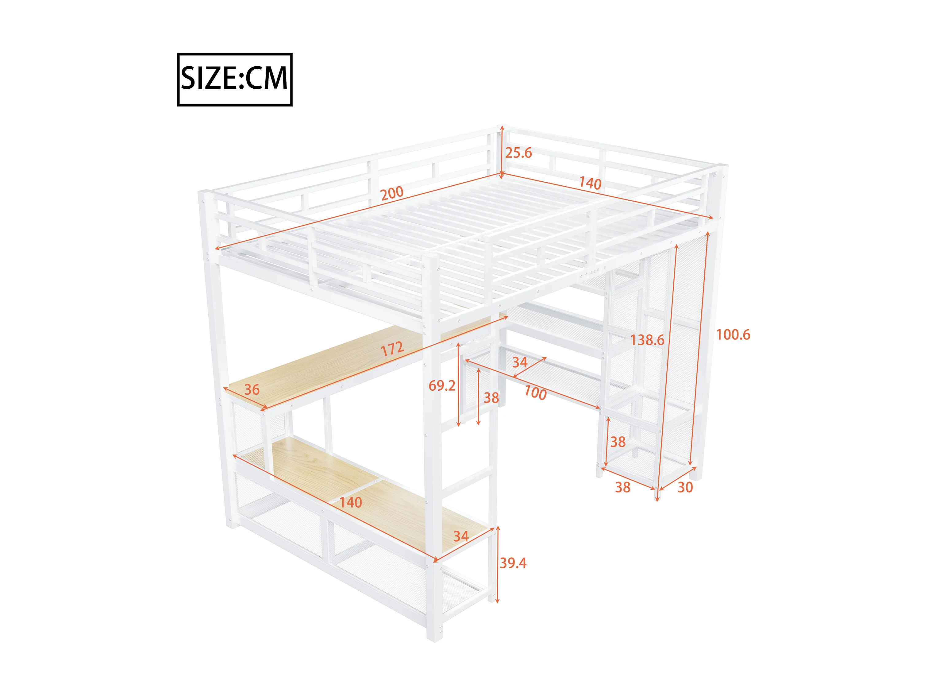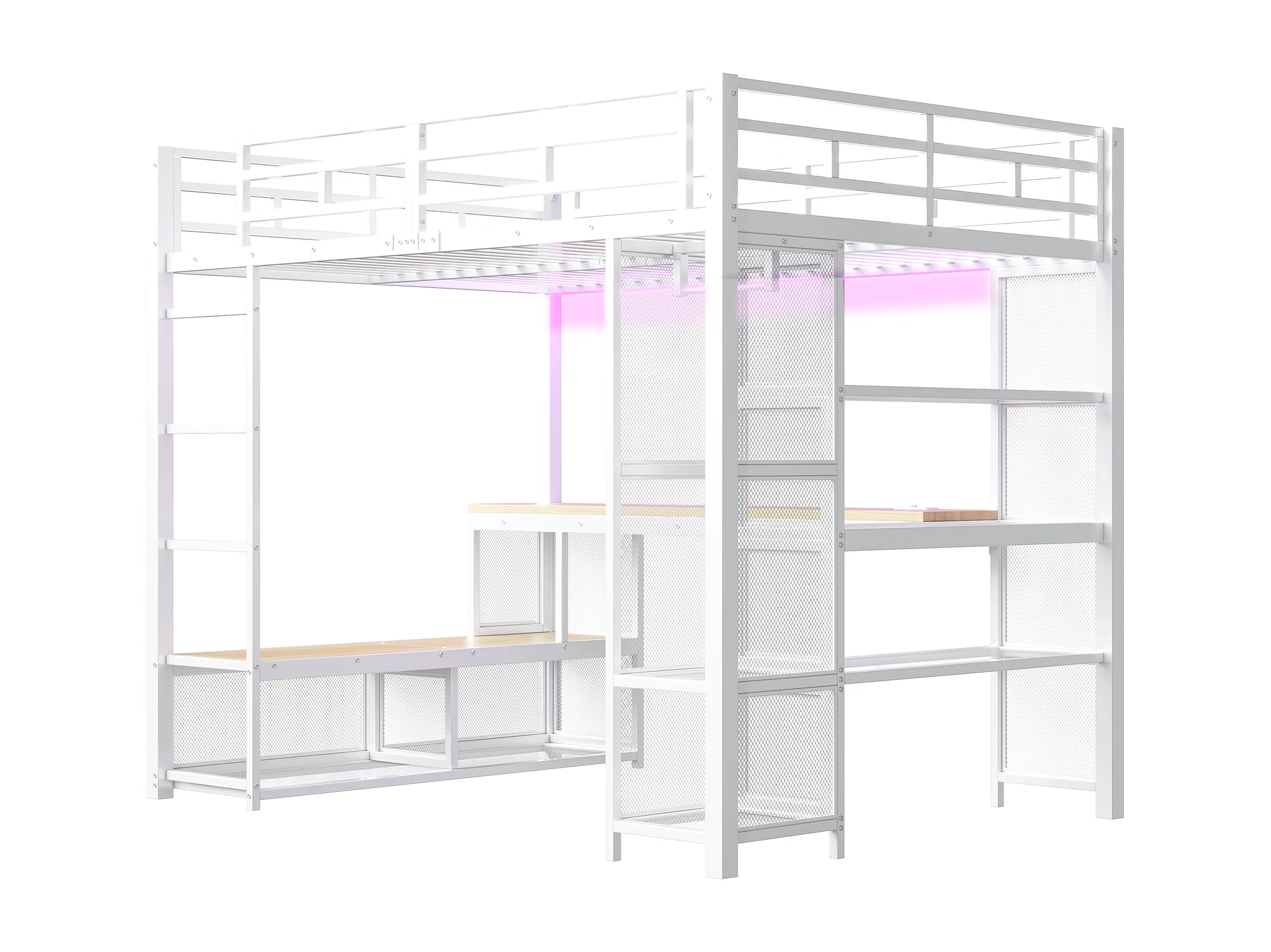 Lit mezzanine en métal 140x200 cm - avec bureau et étagères - avec penderie ouverte - Port USB et éclairage LED - Blanc (sans matelas)