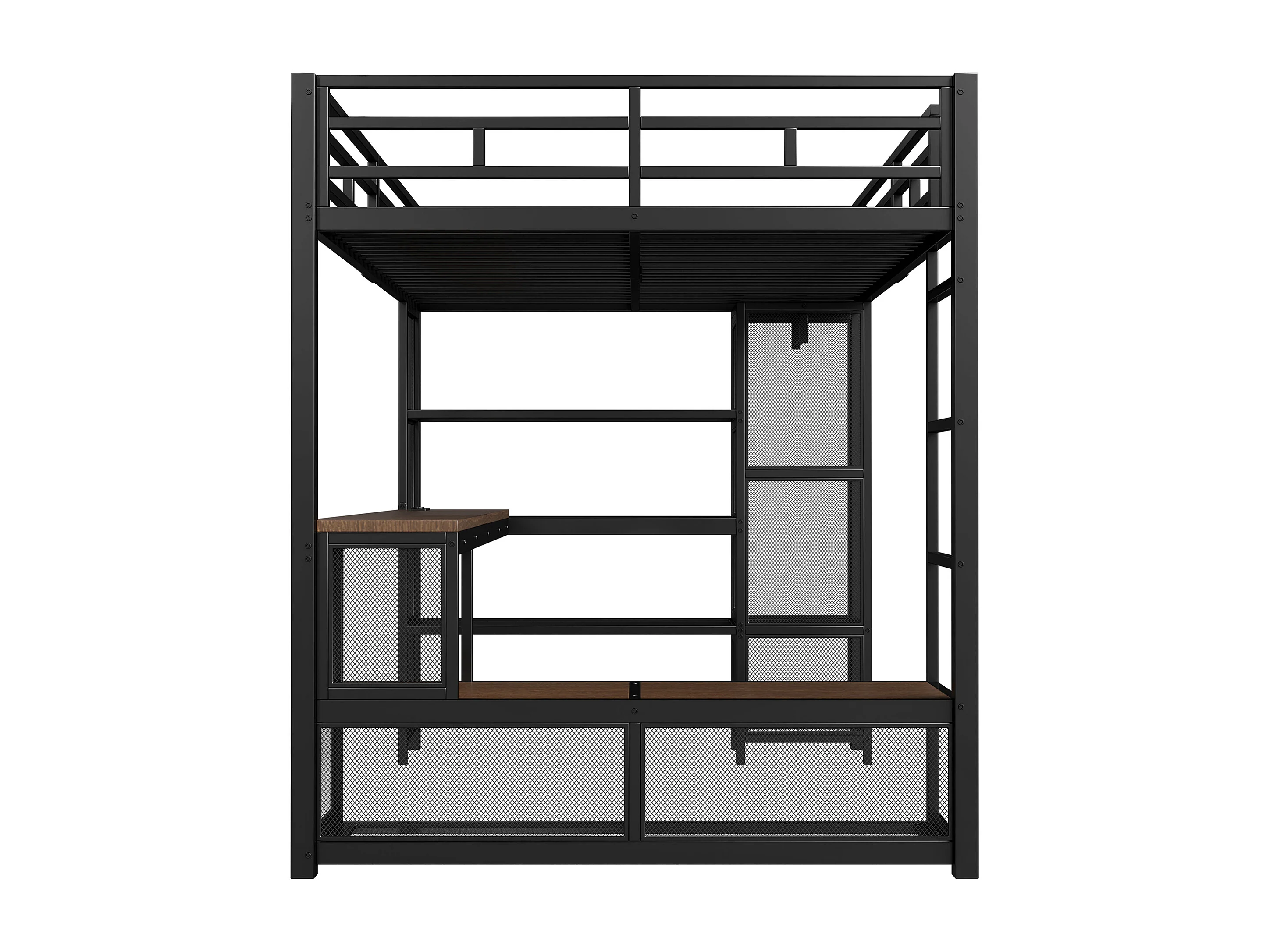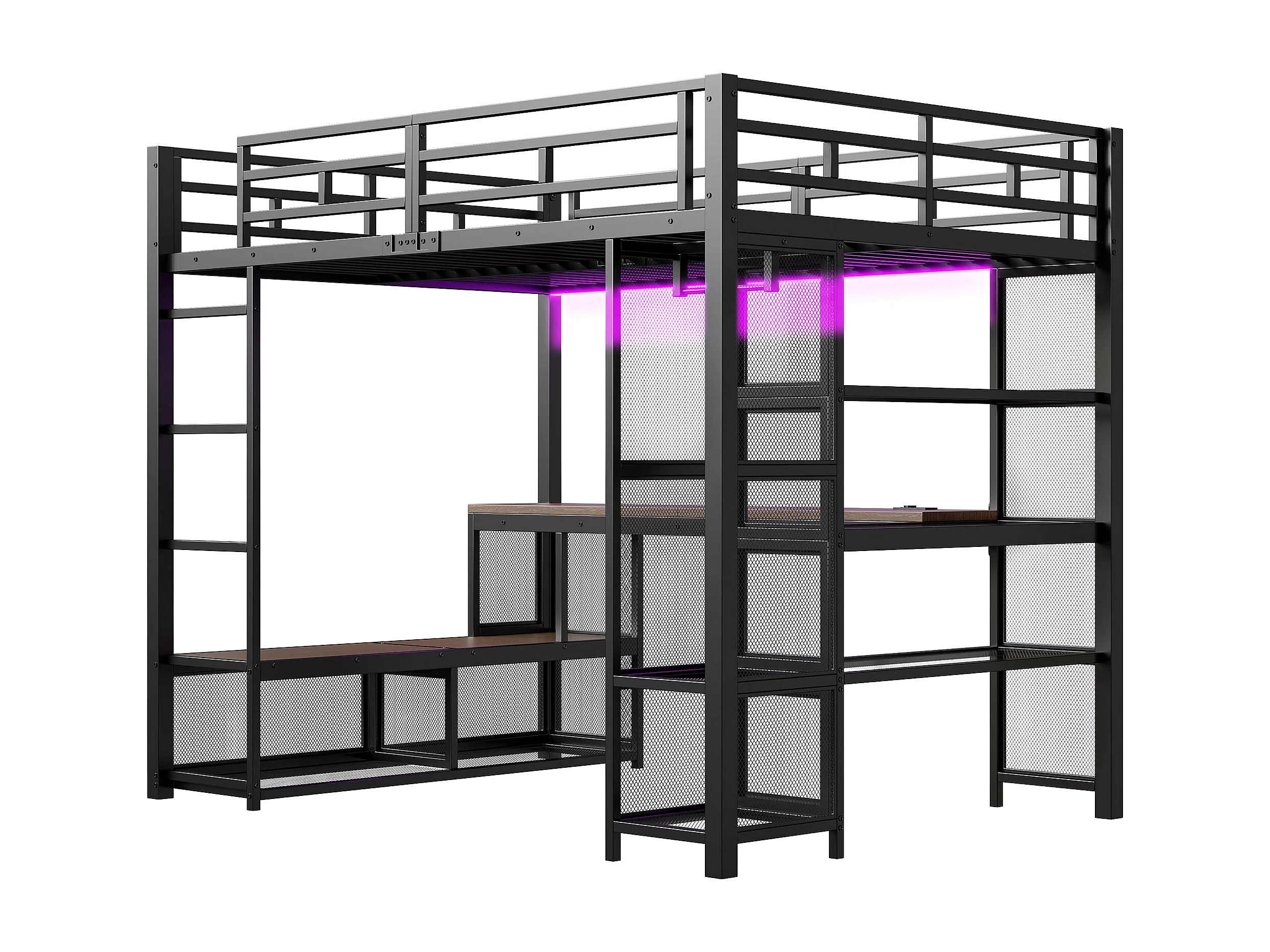 Lit mezzanine en métal 140x200 cm - avec bureau et étagères - avec penderie ouverte - Port USB et éclairage LED - Noir (sans matelas)