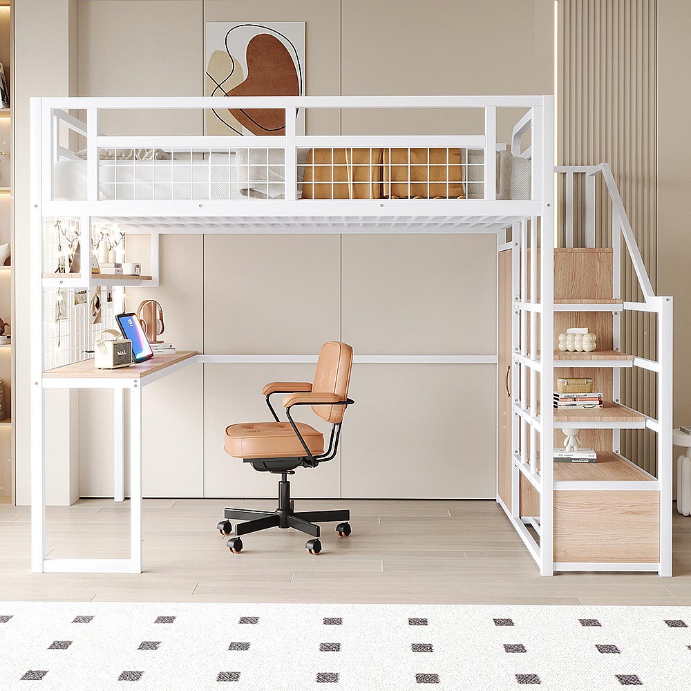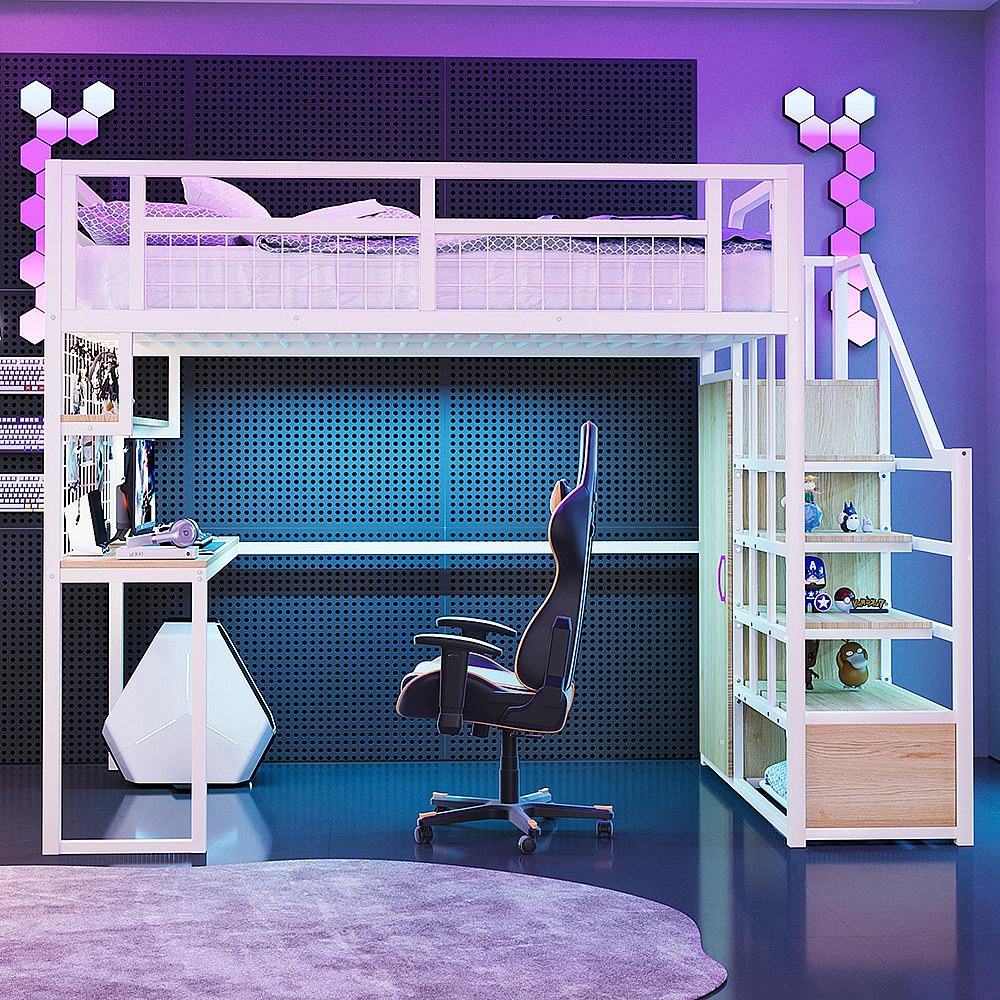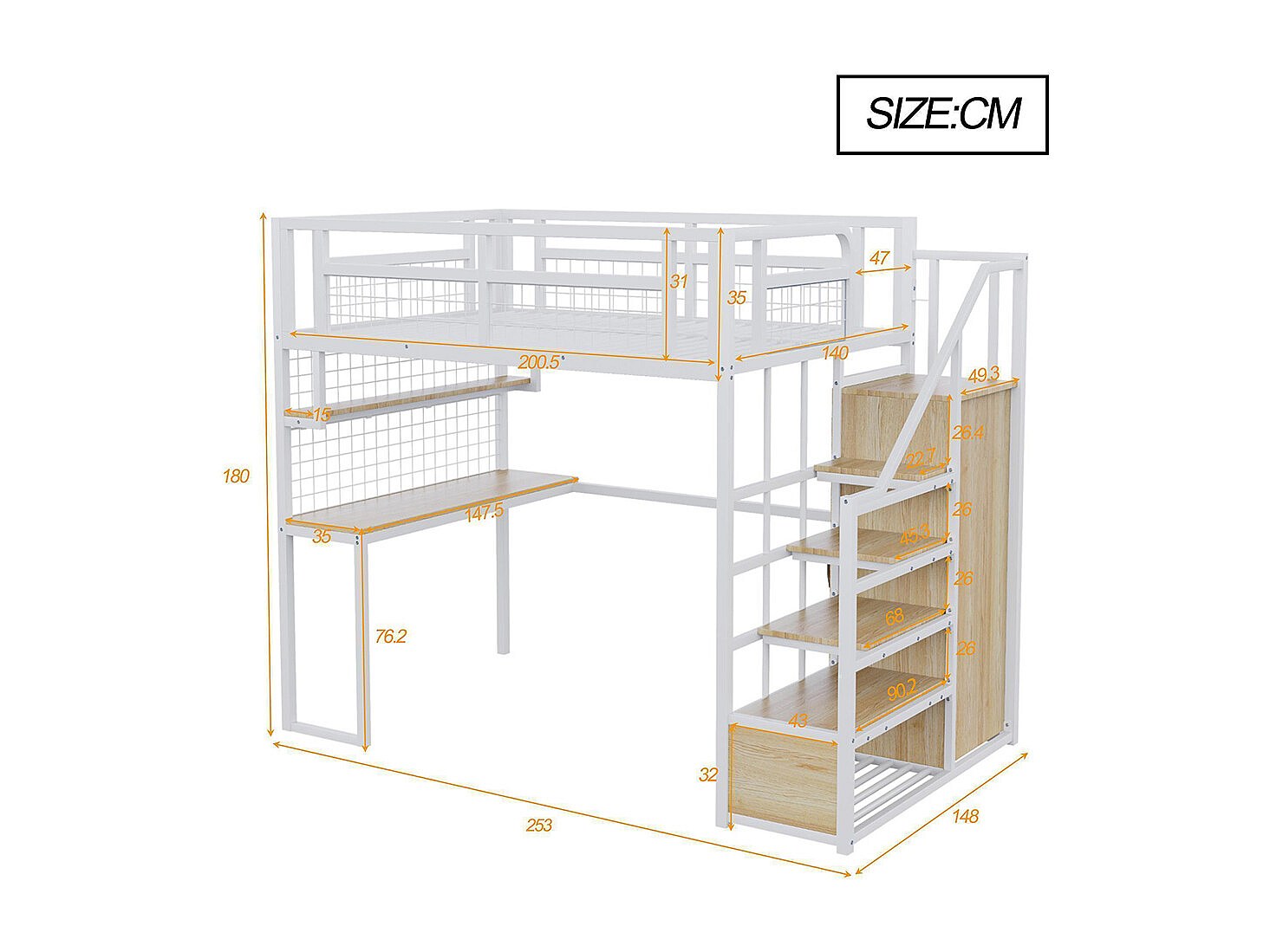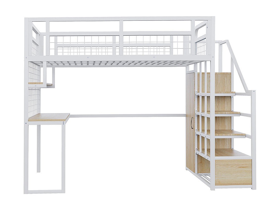 Lit mezzanine en métal 140x200 cm avec échelle rangement et armoire étagère table filet cadre stable blanc