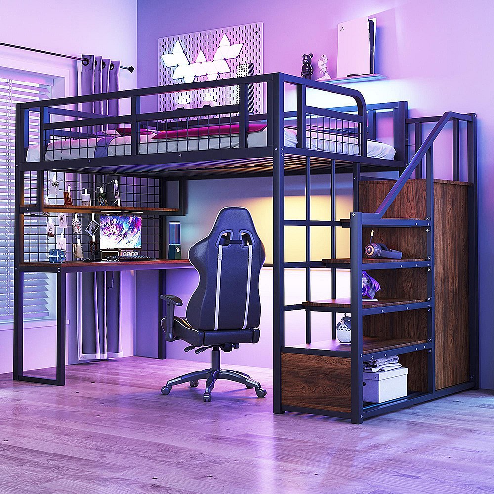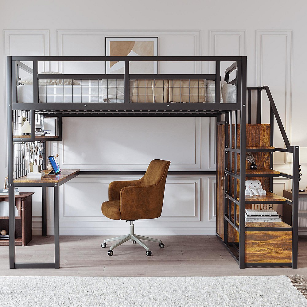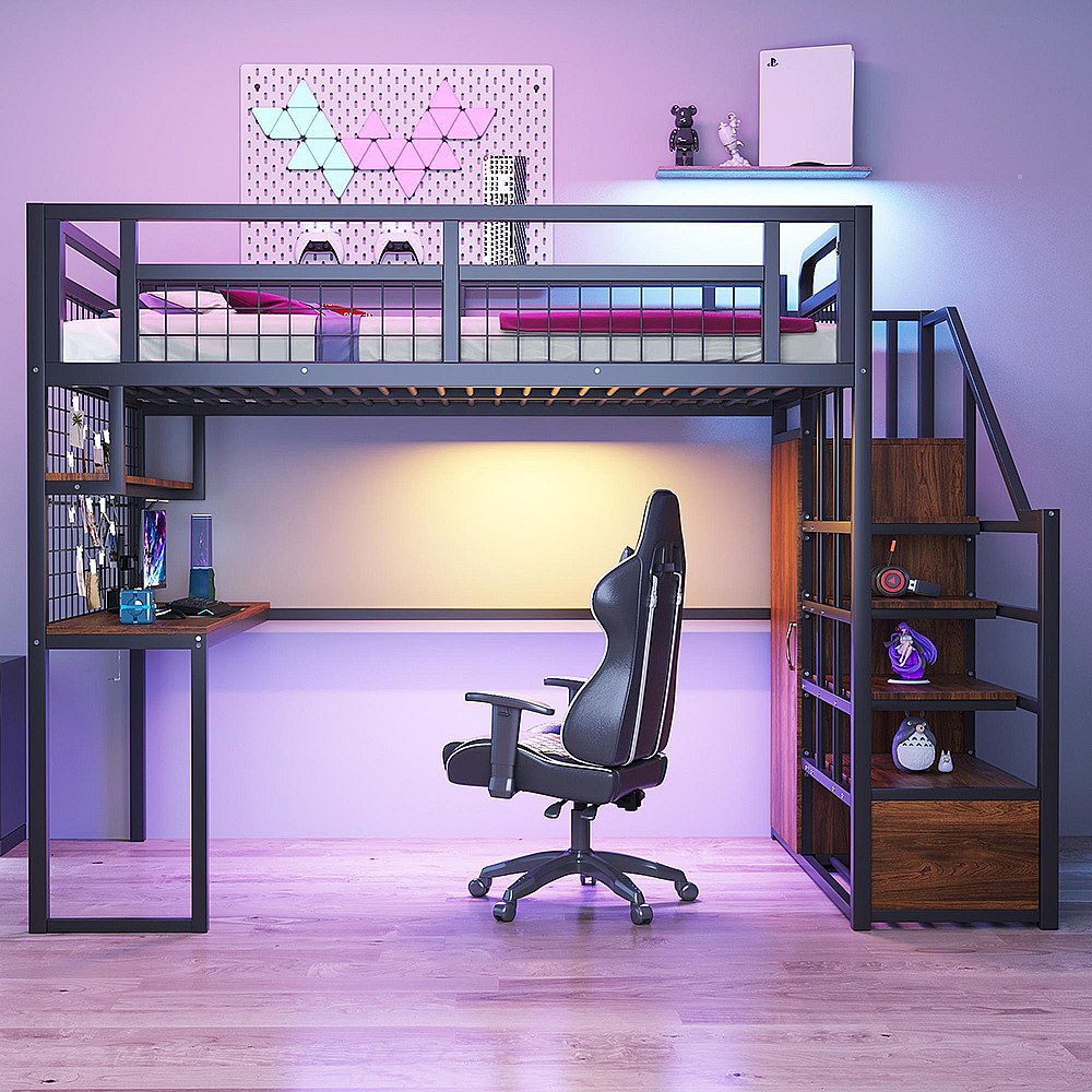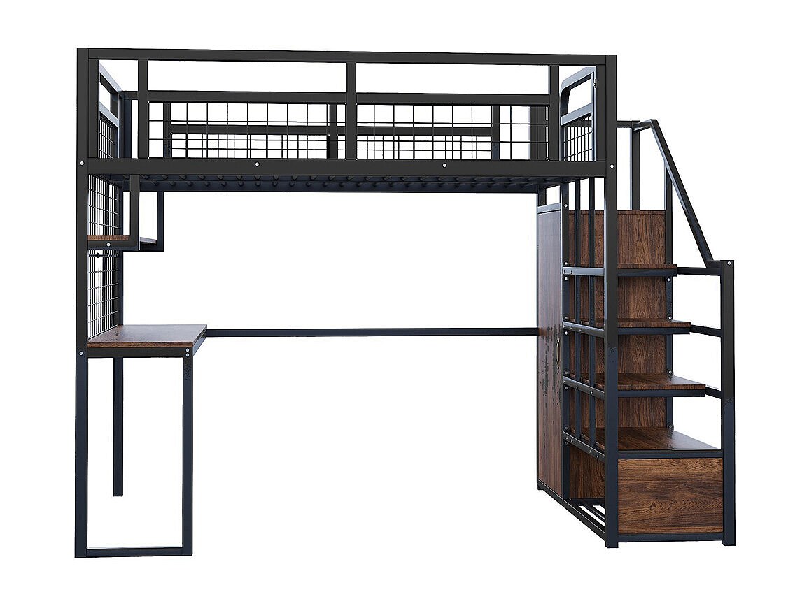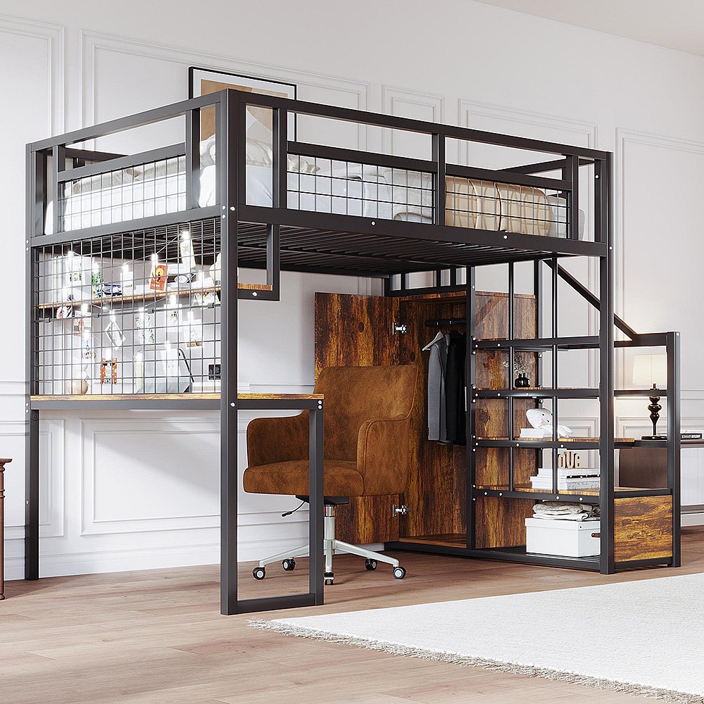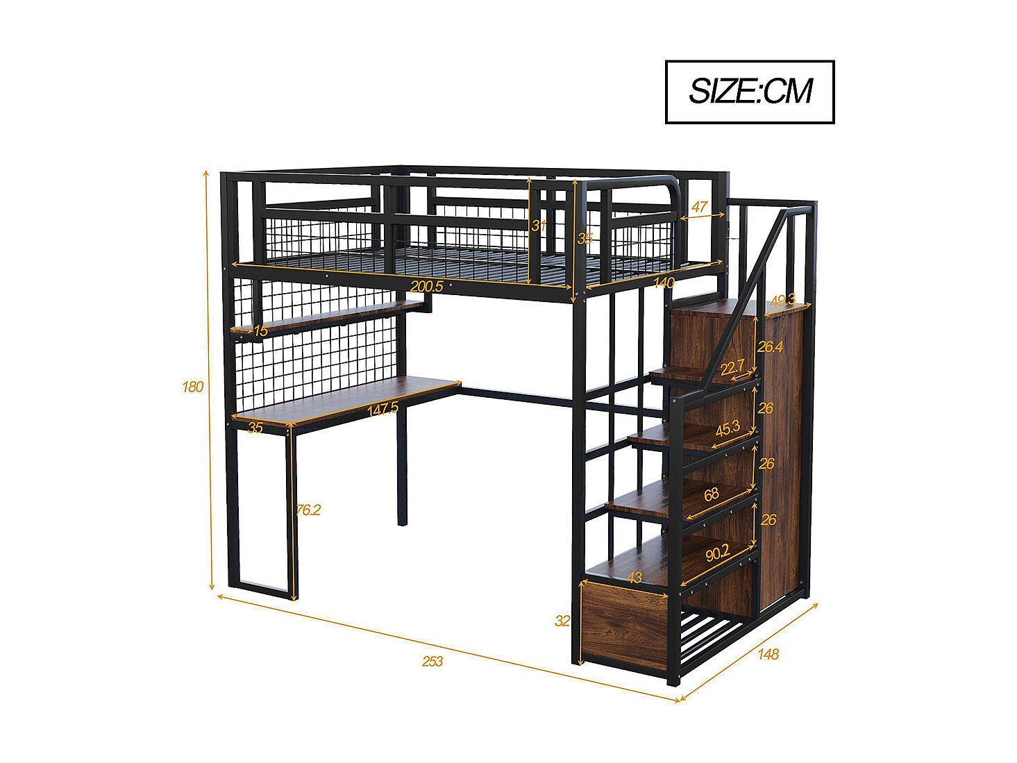 Lit mezzanine en métal 140x200 cm avec échelle rangement et armoire étagère table filet cadre stable noir