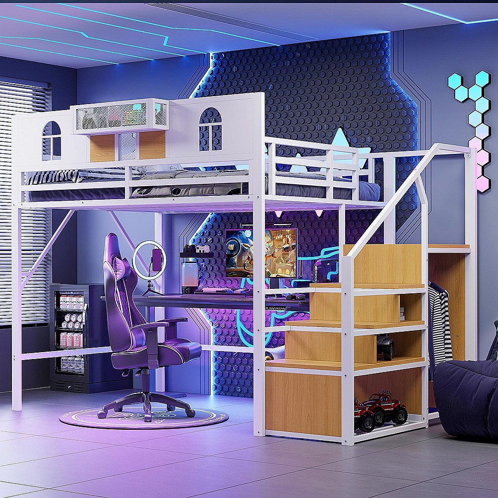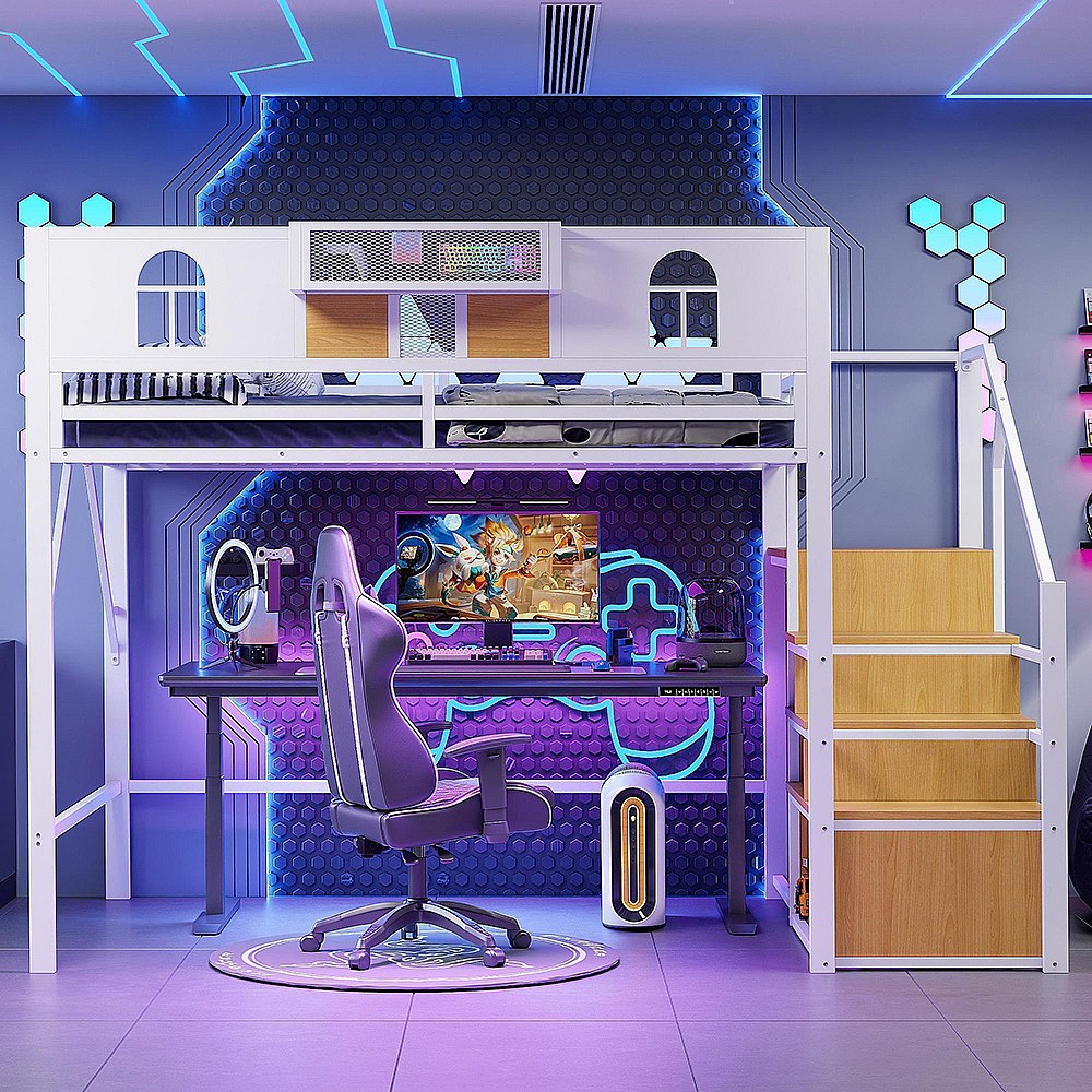 Lit mezzanine en métal 140x200 cm avec échelle rangement fenêtre panneaux bois tissu maillé barrière surélevée espace rangement cadre stable blanc
