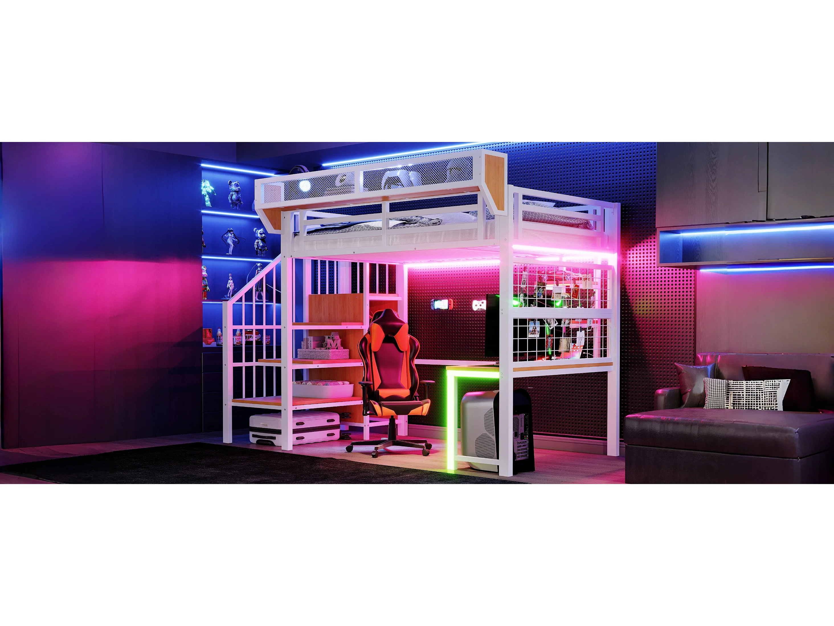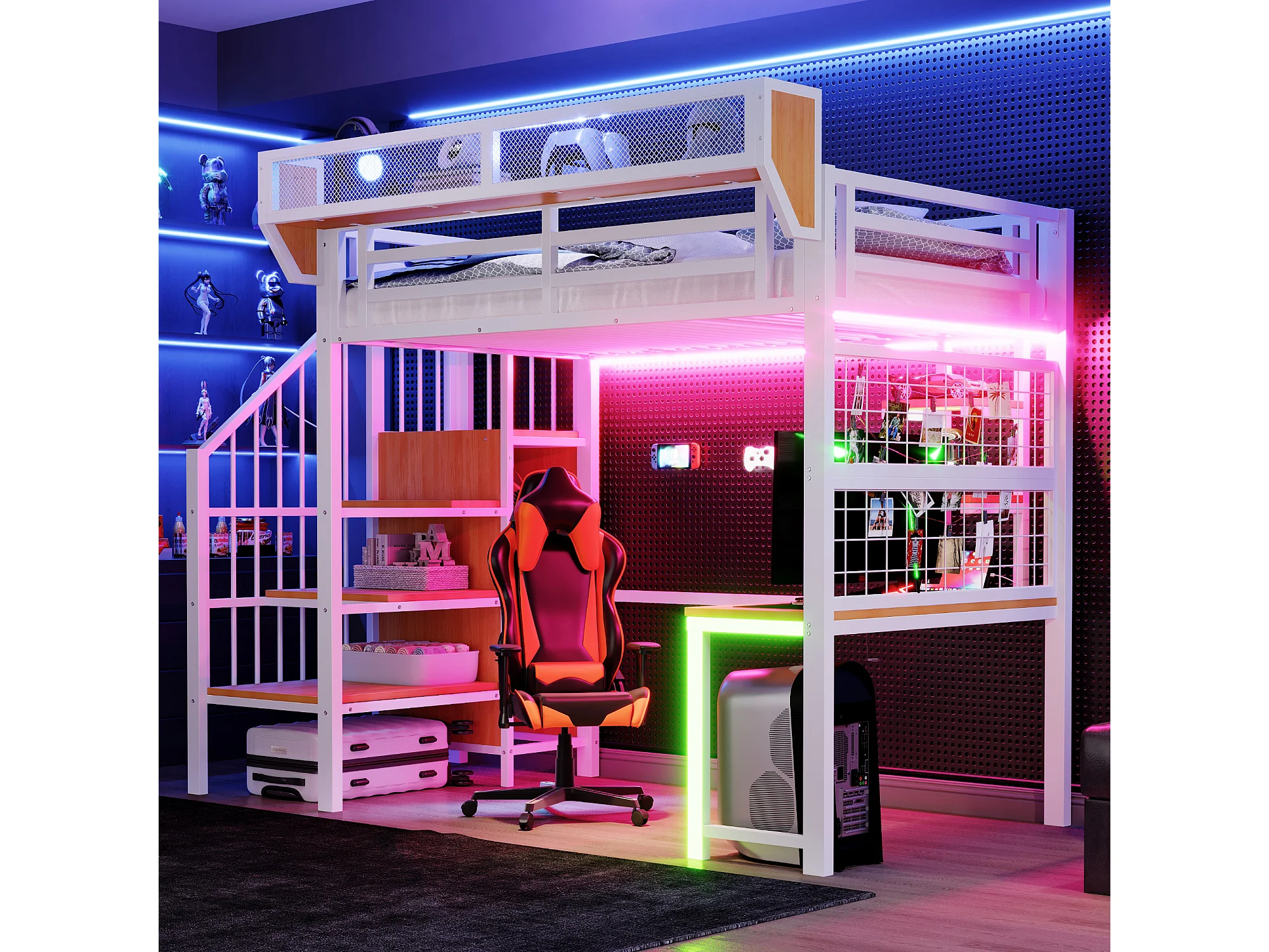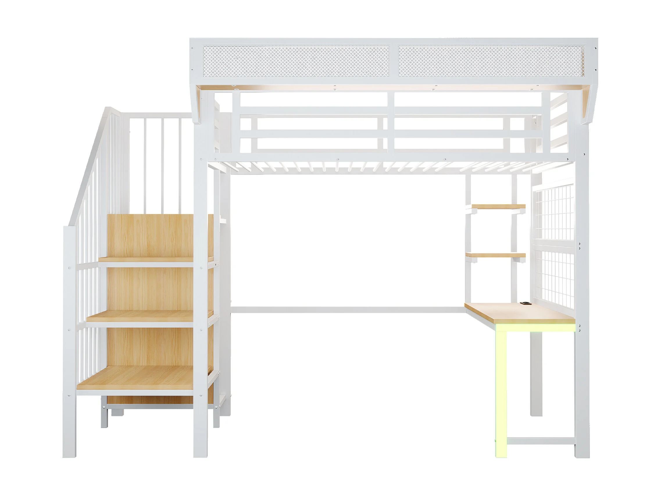 Lit mezzanine en métal - 90 x 200 cm - avec bureau + étagère et filet de rangement + échelle de rangement + Leds + prise - blanc