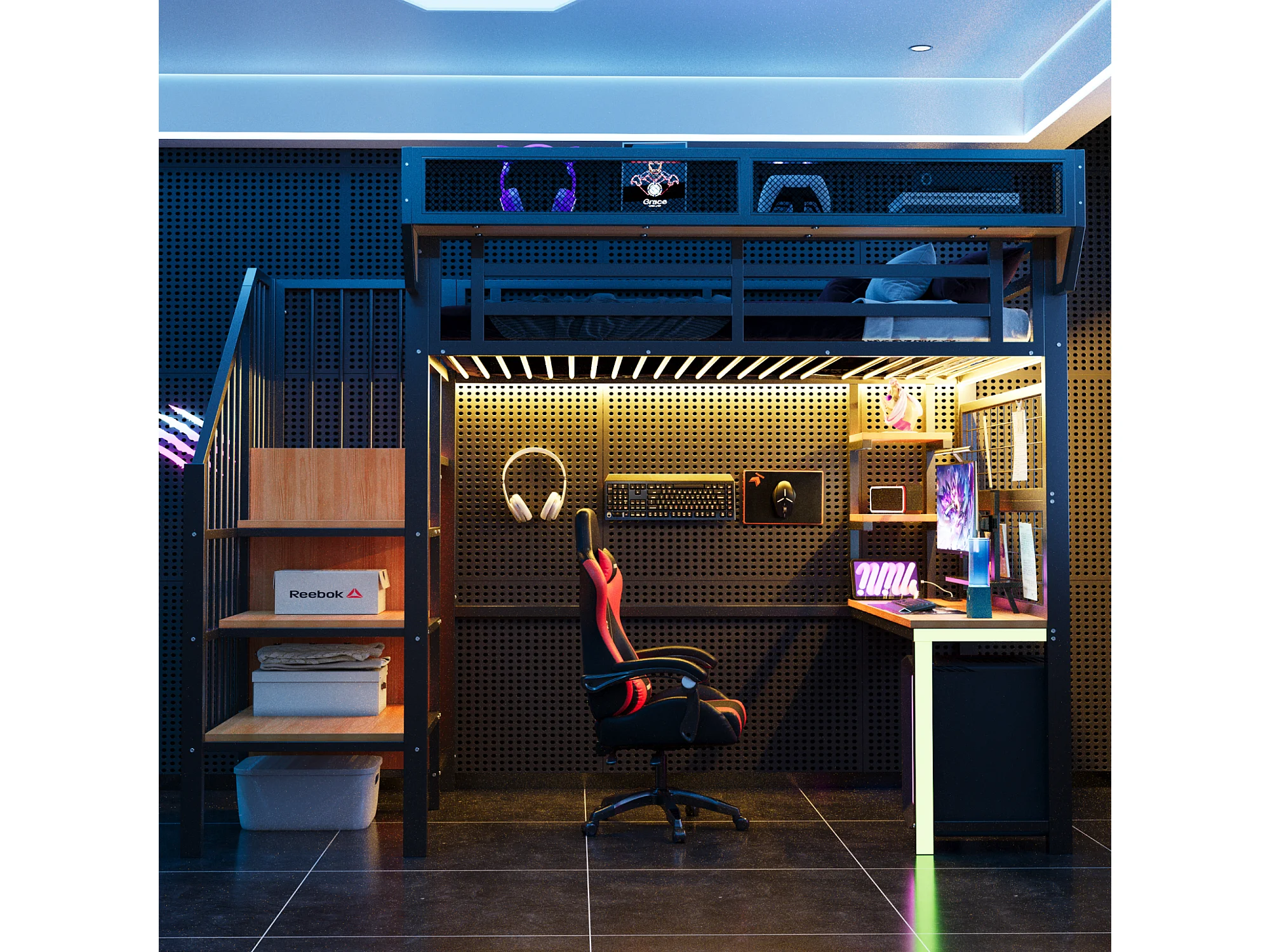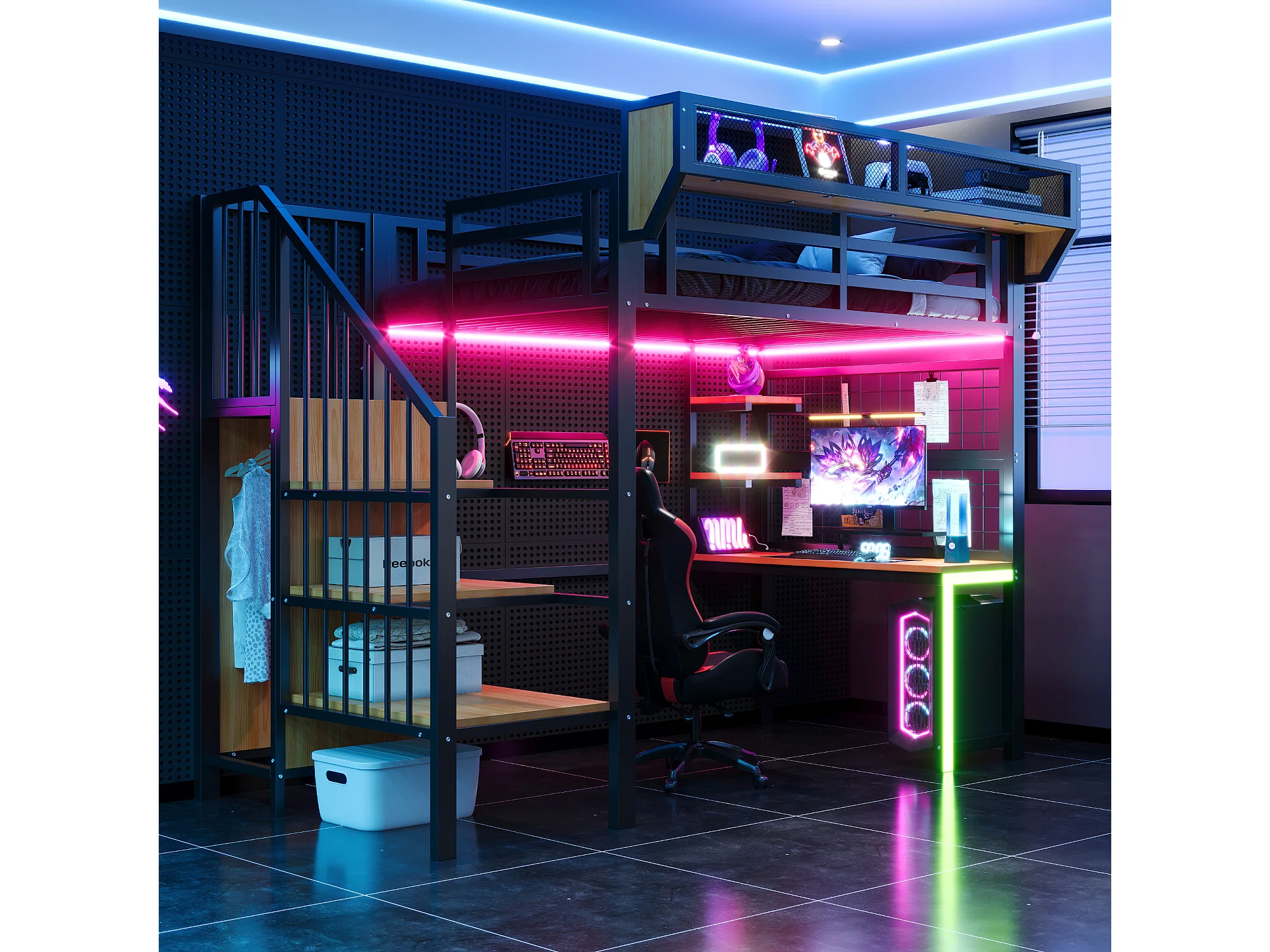 Lit mezzanine en métal - 90 x 200 cm - avec bureau + étagère et filet de rangement + échelle de rangement + Leds + prise - noir
