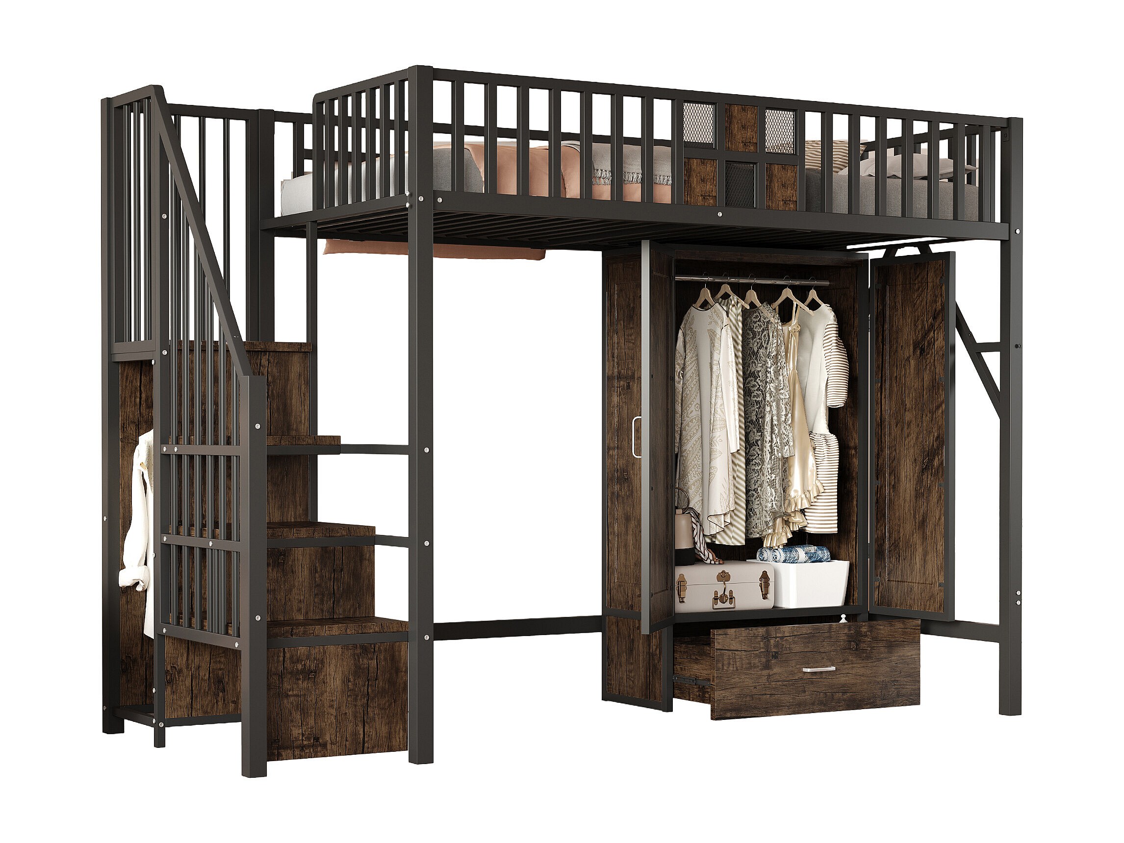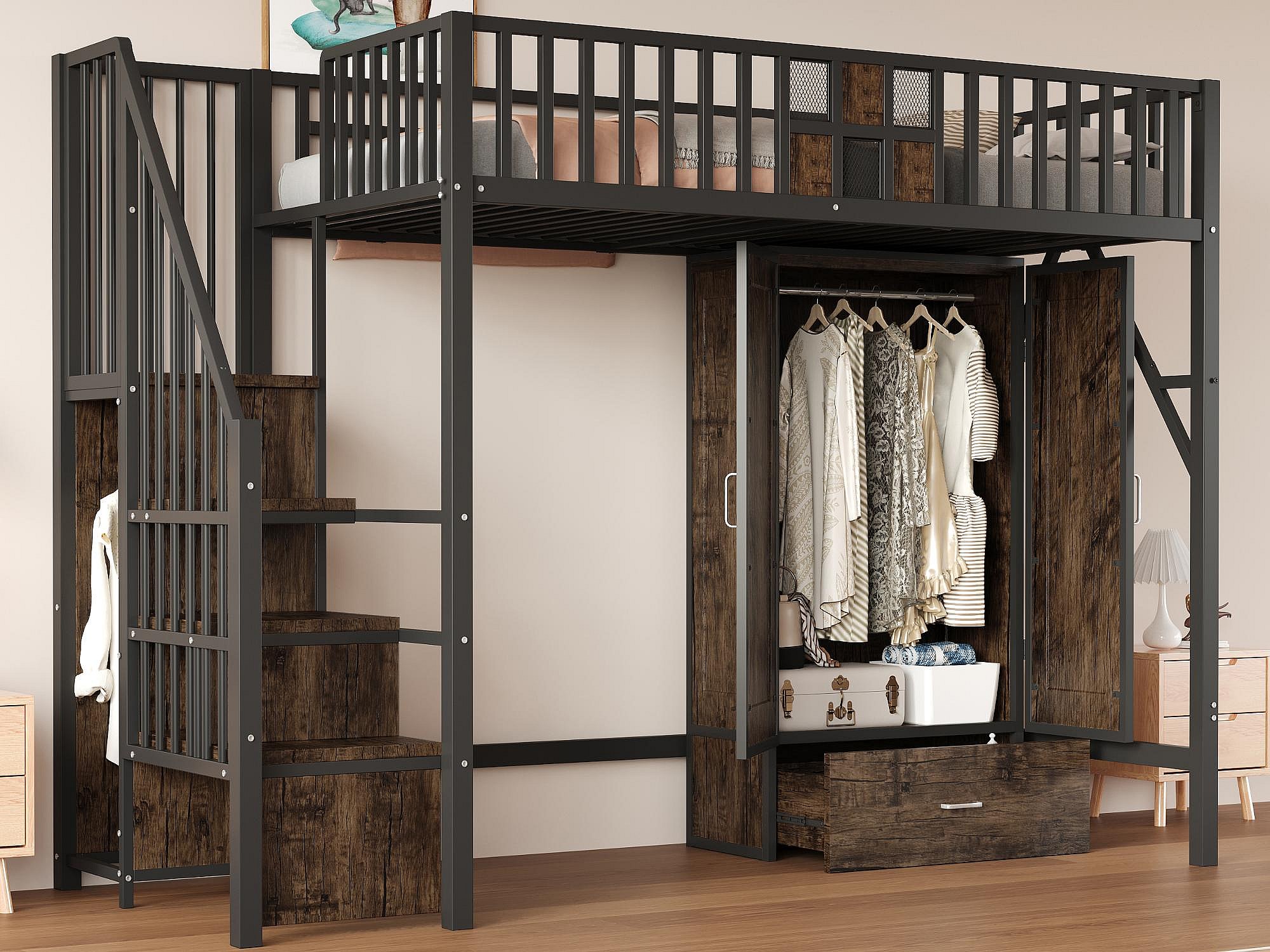 Lit mezzanine en métal 90x200 cm - avec penderie - 1 tiroir - avec échelle de rangement - noir (matelas non inclus)