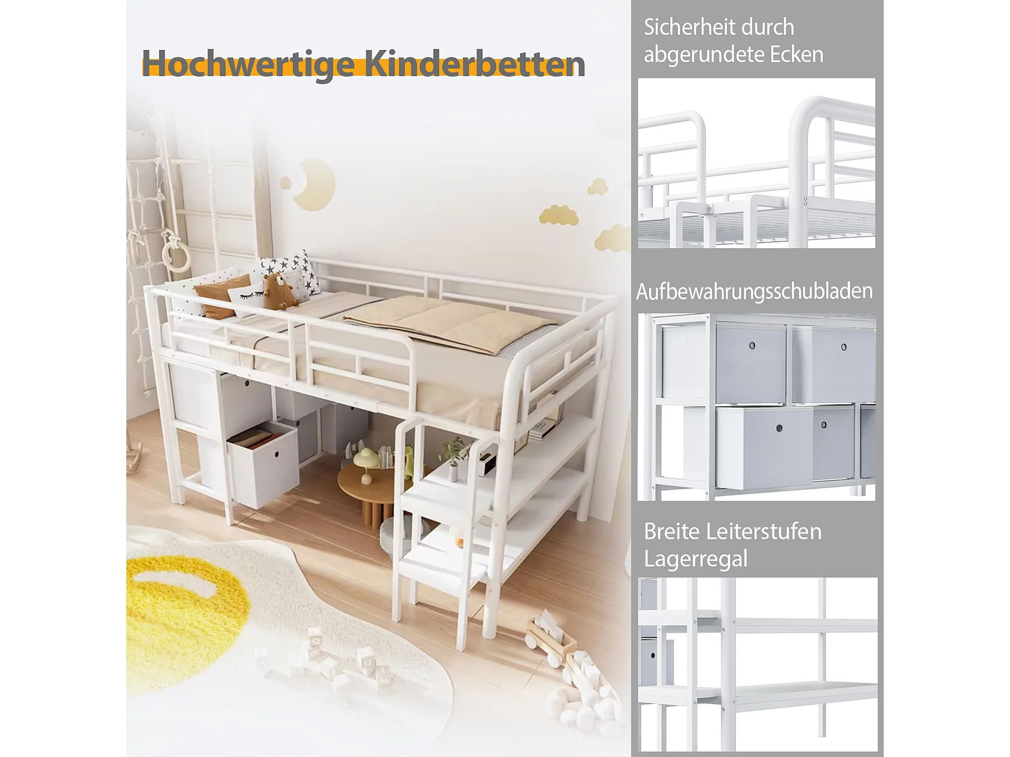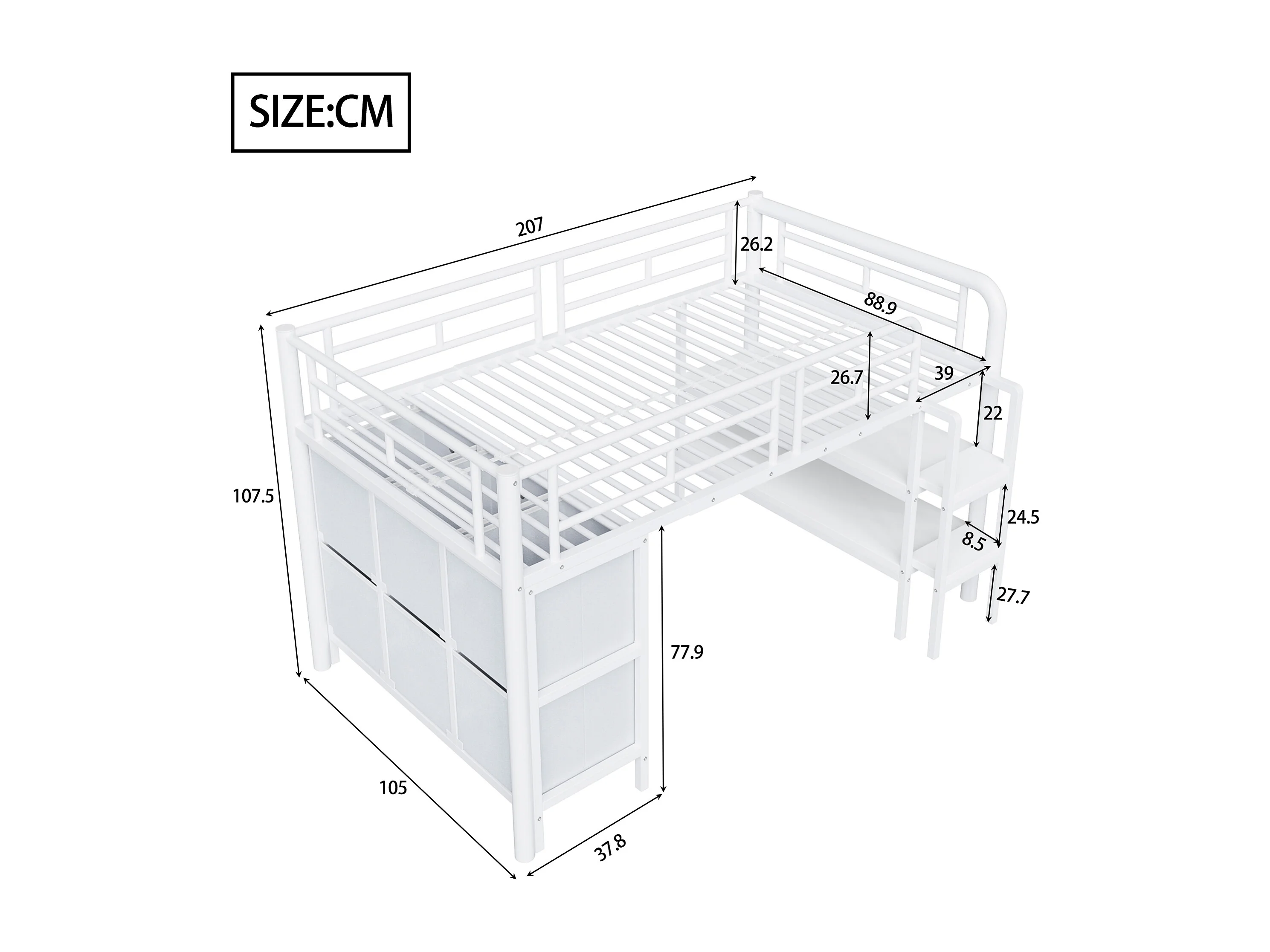 Lit mezzanine en métal enfant - 90 x 200 cm - avec escalier large + tiroirs + étagères de rangement - métal - blanc