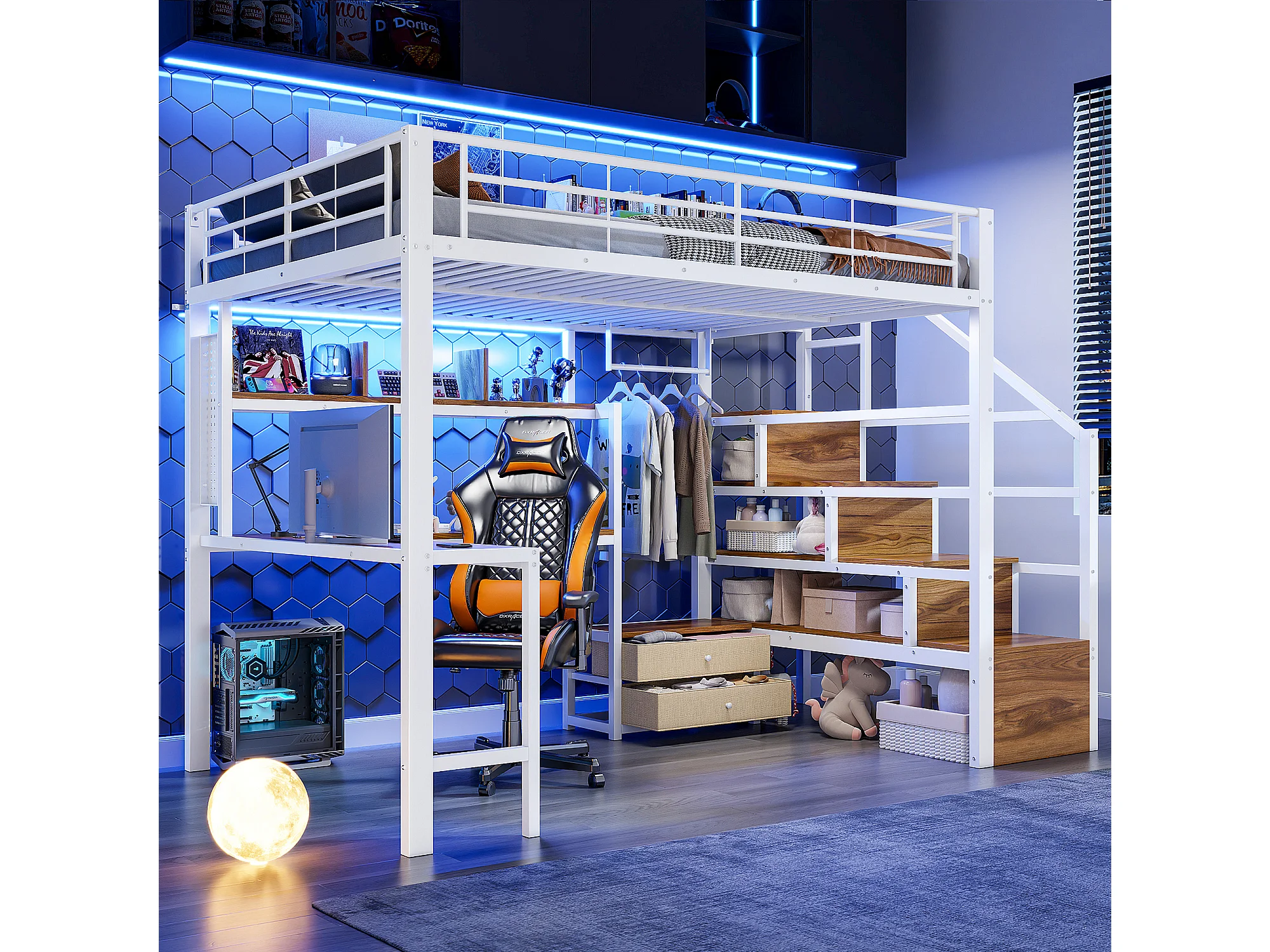 Lit mezzanine en métal pour enfant - 140 x 200 cm - avec 2 tiroirs + penderie + Leds + bureau + escalier de rangement - blanc