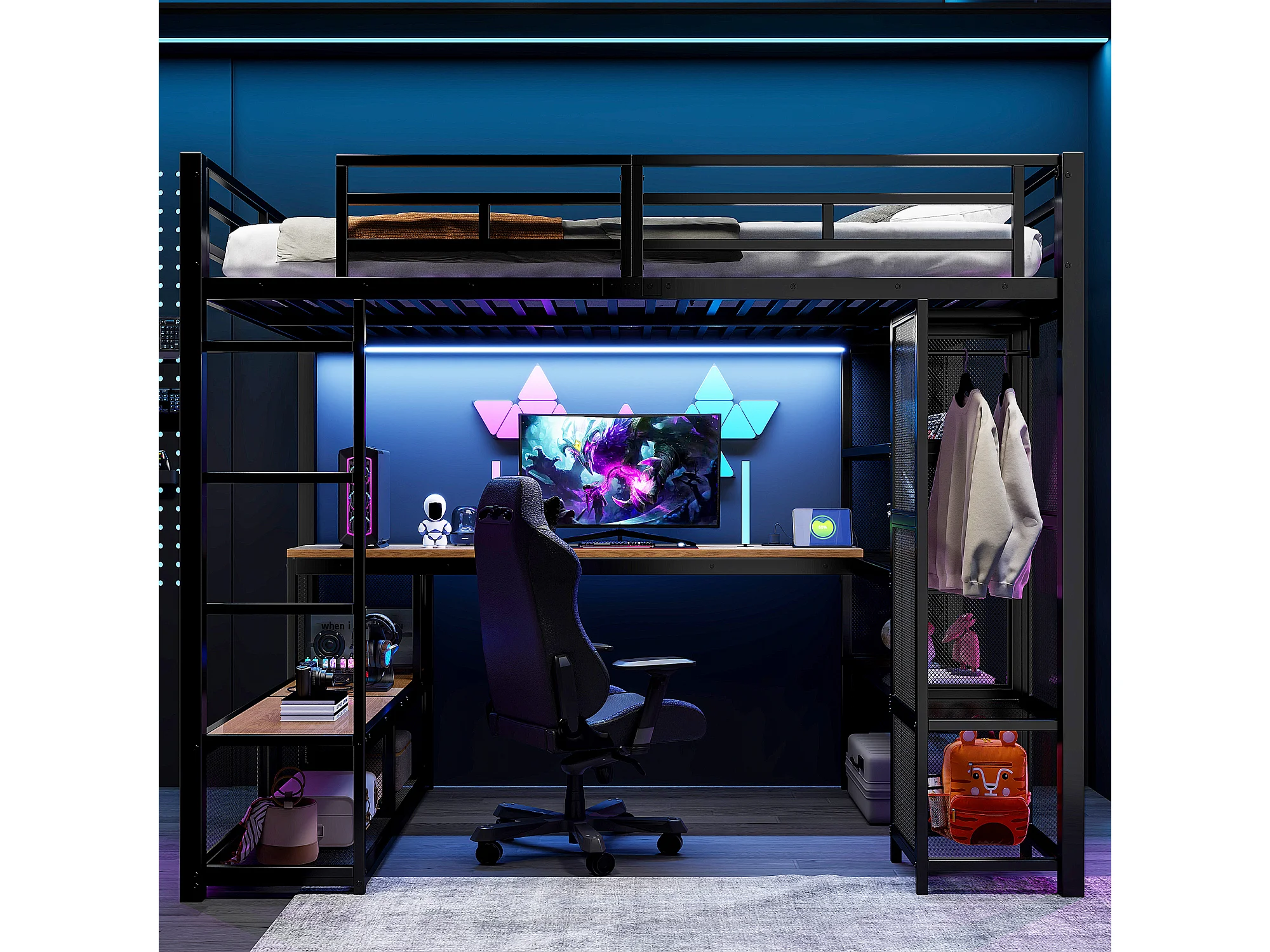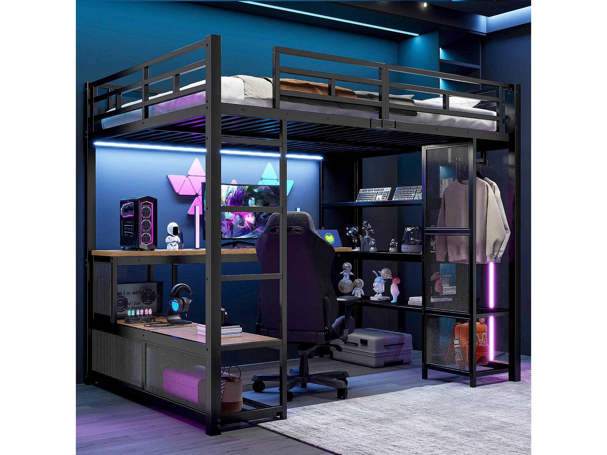 Lit mezzanine en métal pour enfant - 140 x 200 cm - avec bureau + étagère de rangement + penderie ouverte + USB + Leds - noir
