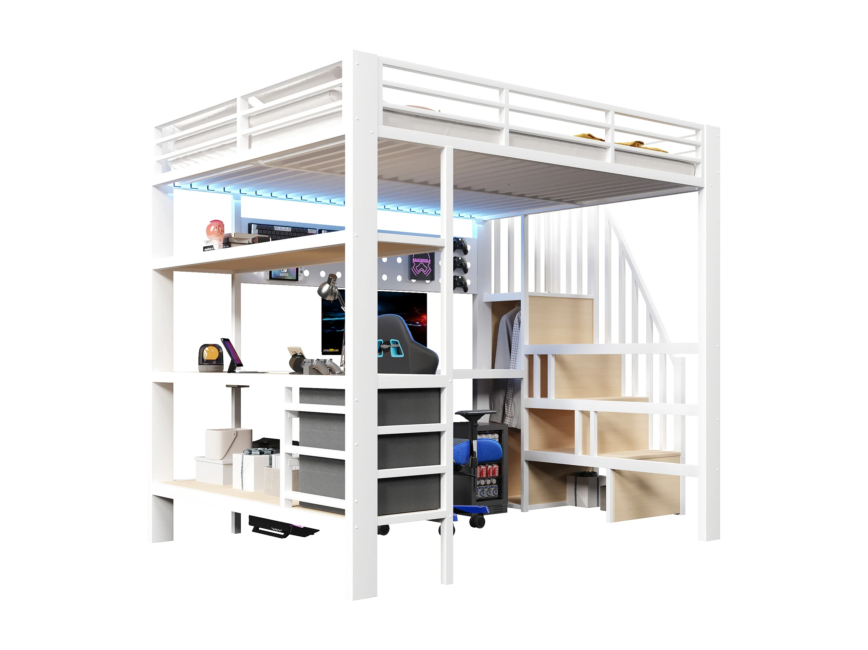 Lit mezzanine en métal pour enfant - 140 x 200 cm - avec étagères + tiroirs + bureau + escalier de rangement + Leds - blanc