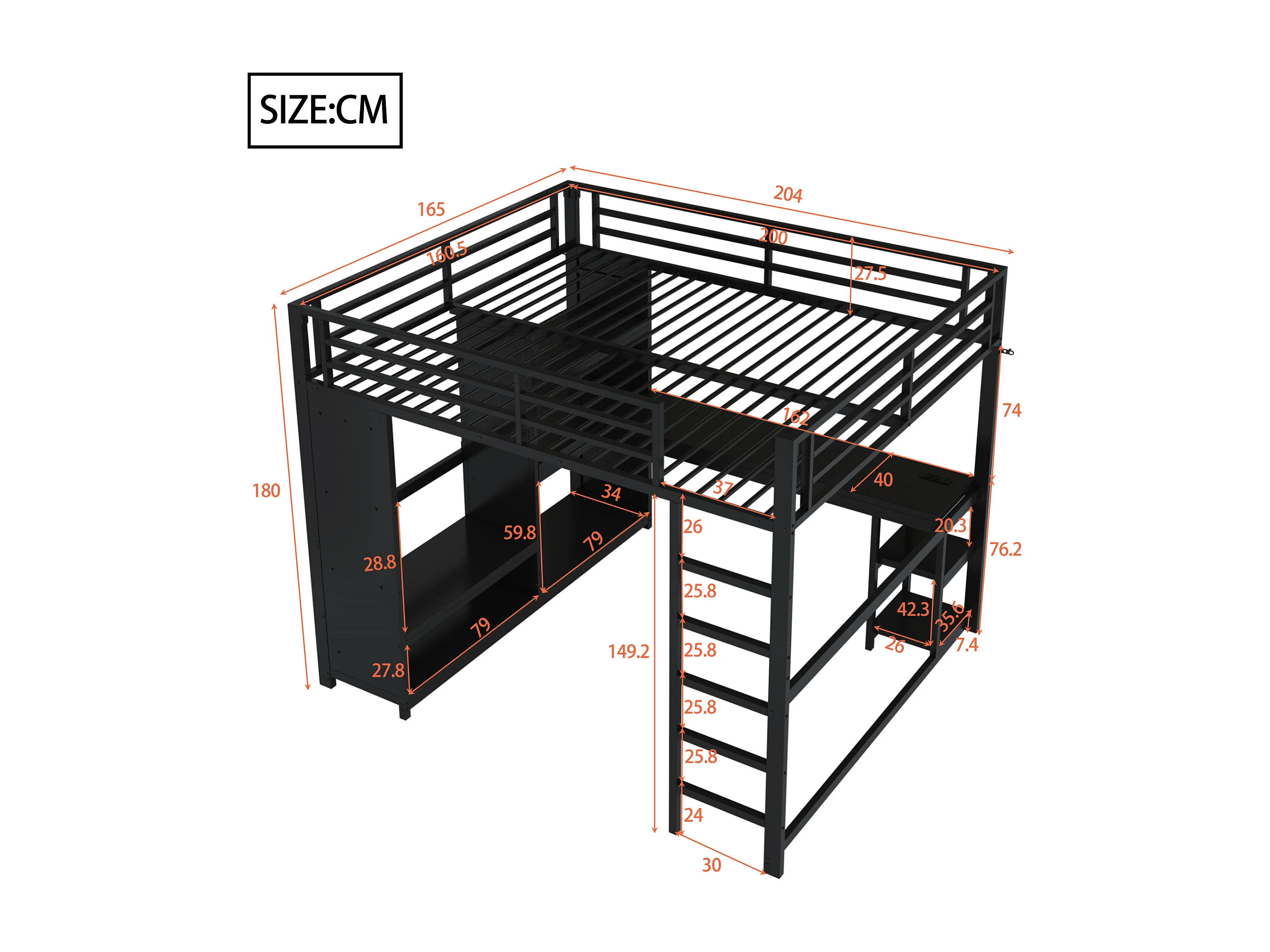 Lit mezzanine en métal pour enfant - 160 x 200 cm - avec Leds + bureau + armoire + rangements - métal - noir
