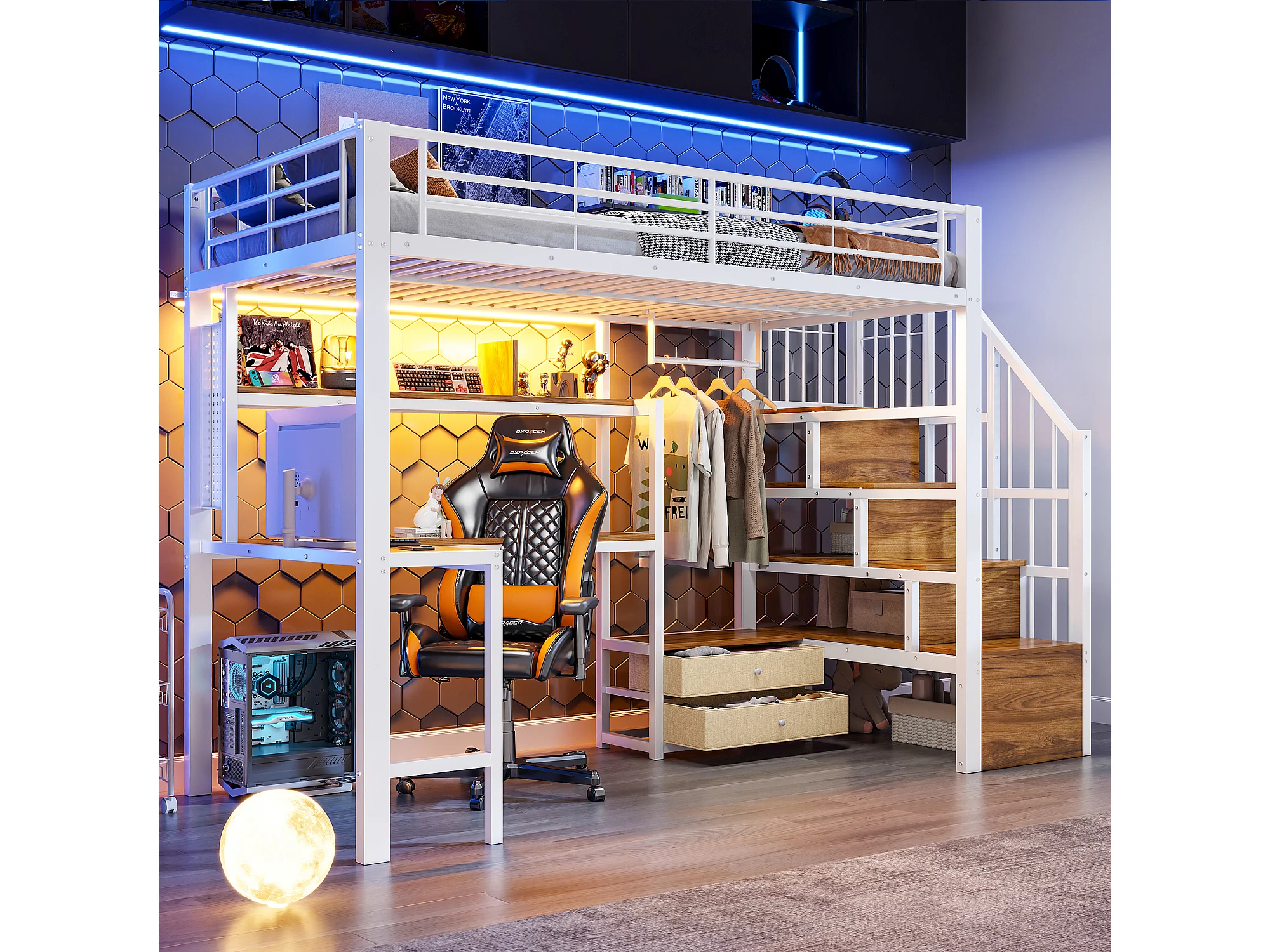 Lit mezzanine en métal pour enfant - 90 x 200 cm - avec 2 tiroirs + penderie + Leds + bureau + escalier de rangement - blanc