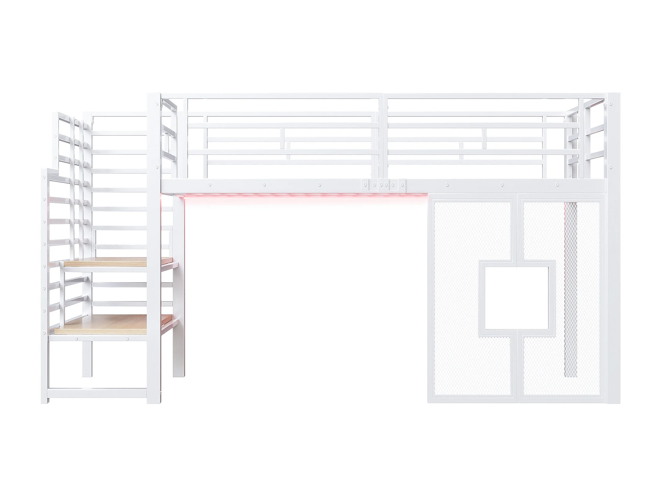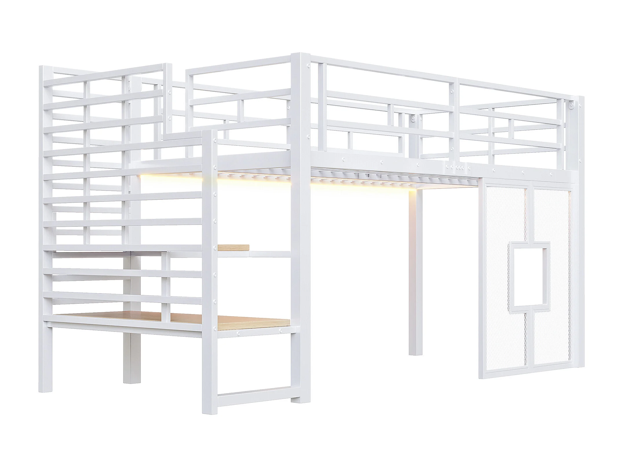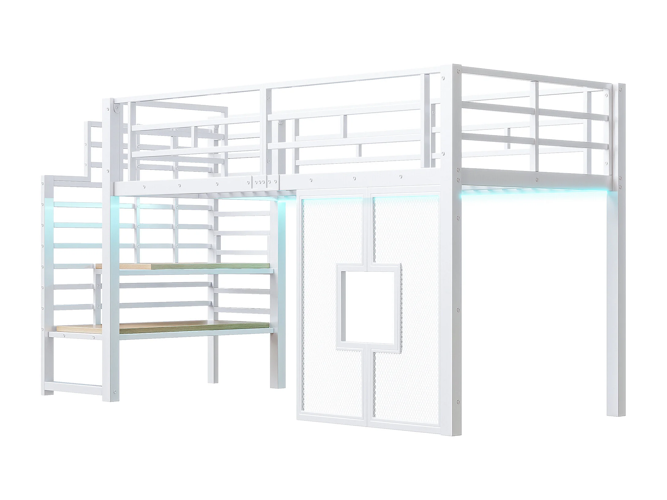 Lit mezzanine en métal pour enfant - 90 x 200 cm - avec escalier + rangement + Leds + fenêtres - blanc