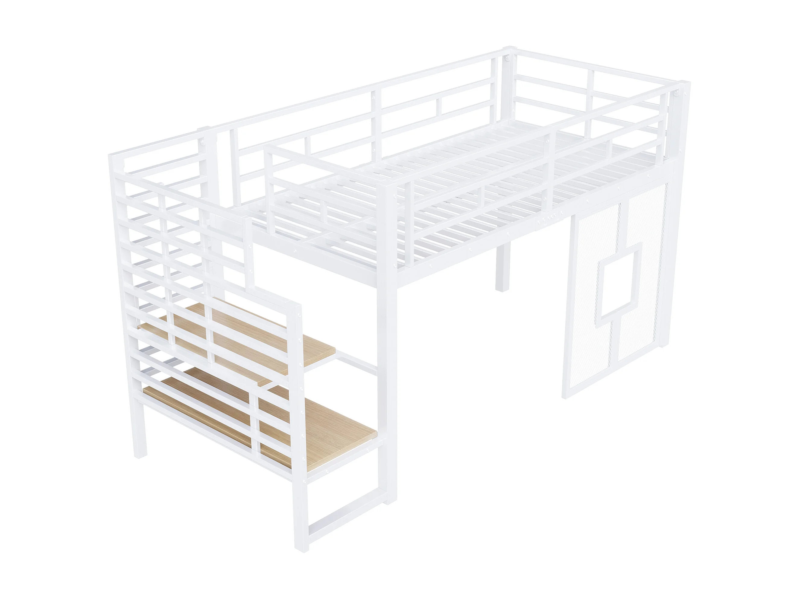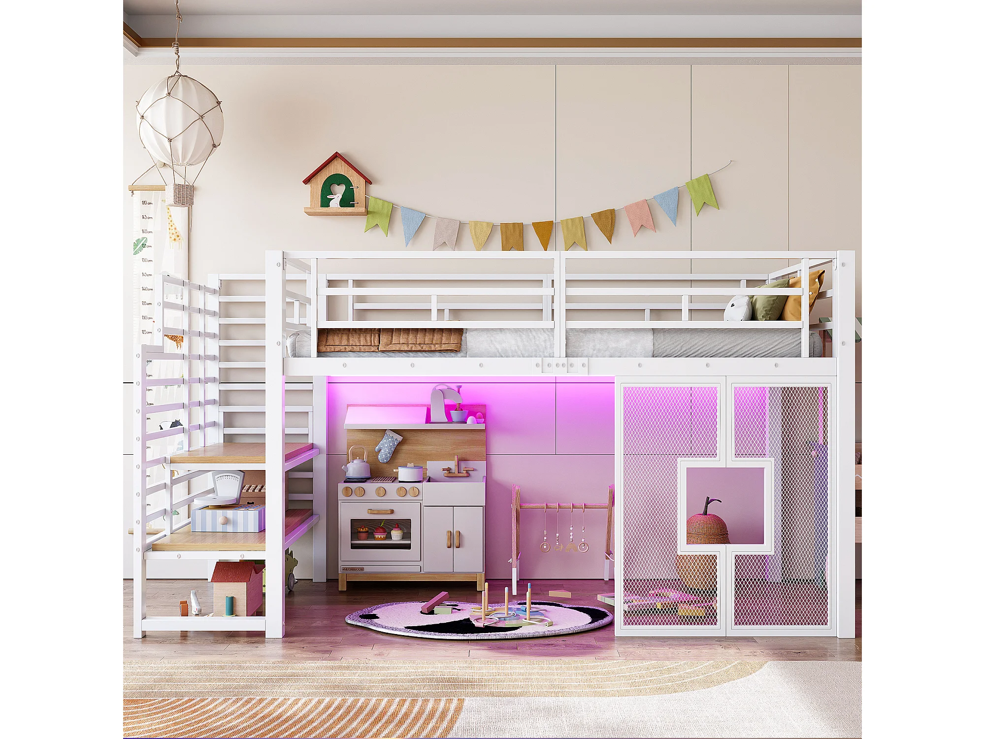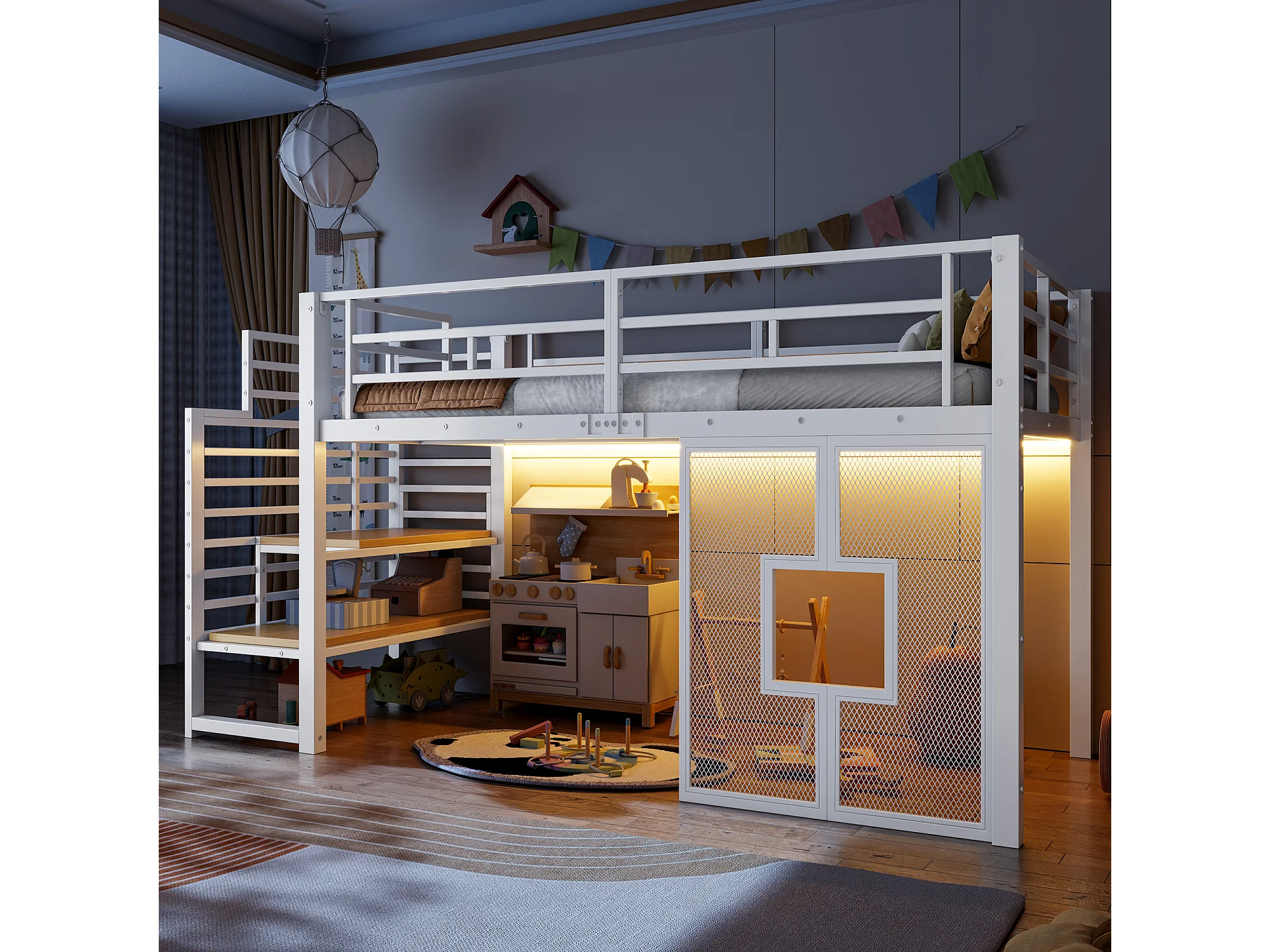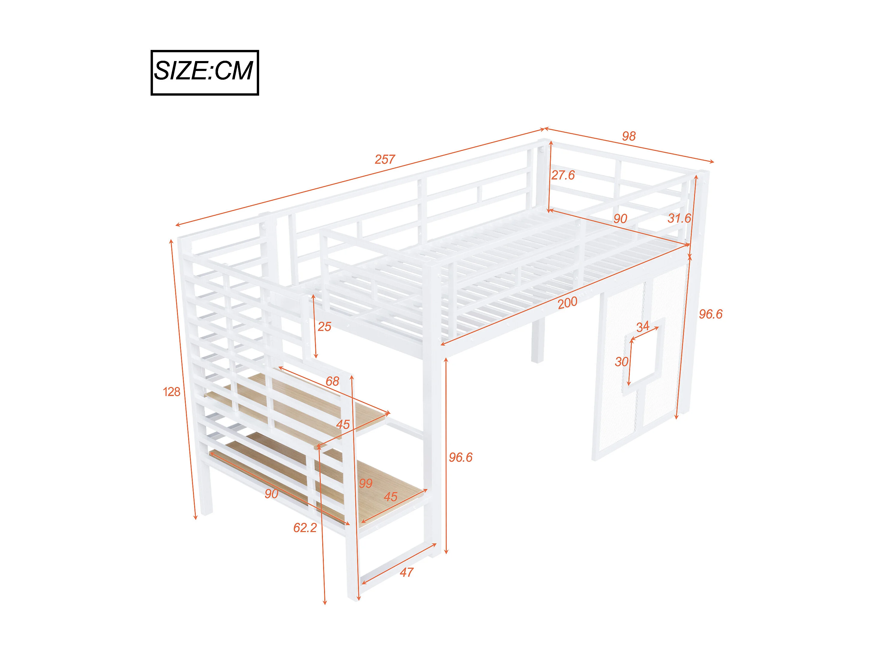 Lit mezzanine en métal pour enfant - 90 x 200 cm - avec escalier + rangement + Leds + fenêtres - blanc
