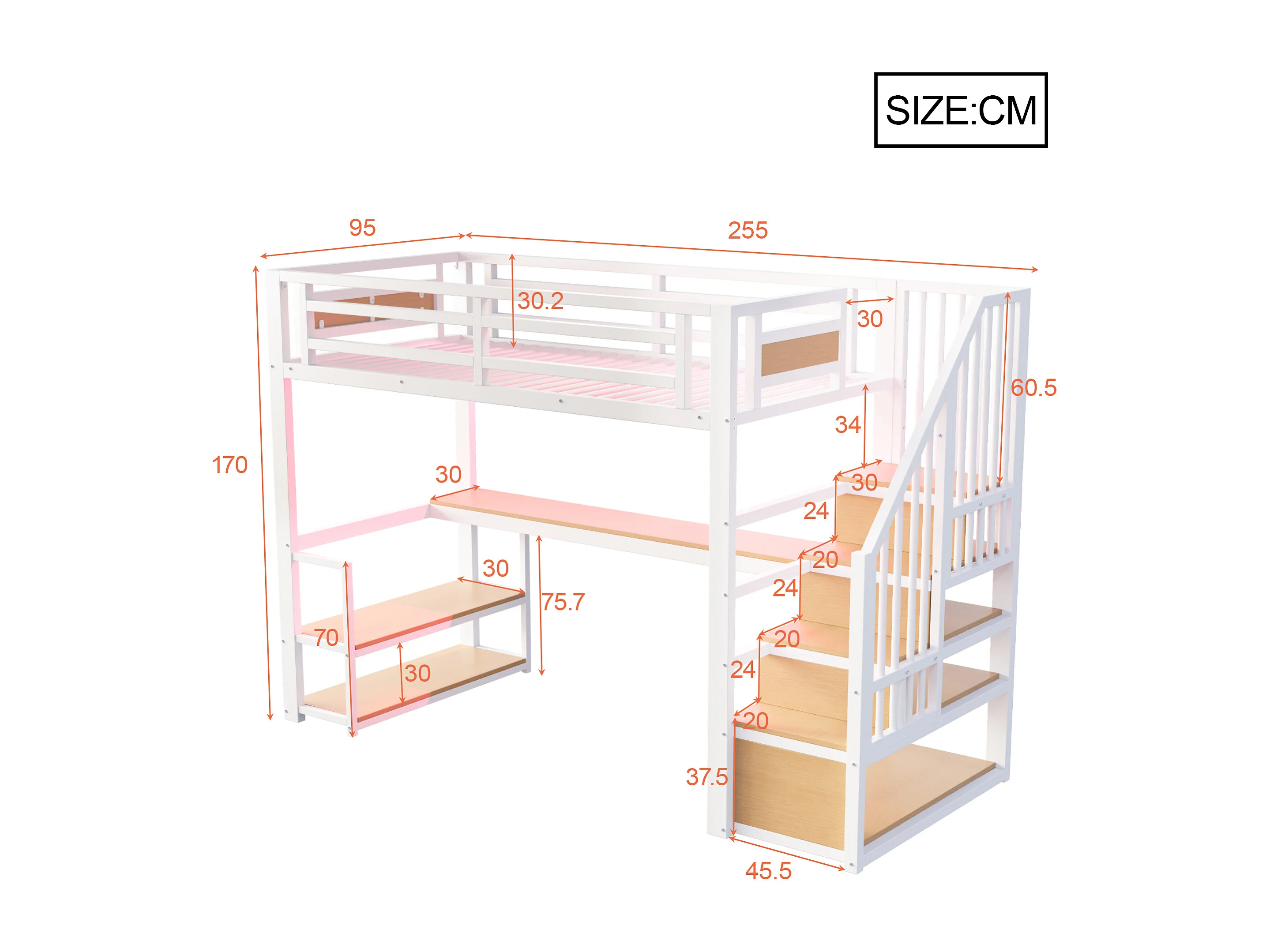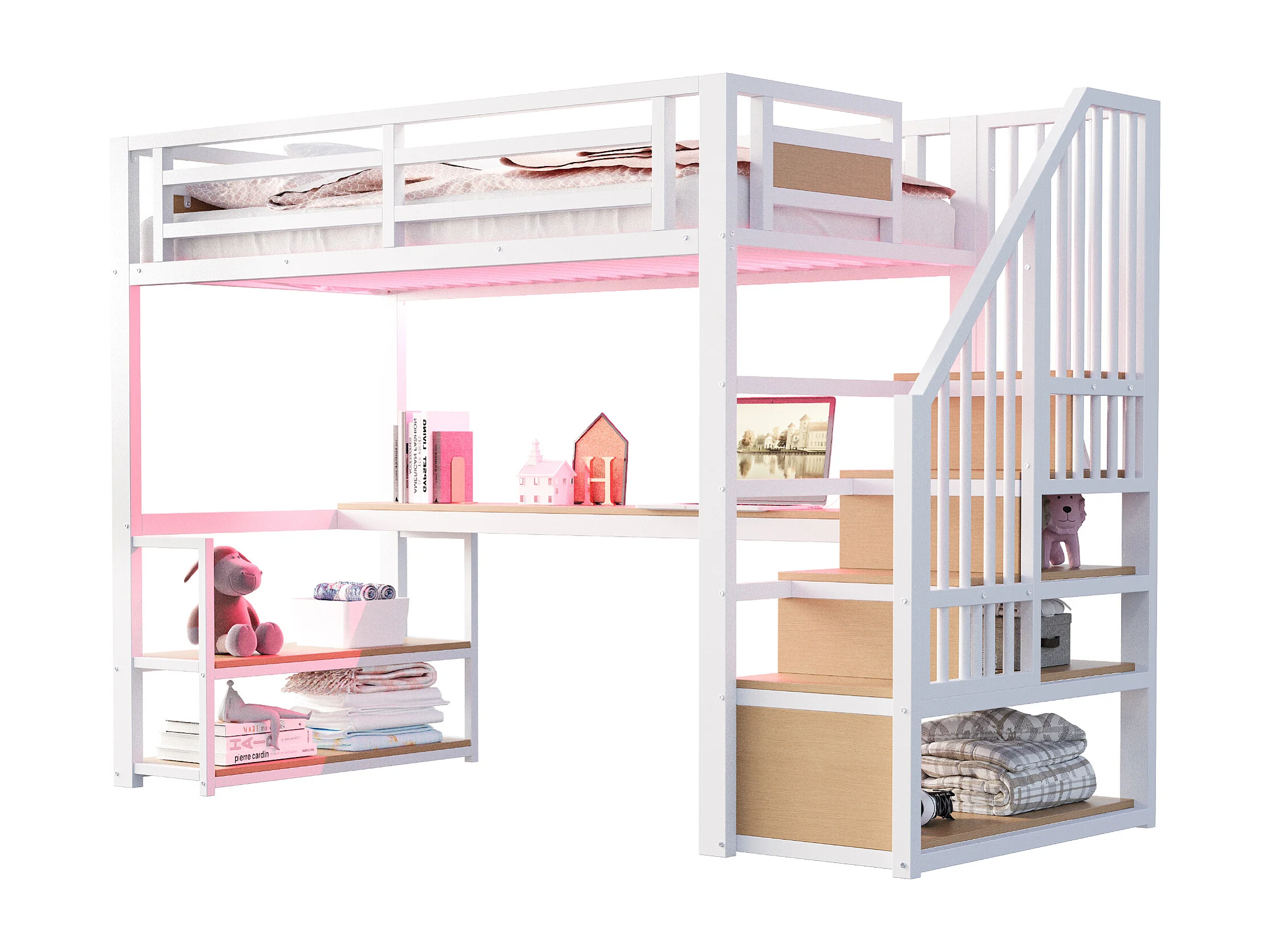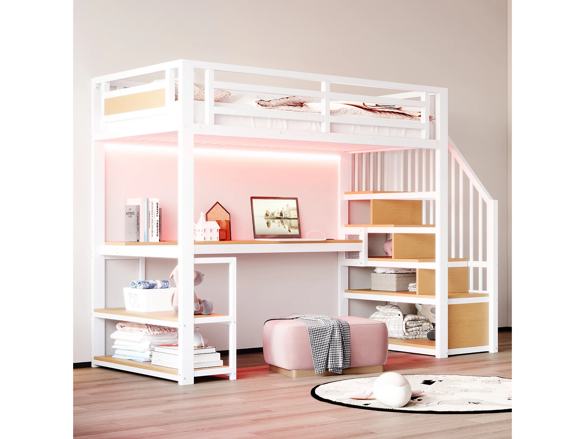 Lit mezzanine en métal pour enfant - 90 x 200 cm - avec Leds + prise + échelle de rangement + étagères + table - blanc