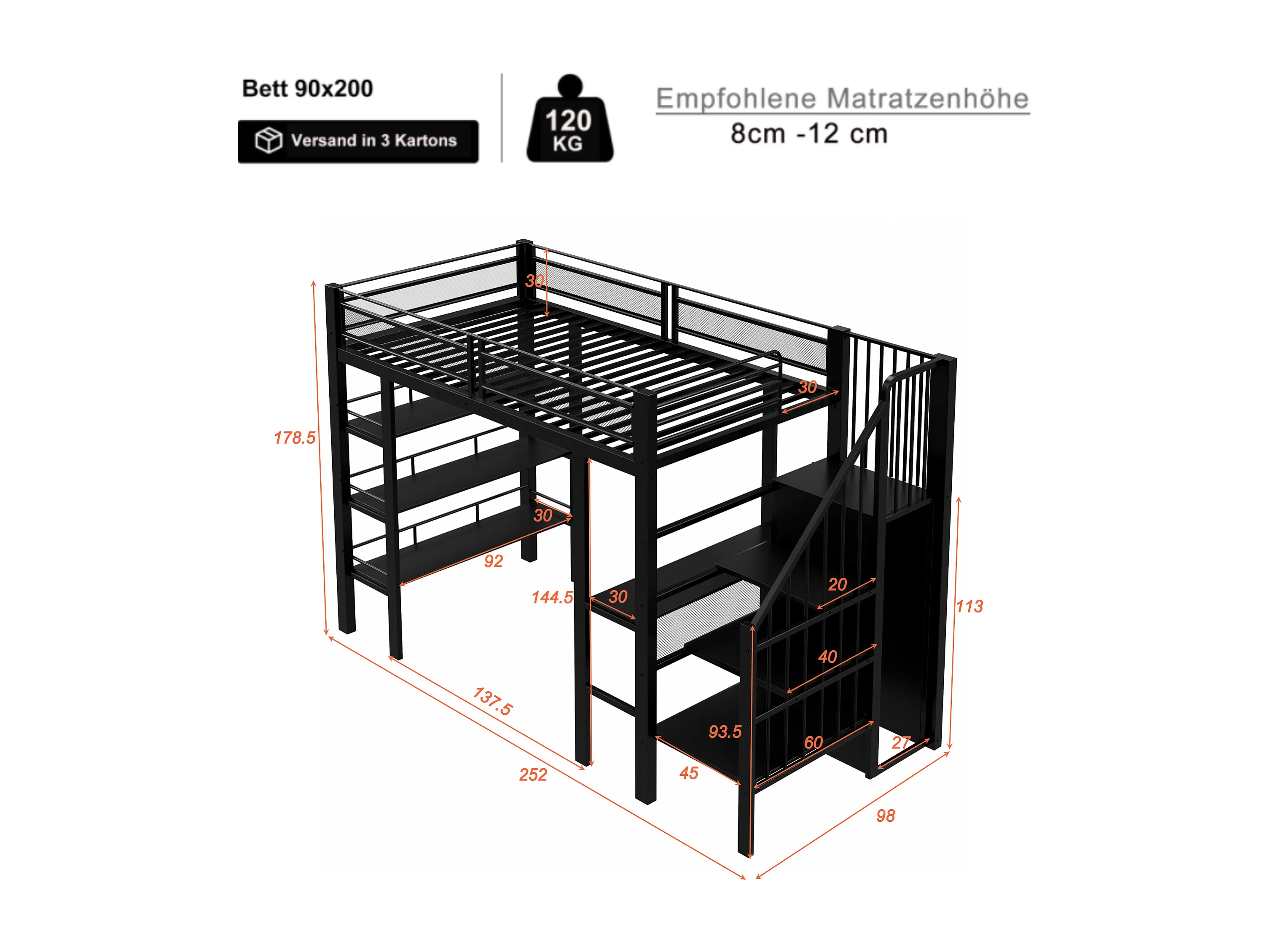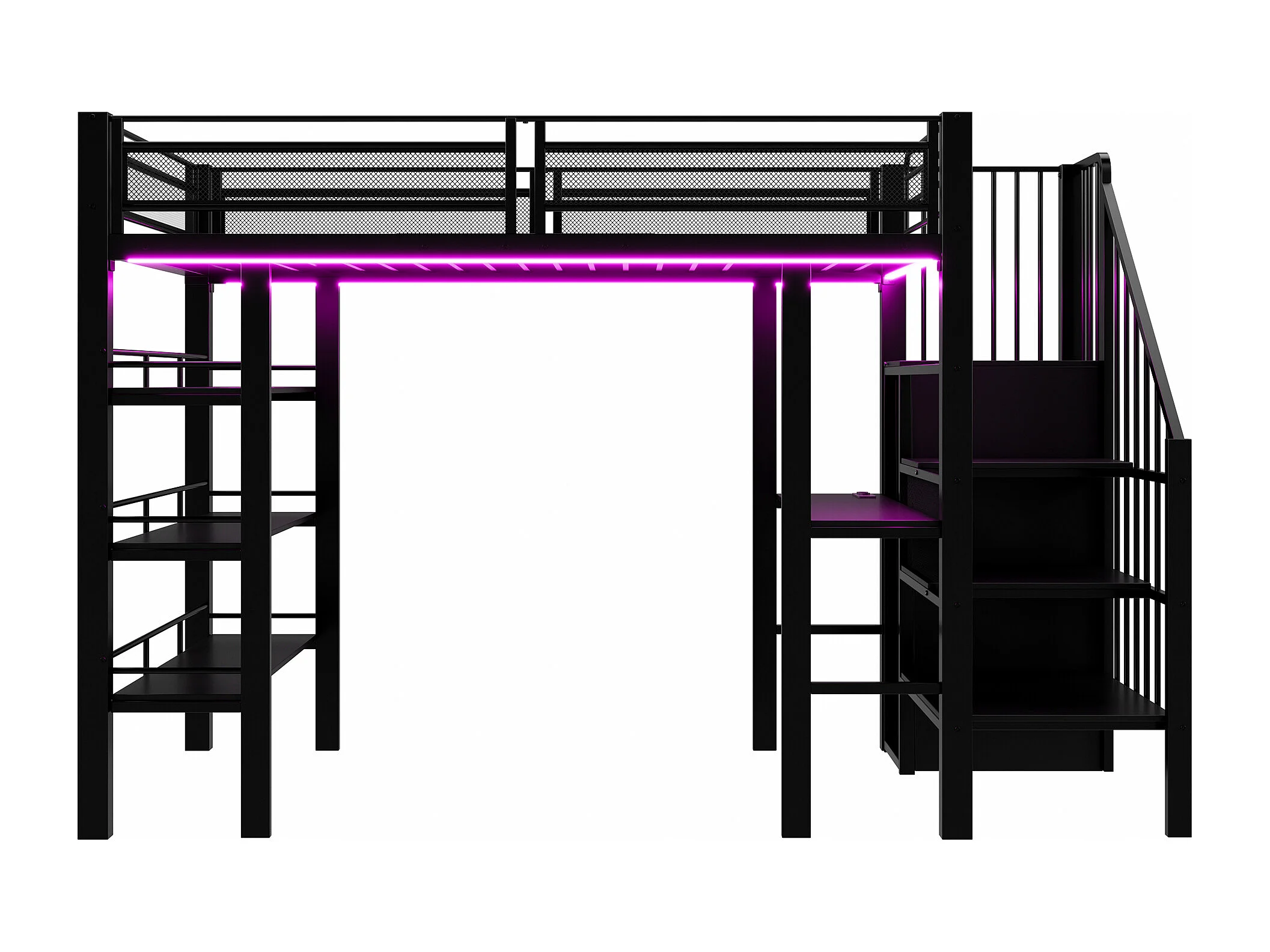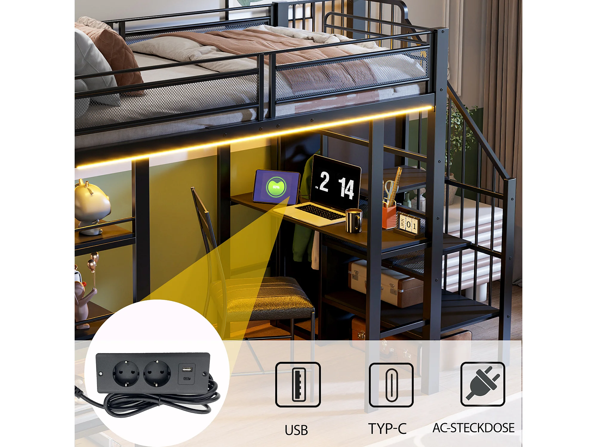 Lit mezzanine en métal pour enfant - 90 x 200 cm - avec Leds + prise + étagère de rangement + bureau - métal - noir