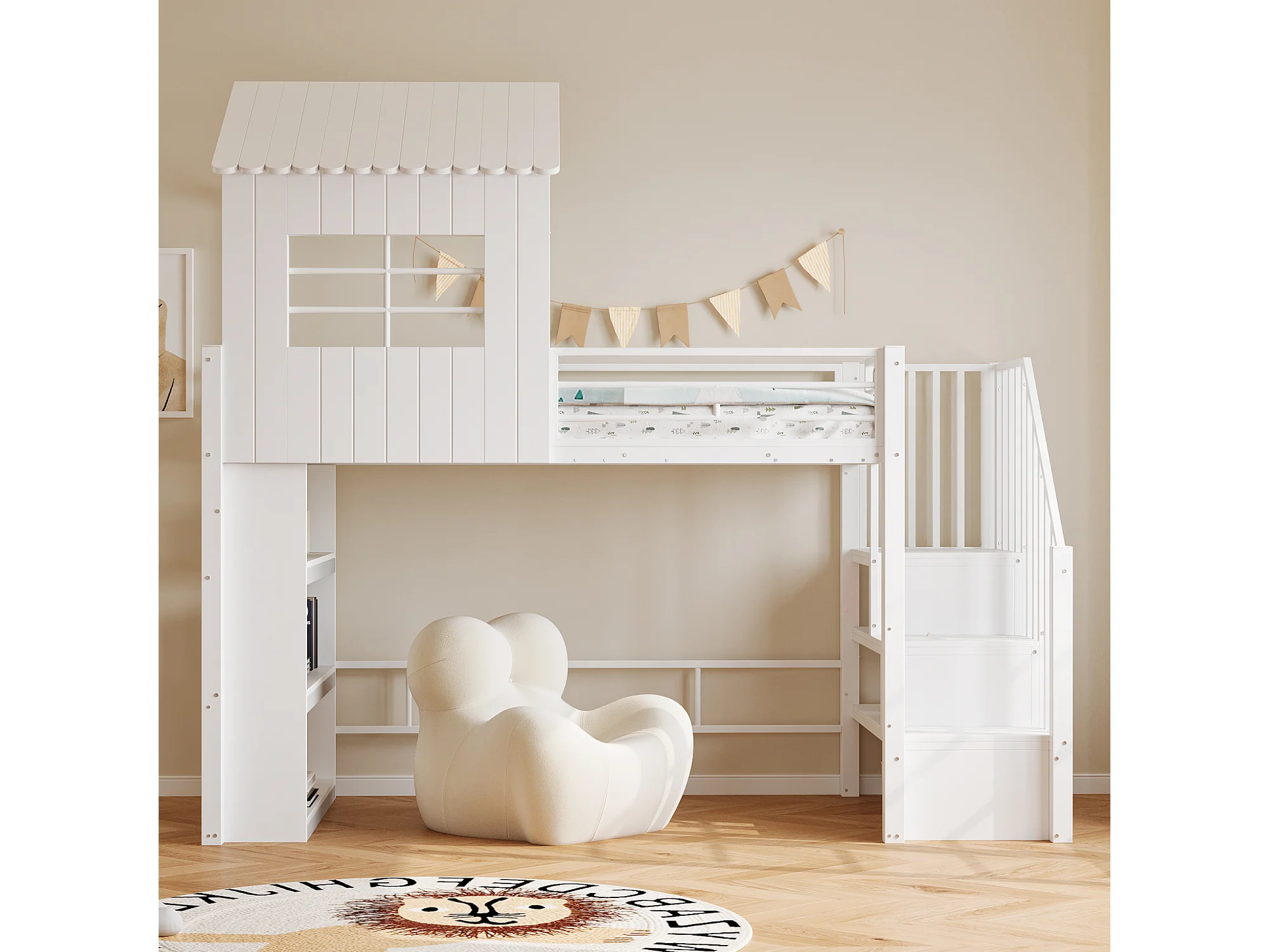 Lit mezzanine en métal pour enfant - 90 x 200 cm - style maison - avec étagère de rangement + escalier de rangement - MDF + métal - blanc