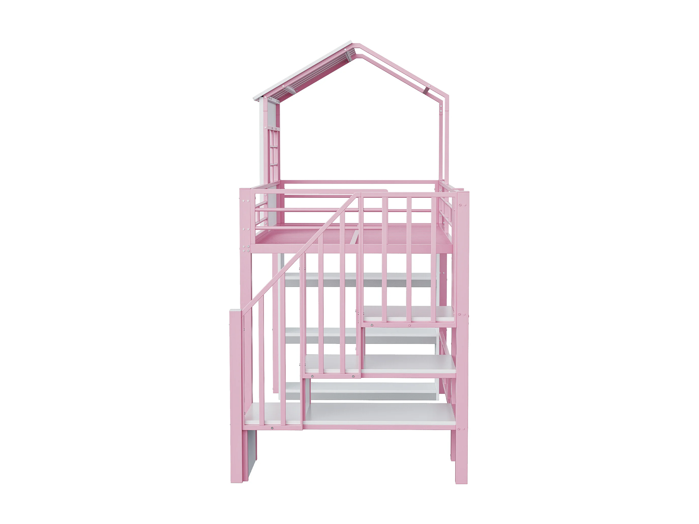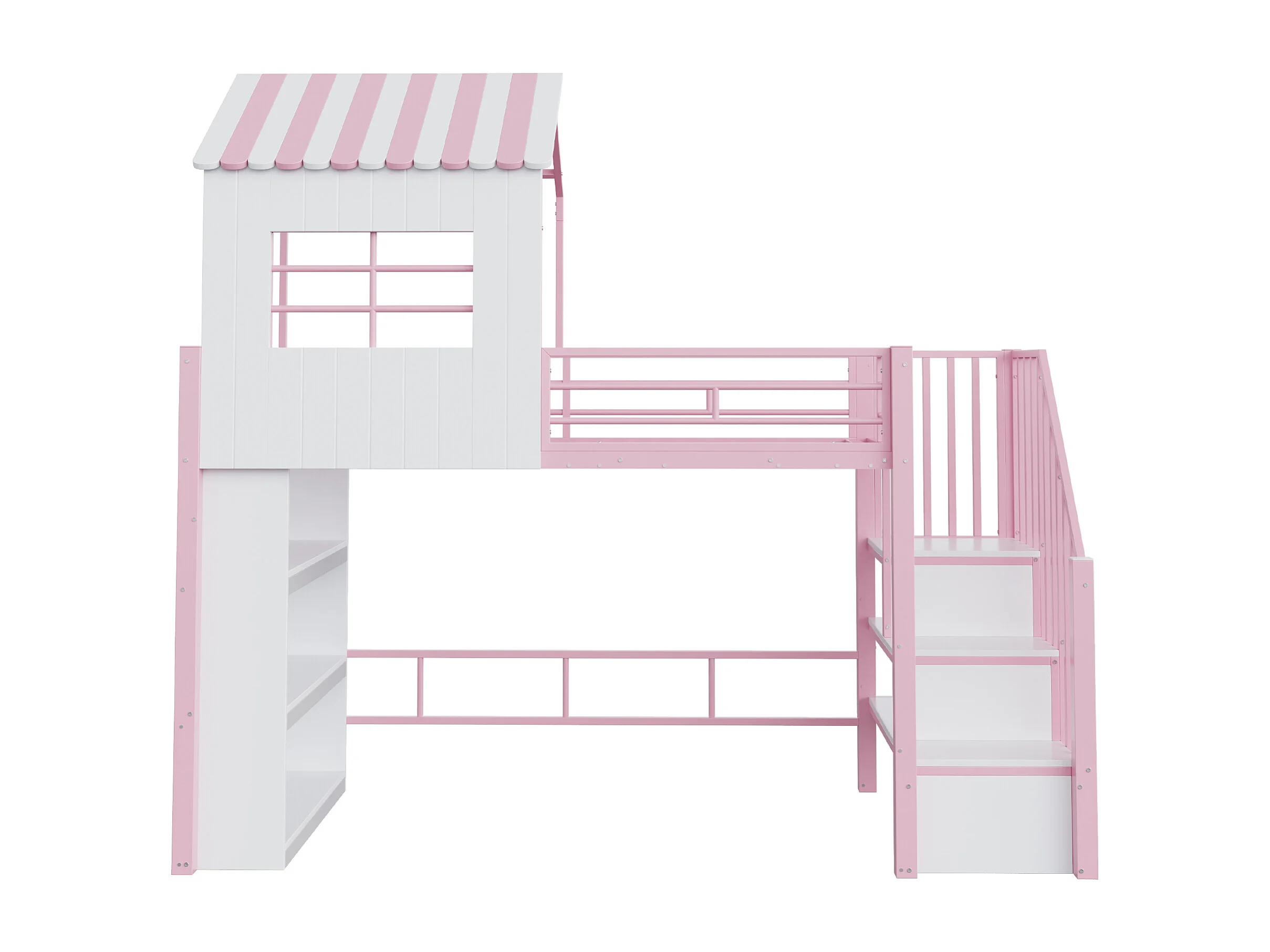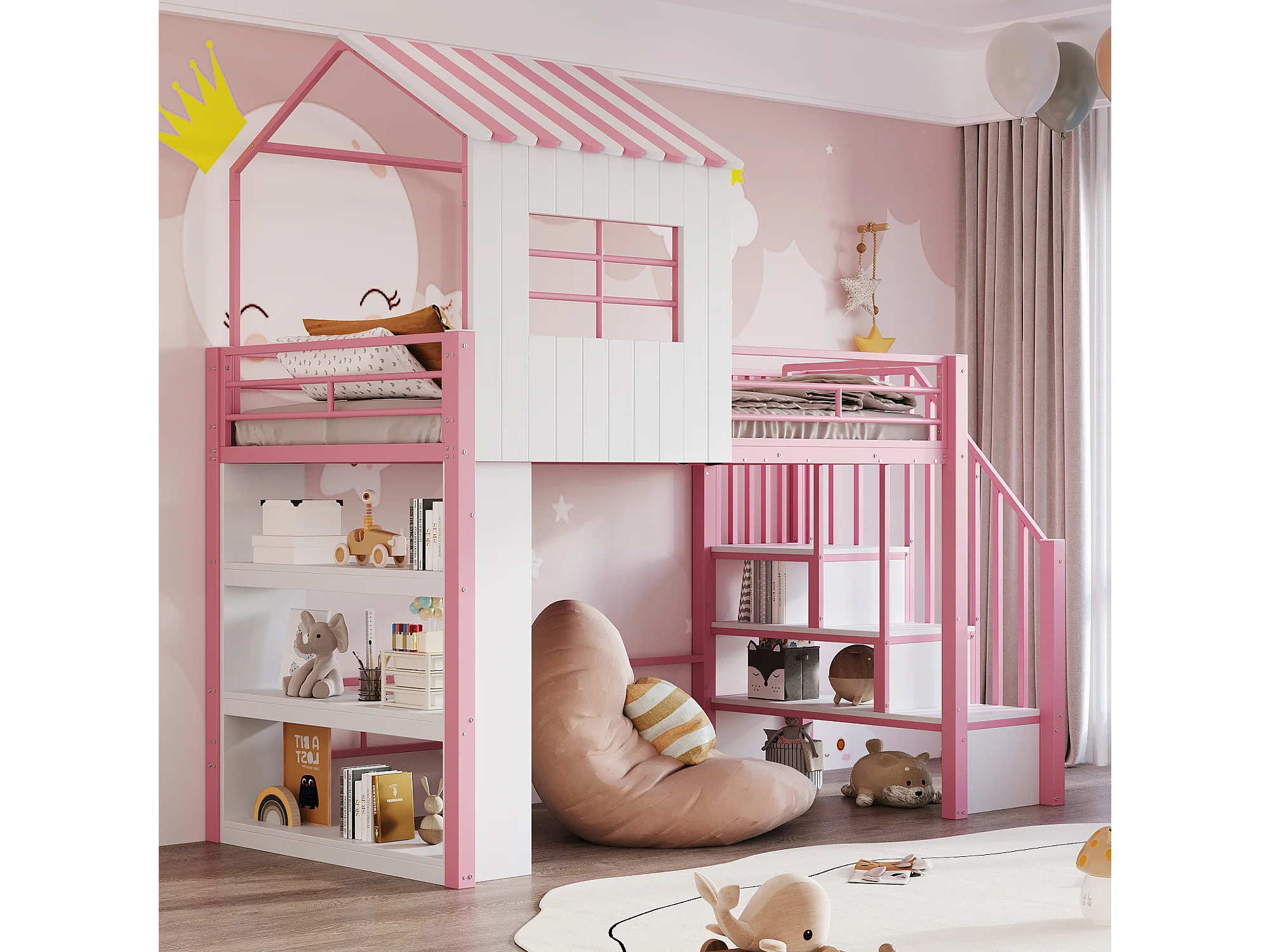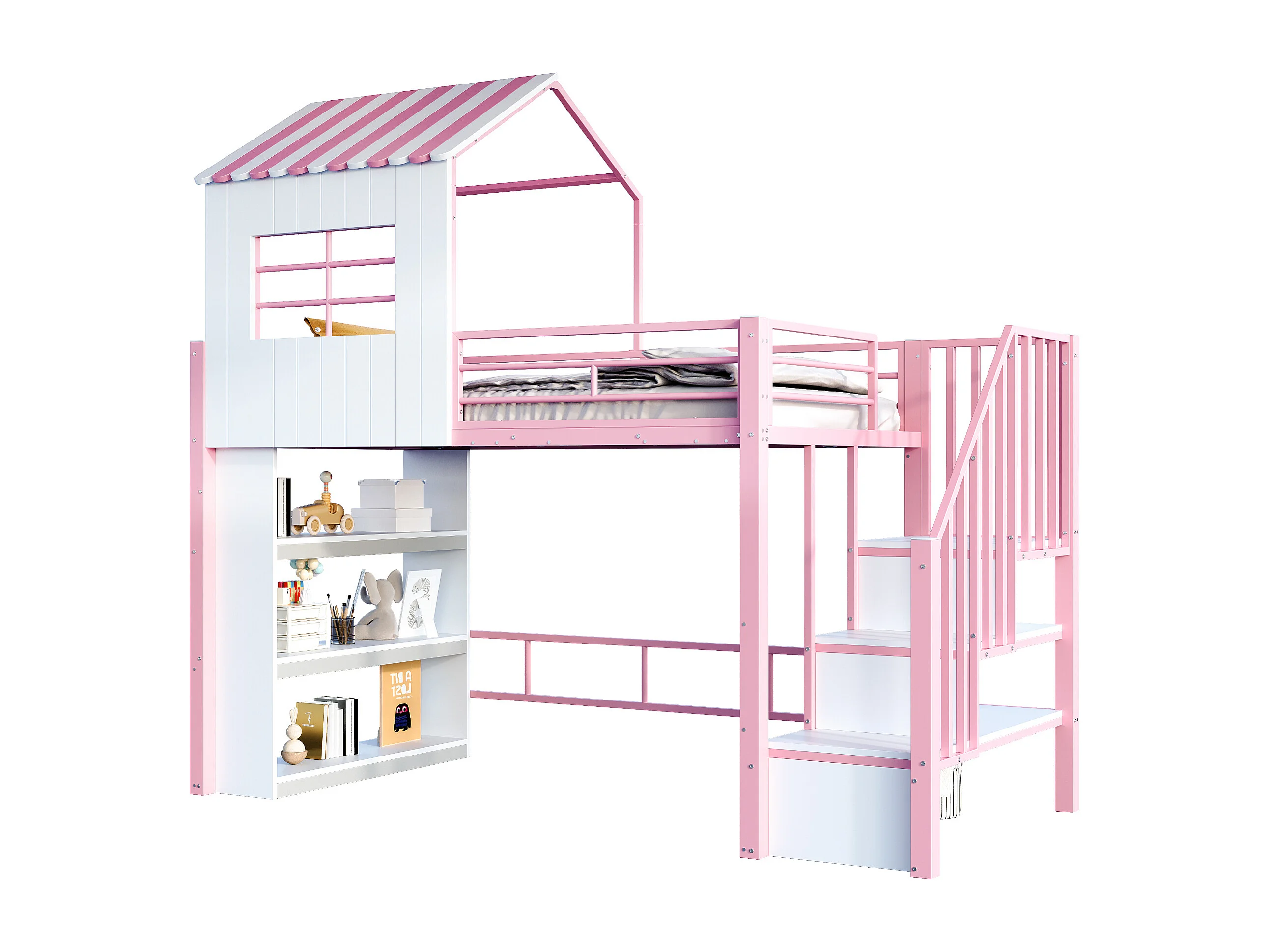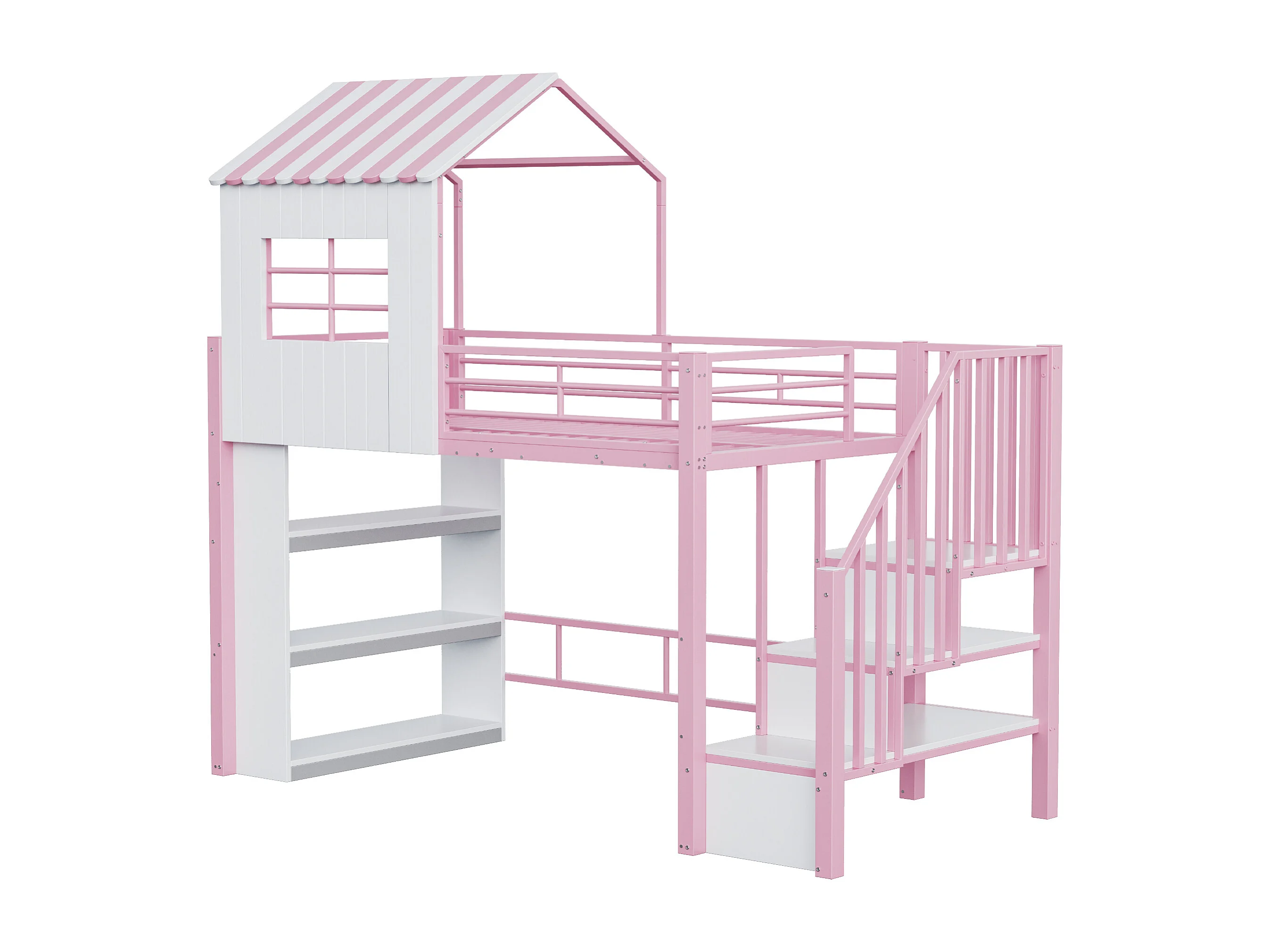 Lit mezzanine en métal pour enfant - 90 x 200 cm - style maison - avec étagère de rangement + escalier de rangement - MDF + métal - rose