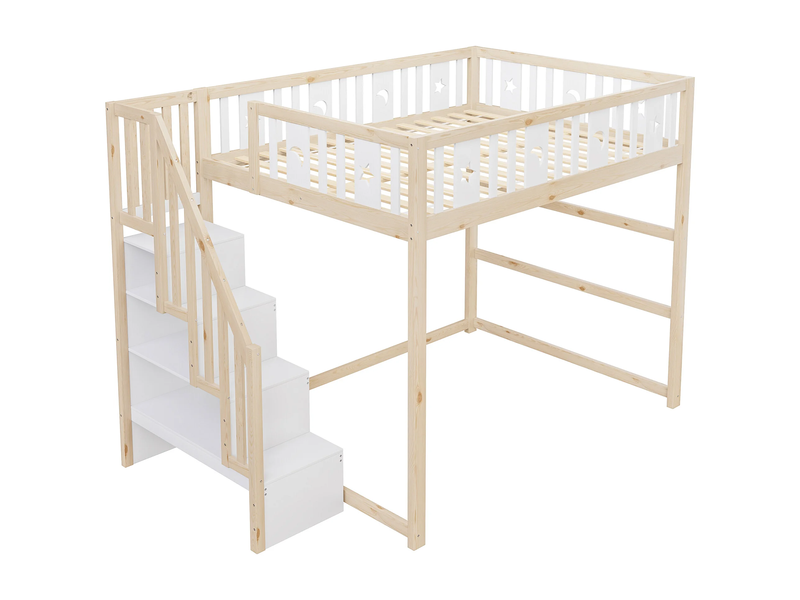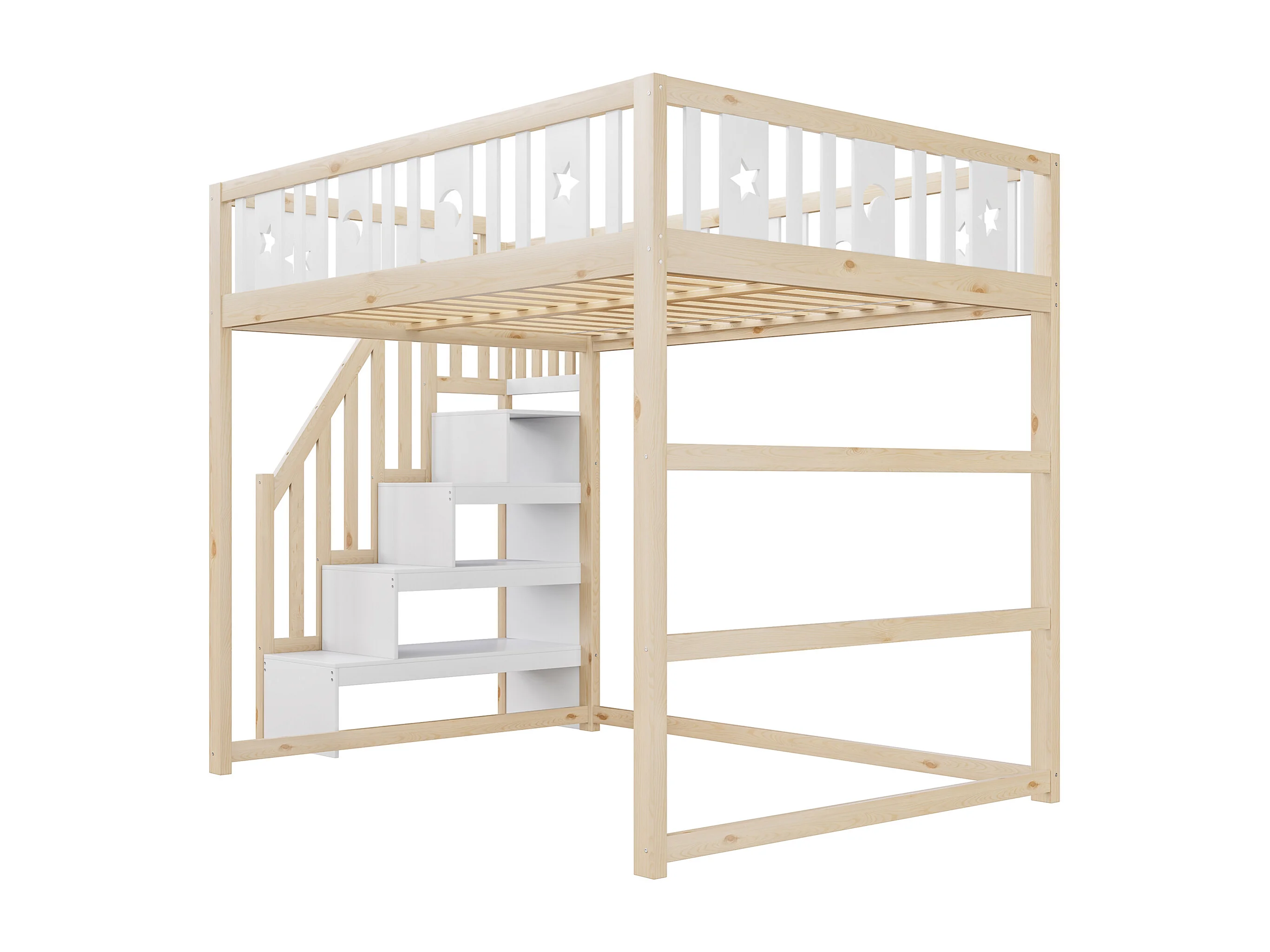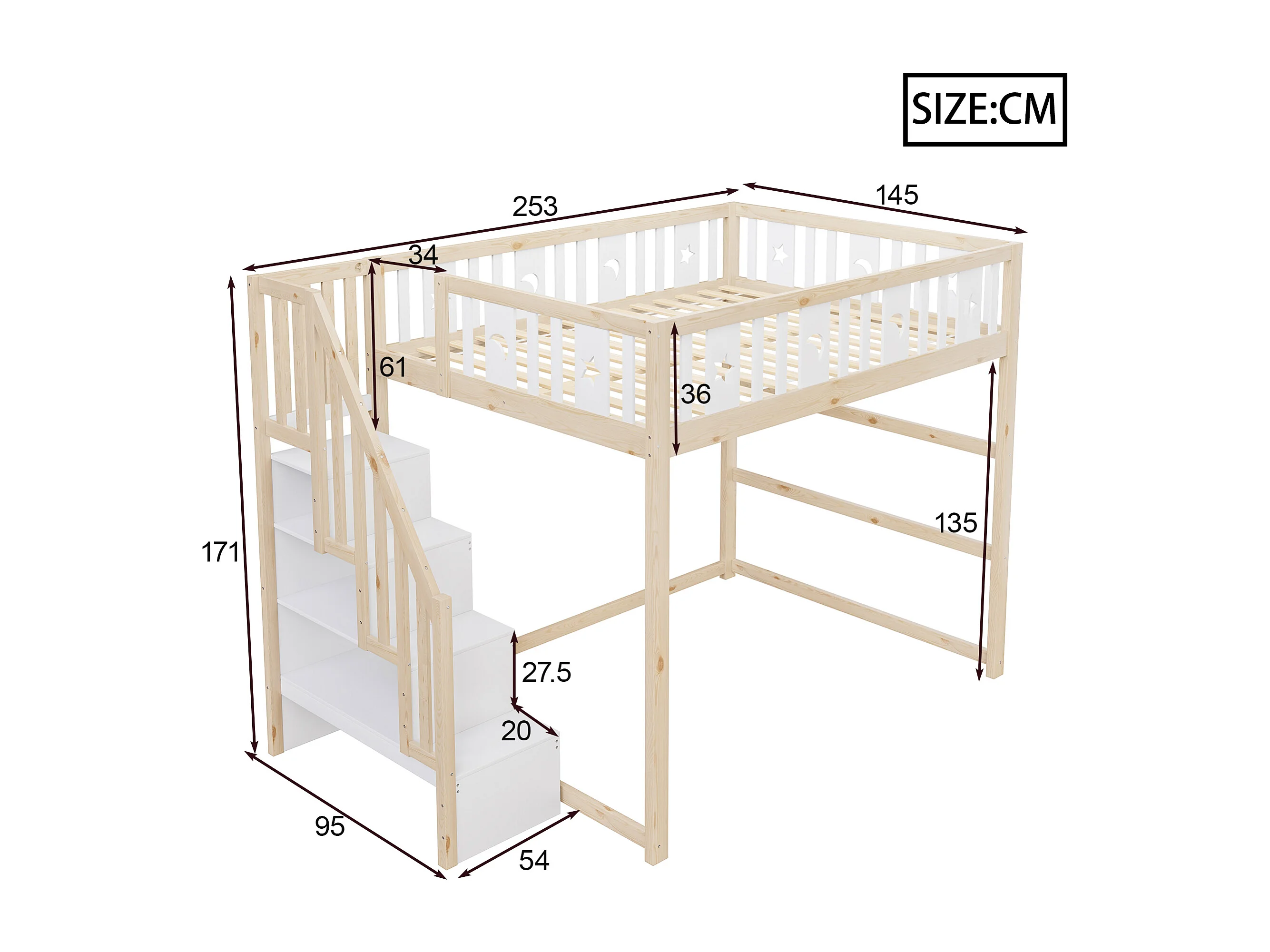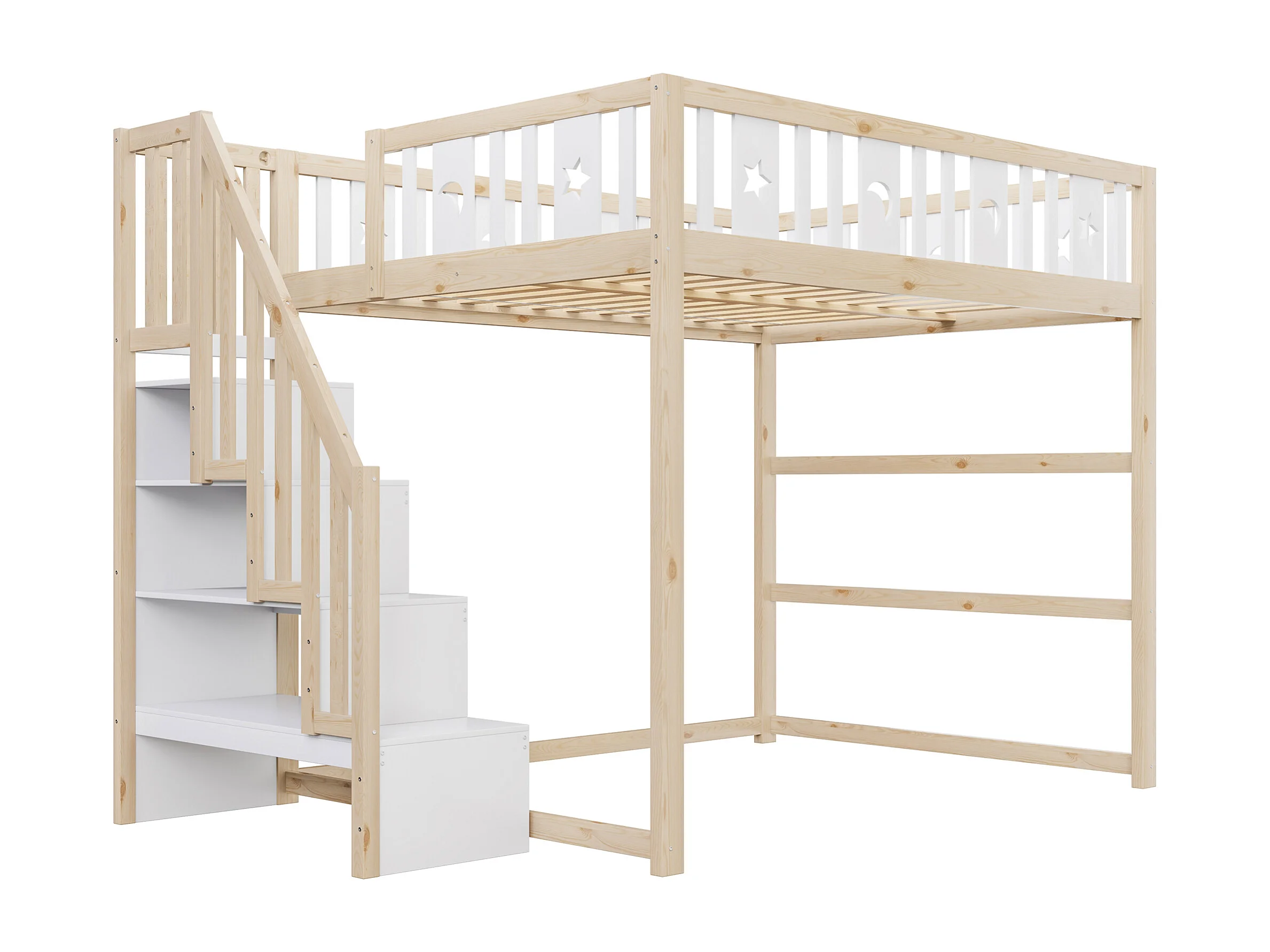 Lit mezzanine enfant - 140 x 200 - avec rangement dans l'escalier + barrière de sécurité - bois + MDF - blanc + naturel