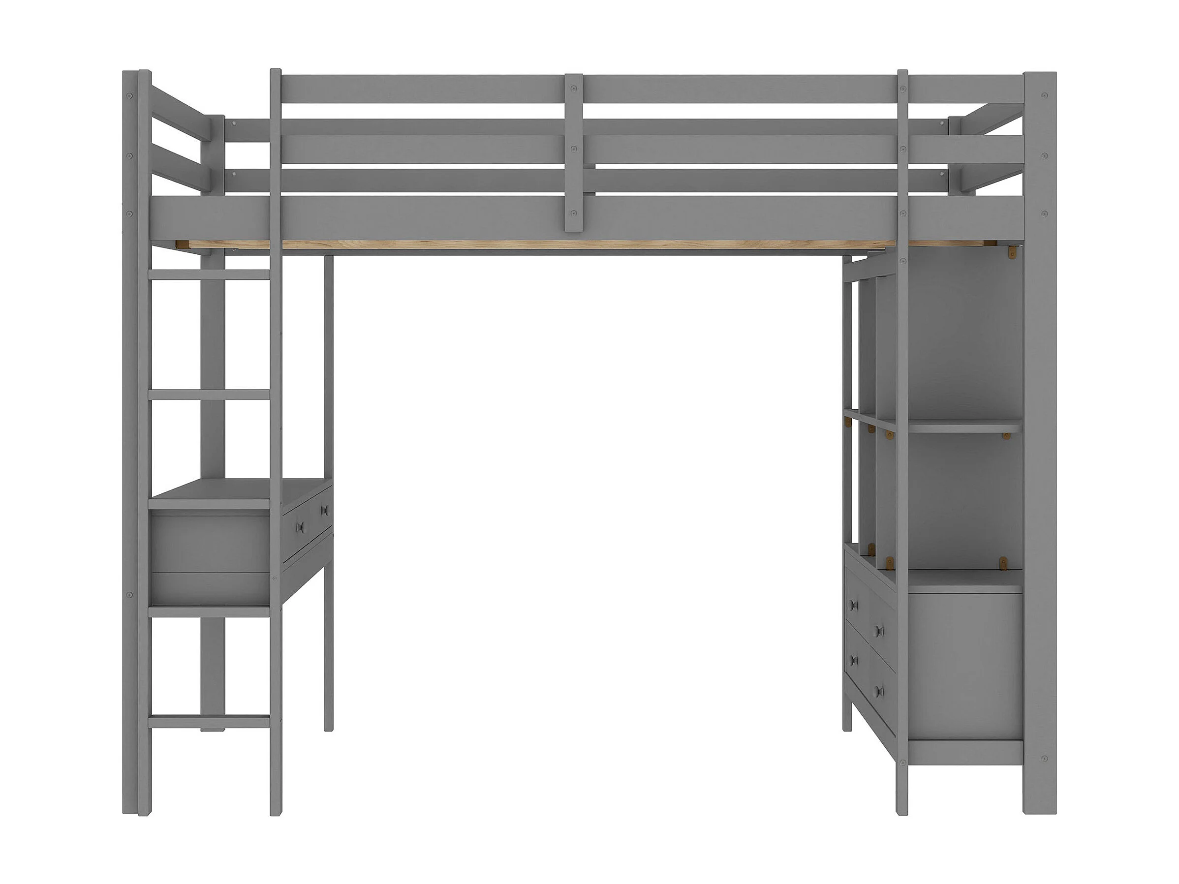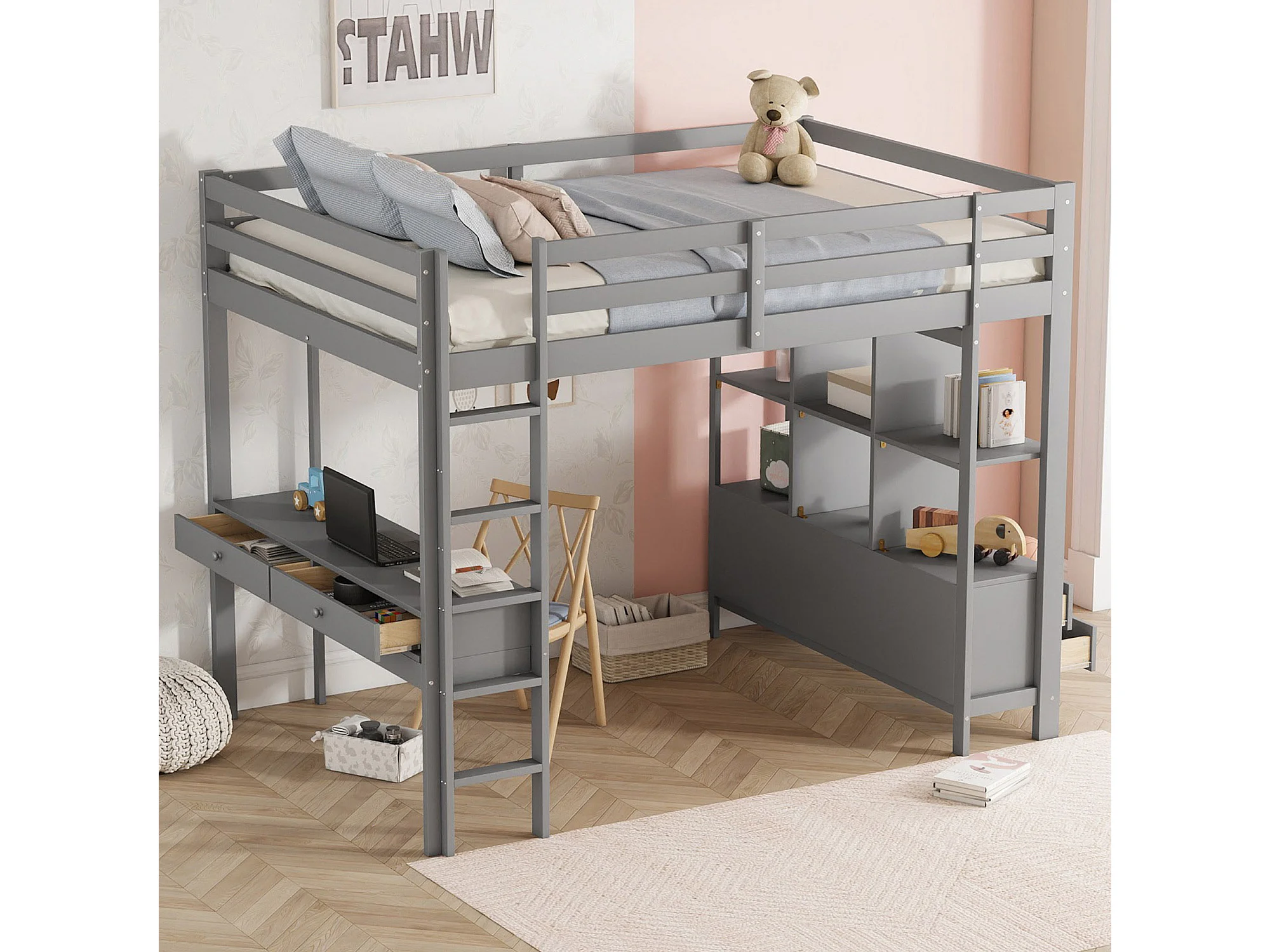 Lit mezzanine enfant 140 x 200 cm avec 6 tiroirs de rangement et bureau -Bois en pin et MDF gris - sans matelas