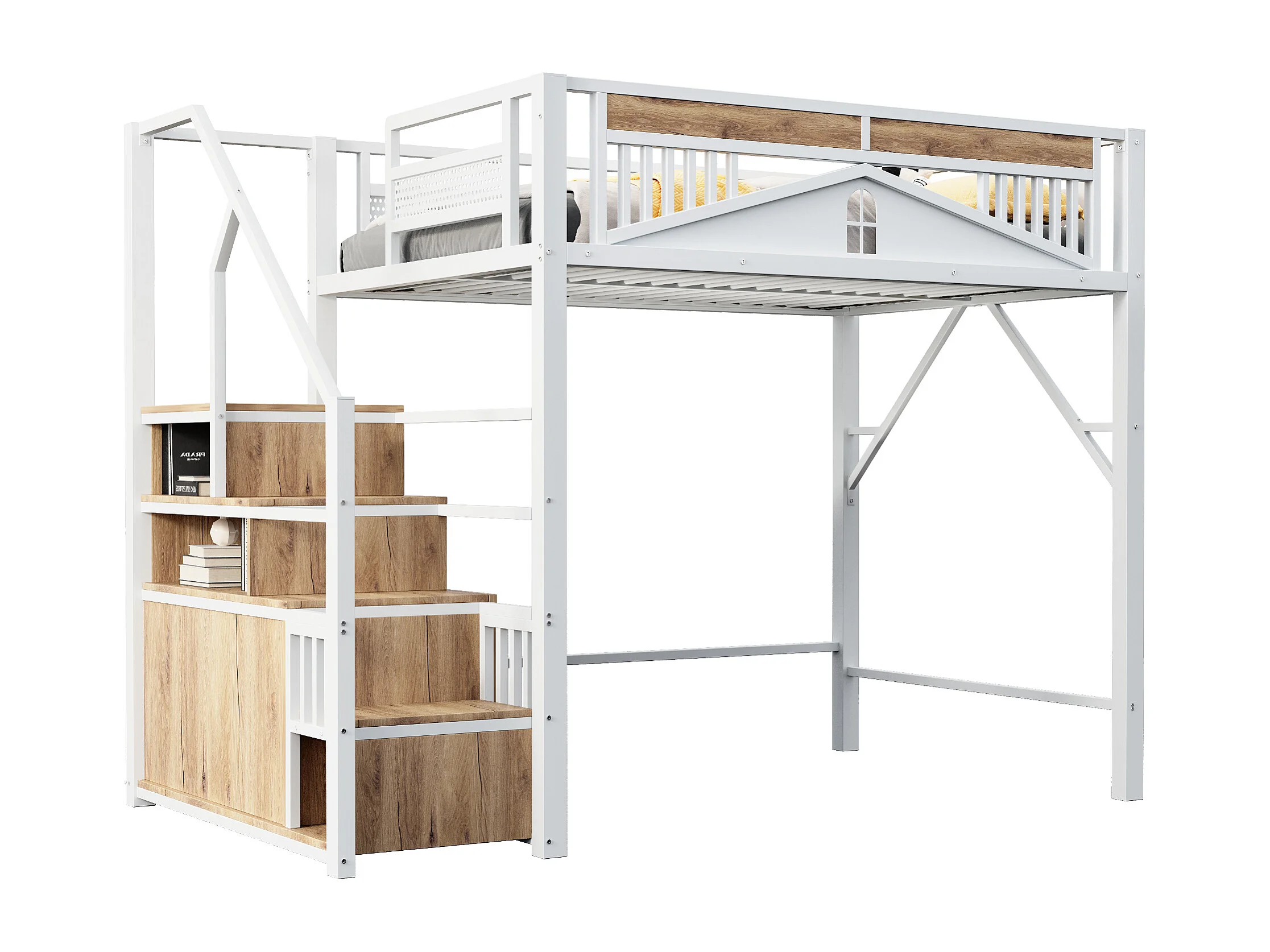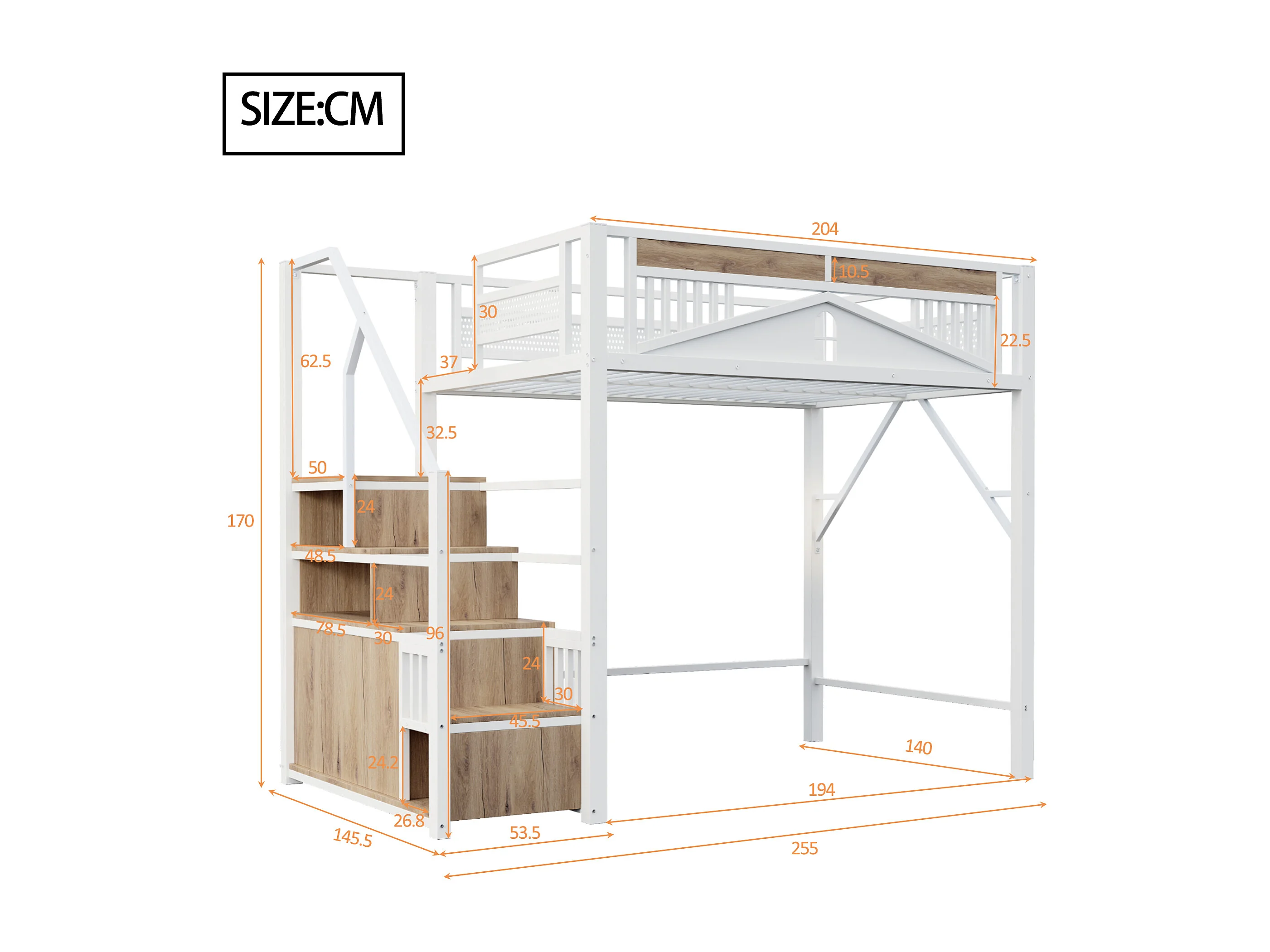 Lit mezzanine enfant 140 x 200 cm avec escalier de rangement et rambarde de sécurité - Lit blanc en métal et bois