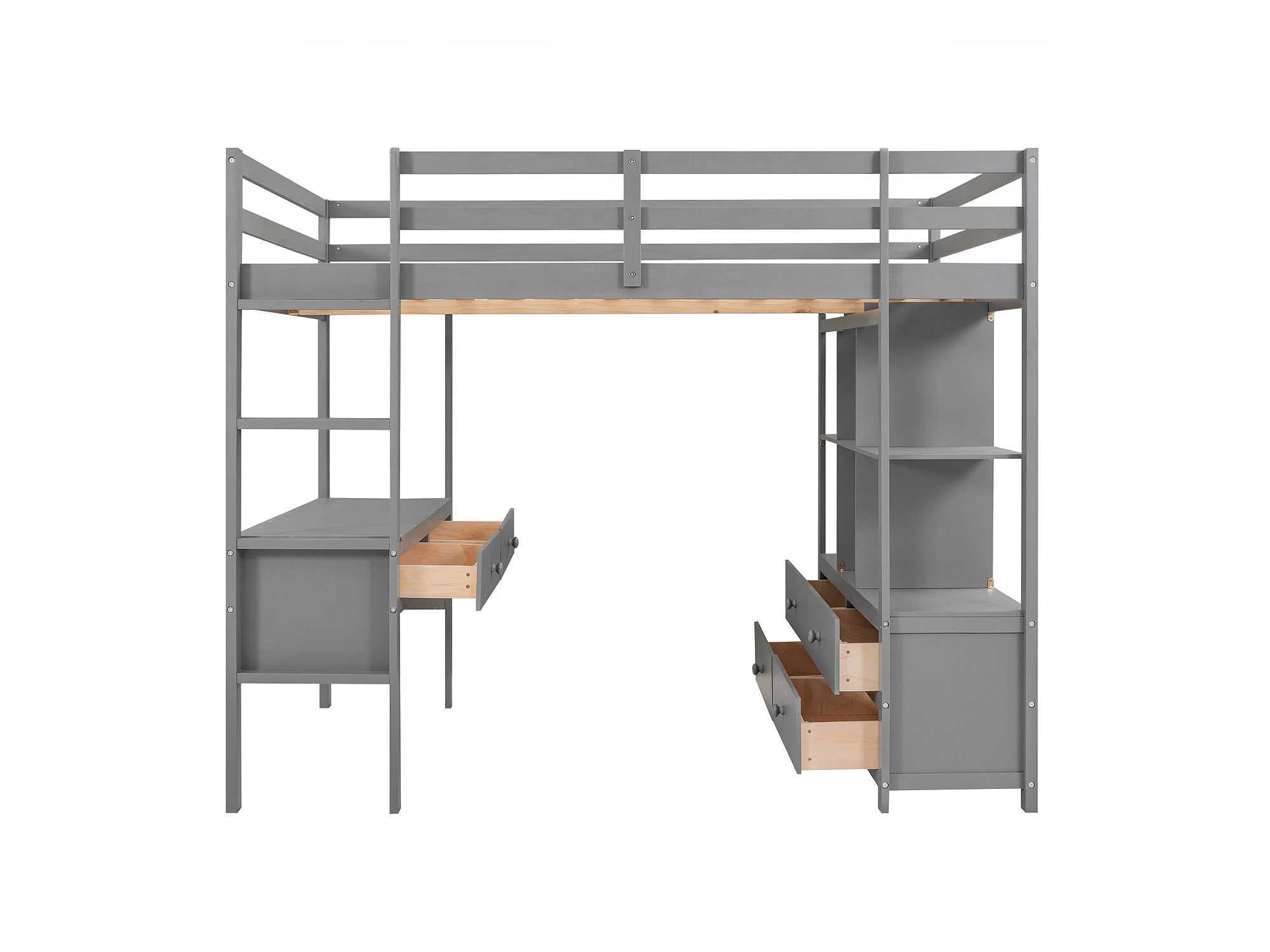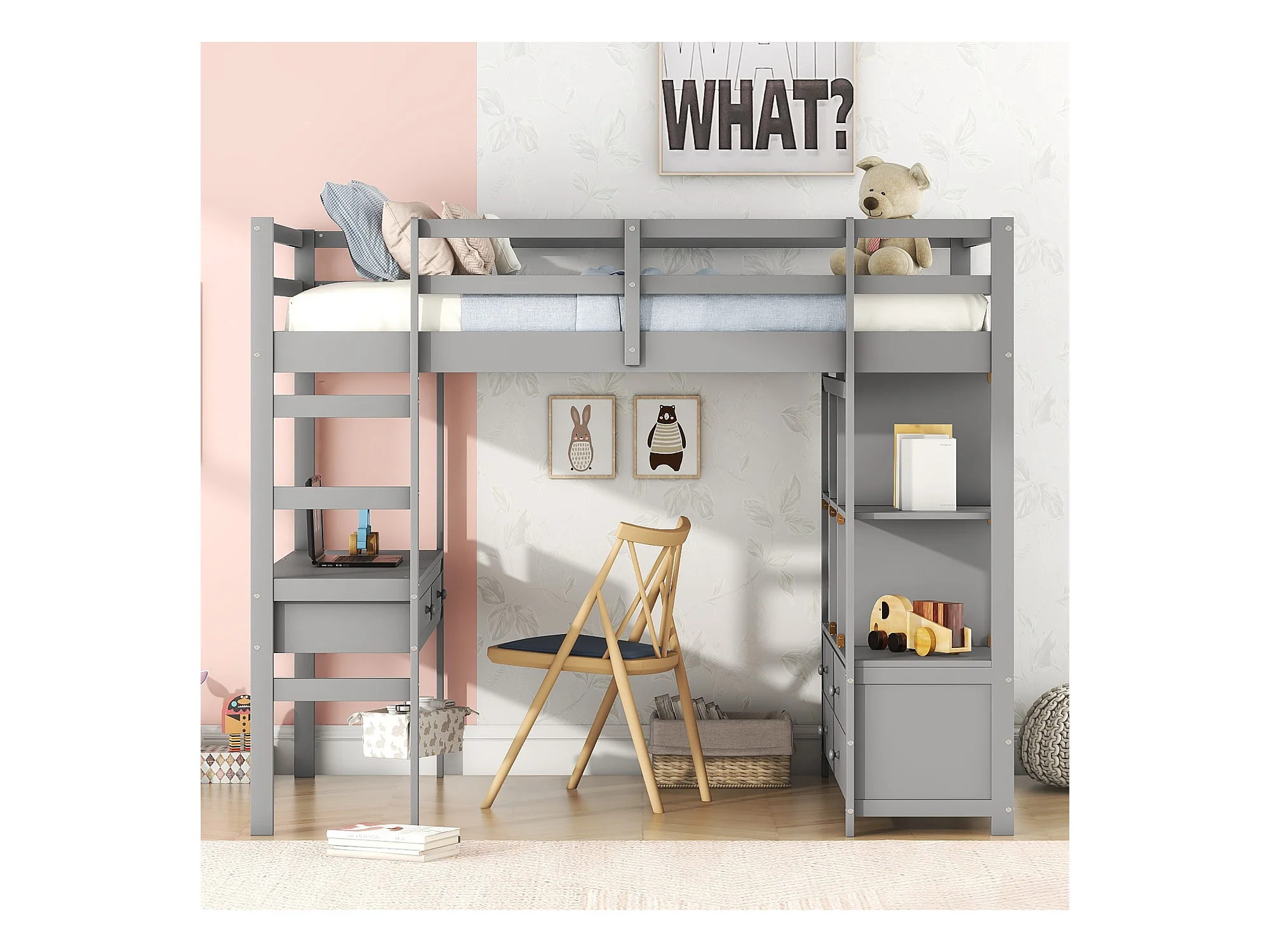 Lit mezzanine enfant 140 x 200 cm avec tiroirs et bureau - Bois de pin - Sommier à lattes - Gris