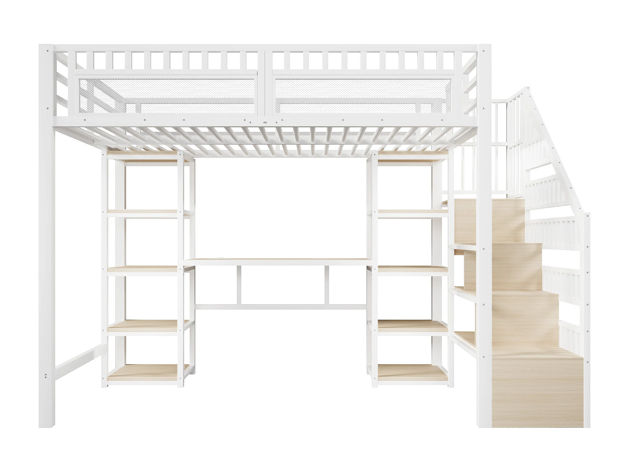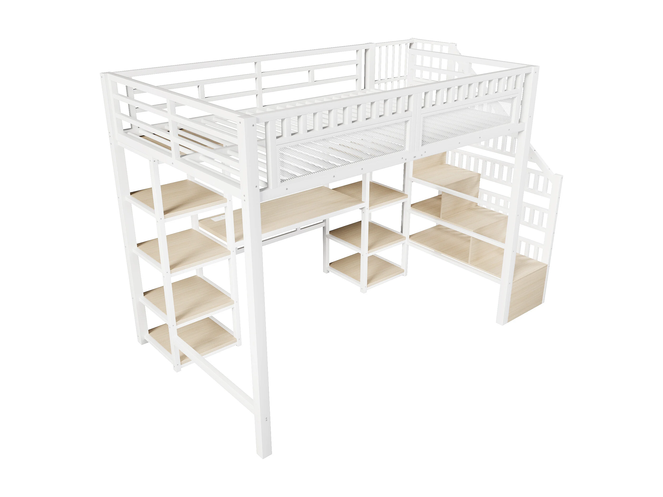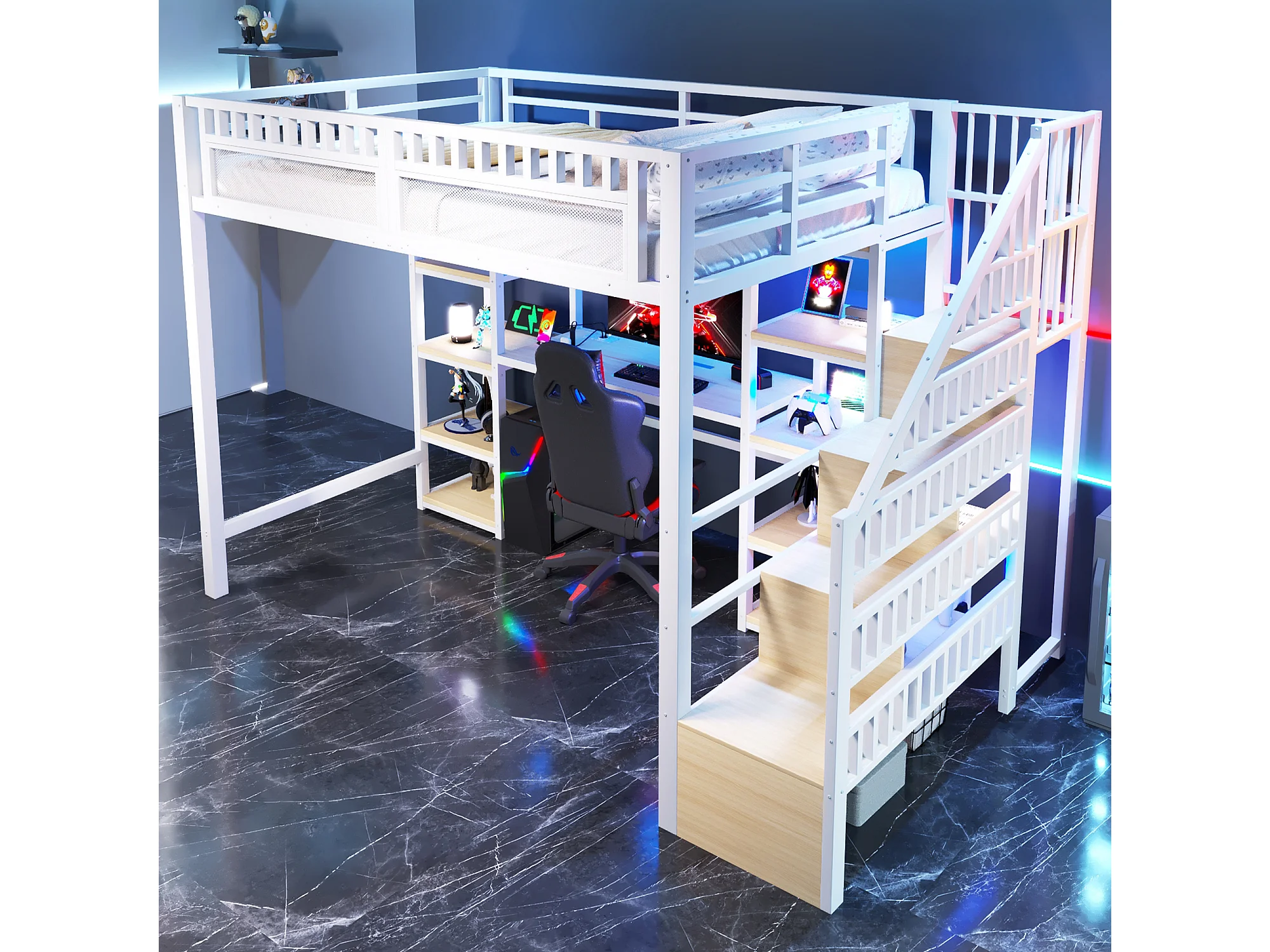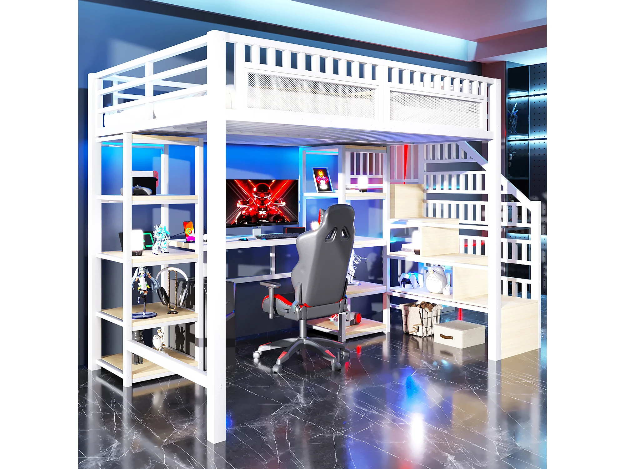 Lit mezzanine enfant - 140 x 200 cm - structure en fer - avec bureau + Leds + USB + étagère + eacalier de rangement - métal - blanc