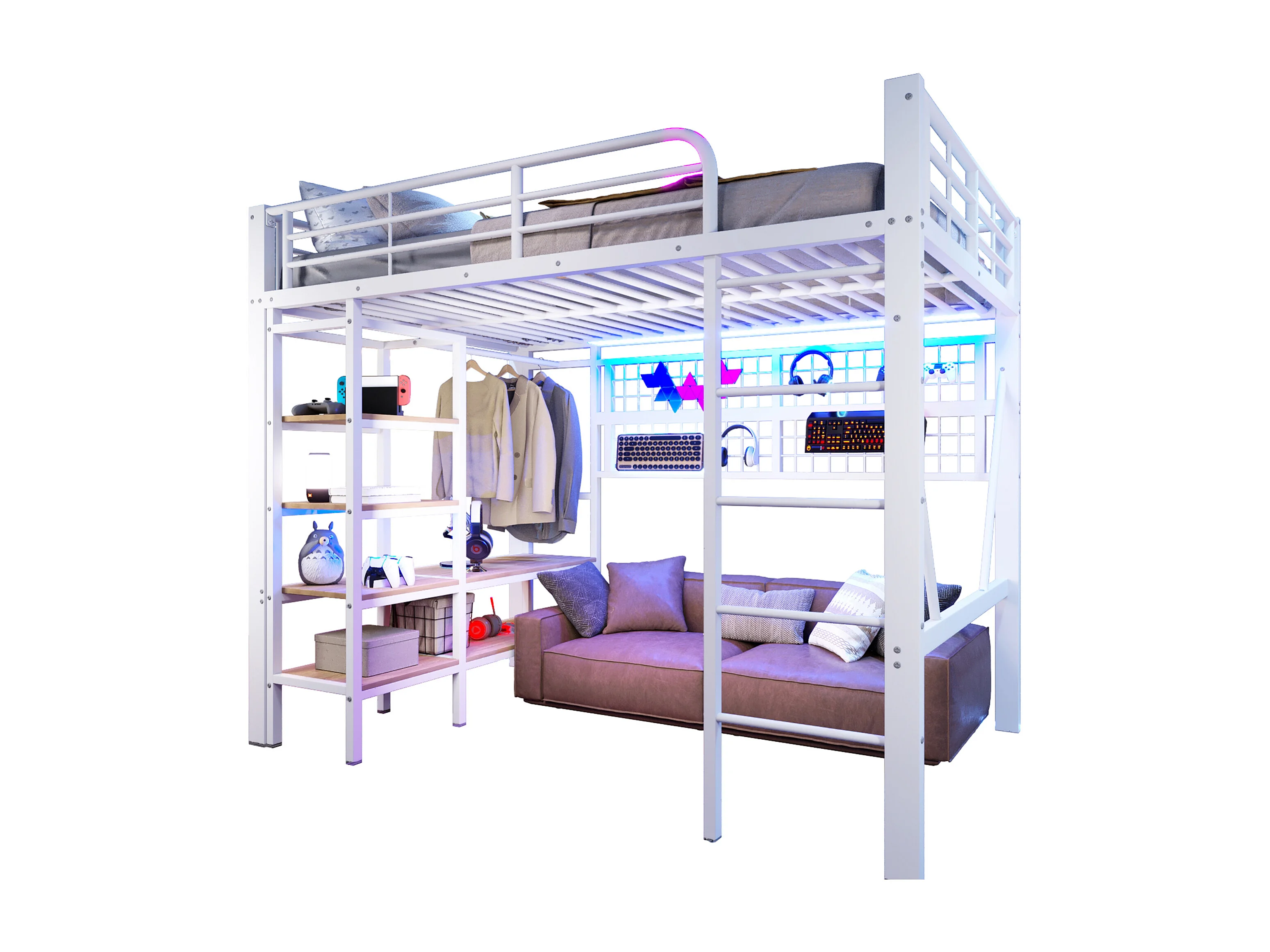 Lit mezzanine enfant - 140 x 200 cm - structure en fer - avec étagère de rangement + tringle à vêtements + Leds - métal - blanc