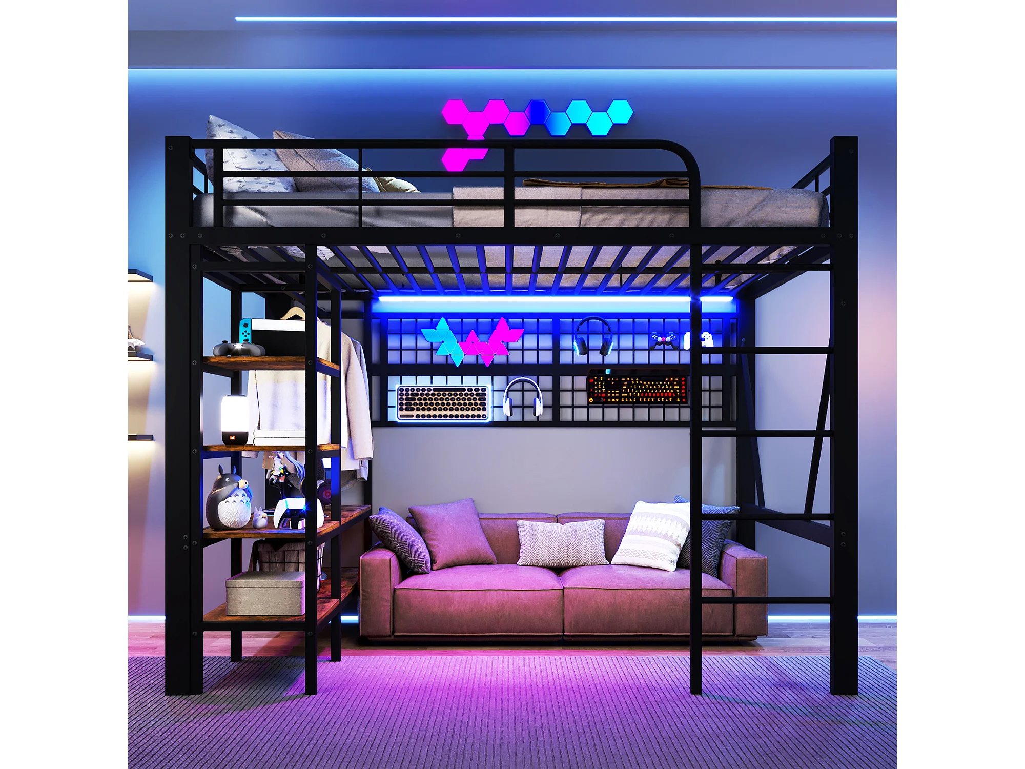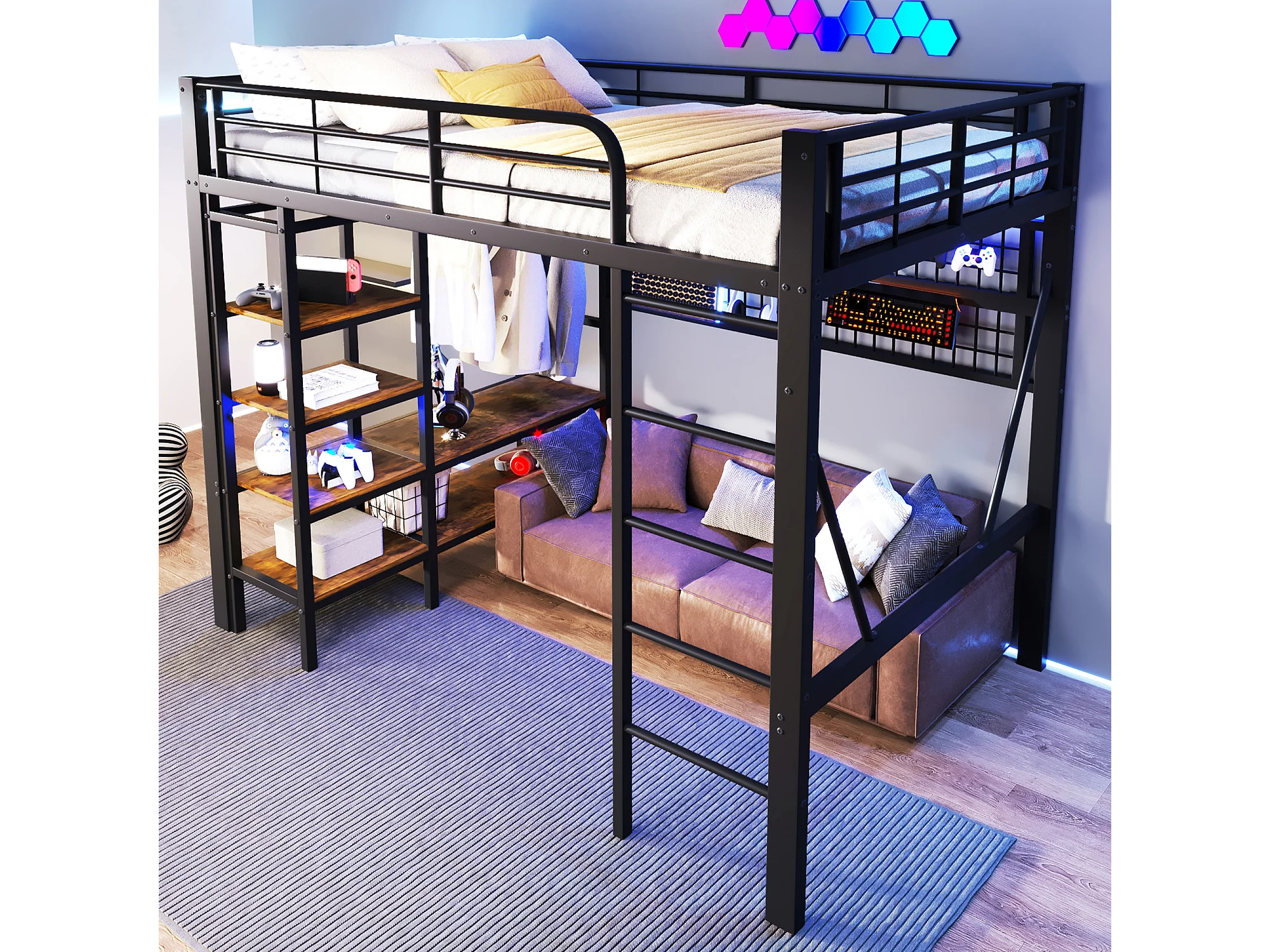 Lit mezzanine enfant - 140 x 200 cm - structure en fer - avec étagère de rangement + tringle à vêtements + Leds - métal - noir