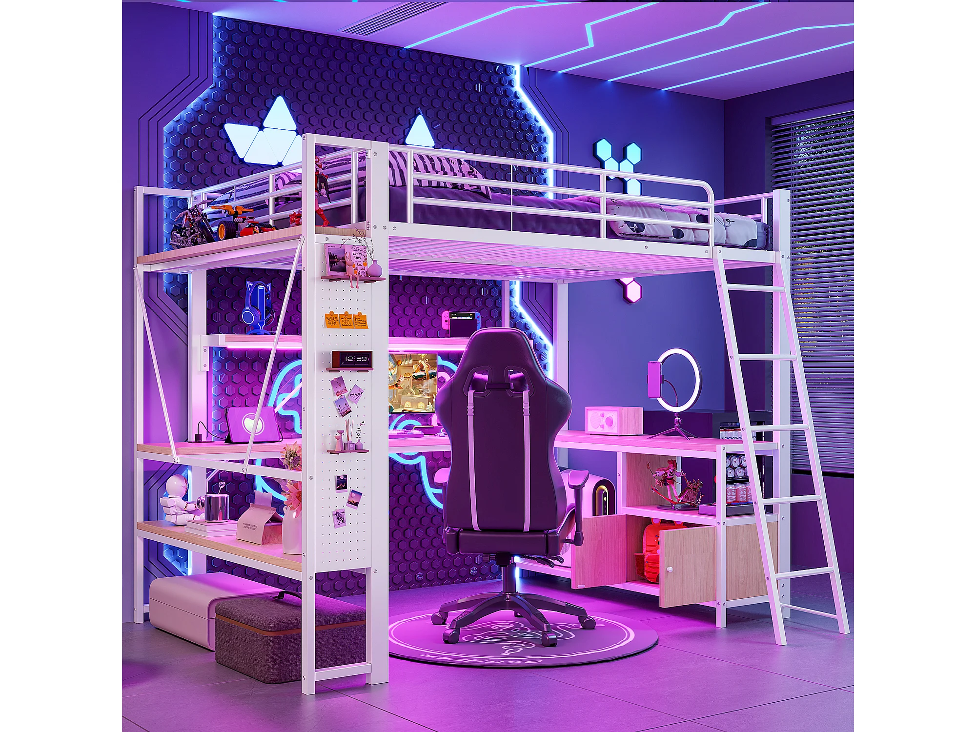 Lit mezzanine enfant - 140 x 200 cm - structure en fer - avec Leds + bureau + étagère de rangement + USB - métal - blanc